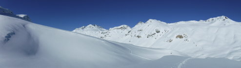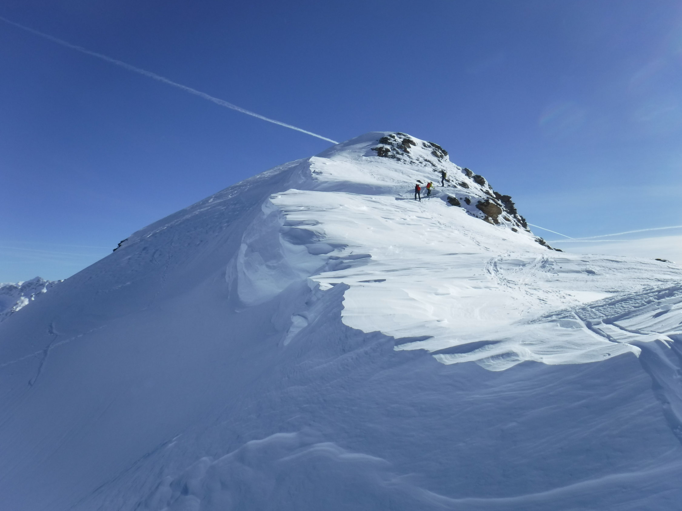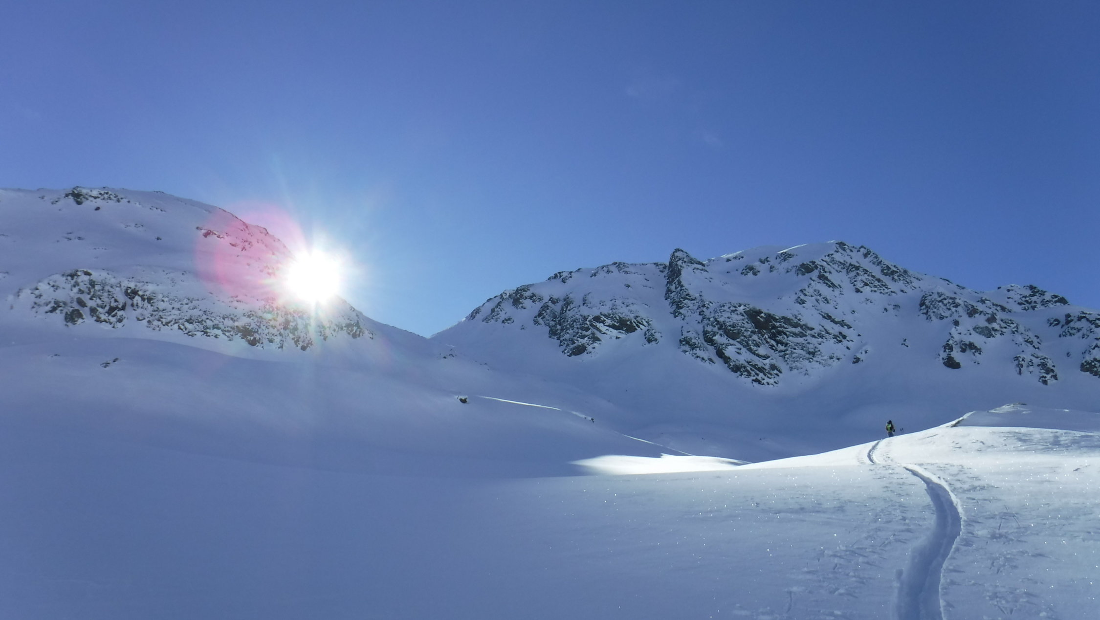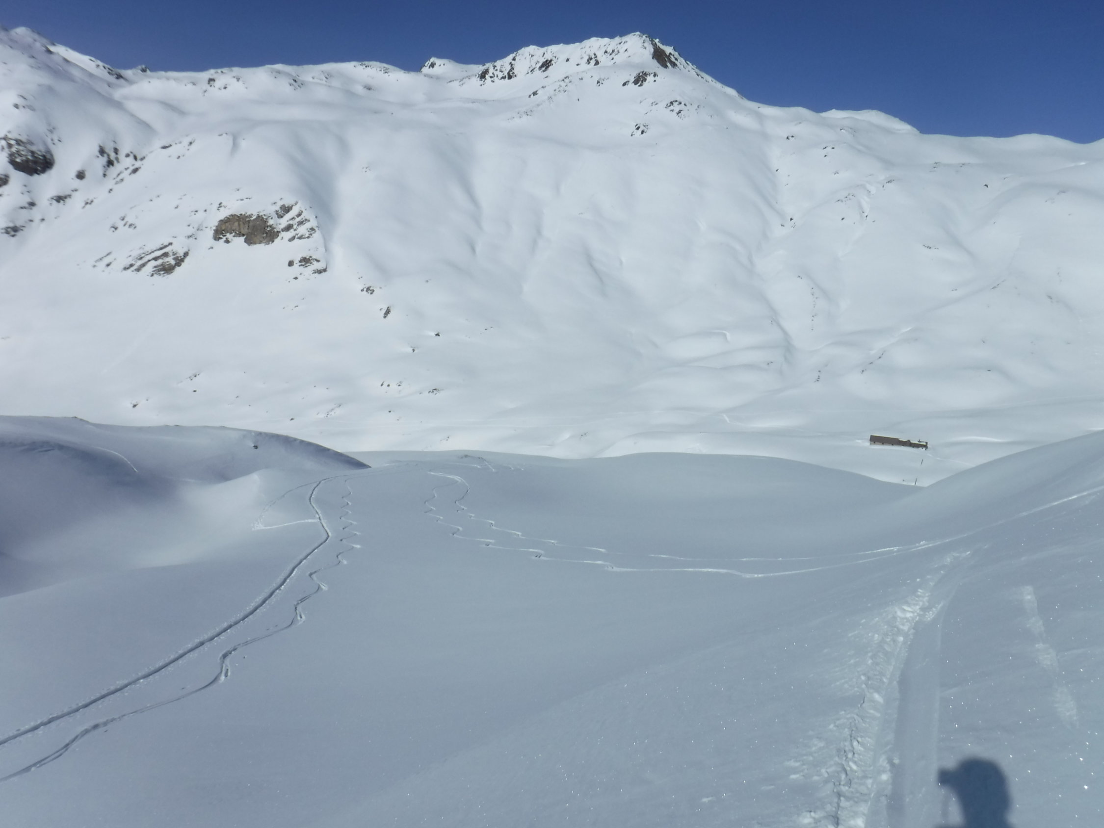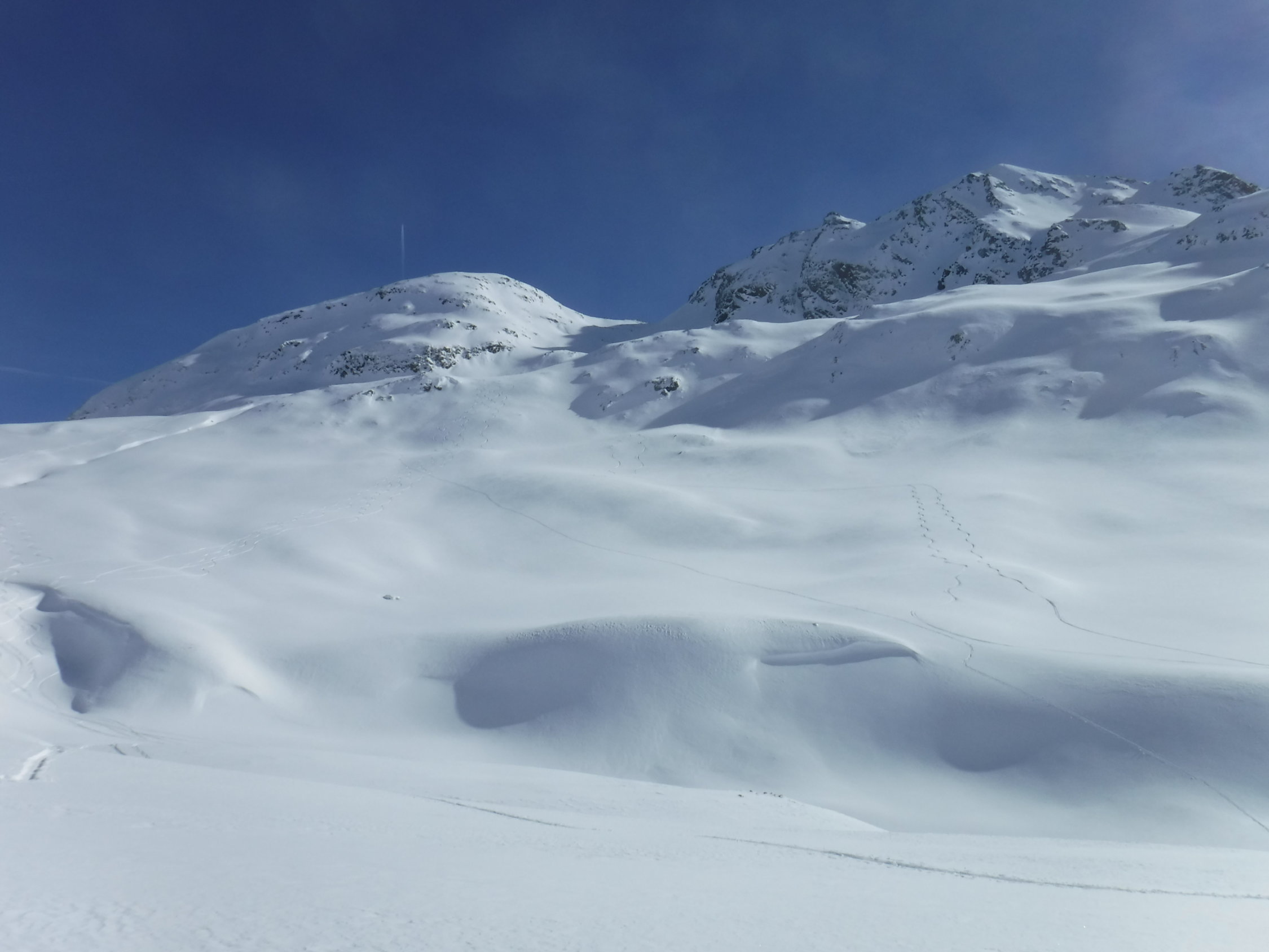 Tourenbeginn um 08:05 Uhr bei -9°C unter stellenweiser Wolkenschicht, die sich schnell verzog und den Himmel dann völlig frei gab. Am Gipfel zeitweise etwas frischer Wand. Auf dem Rückweg durch das Val da Fain dann bei 14°C in purer Sonne. Es lag eine neue Pulverschicht von ca. 20 cm auf älterer Schneeschicht, ohne dass diese darunter besonders verfestigt war.