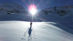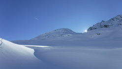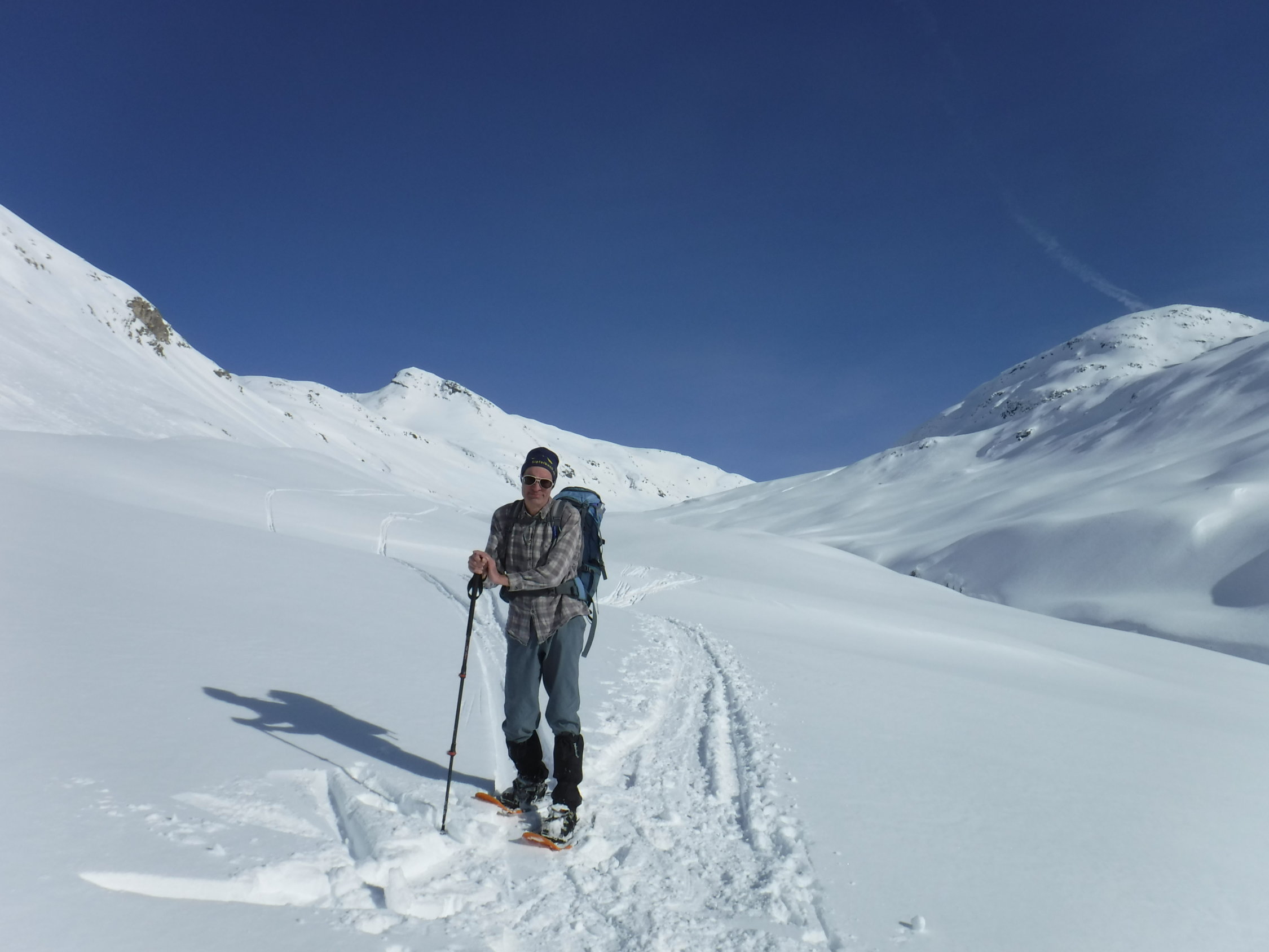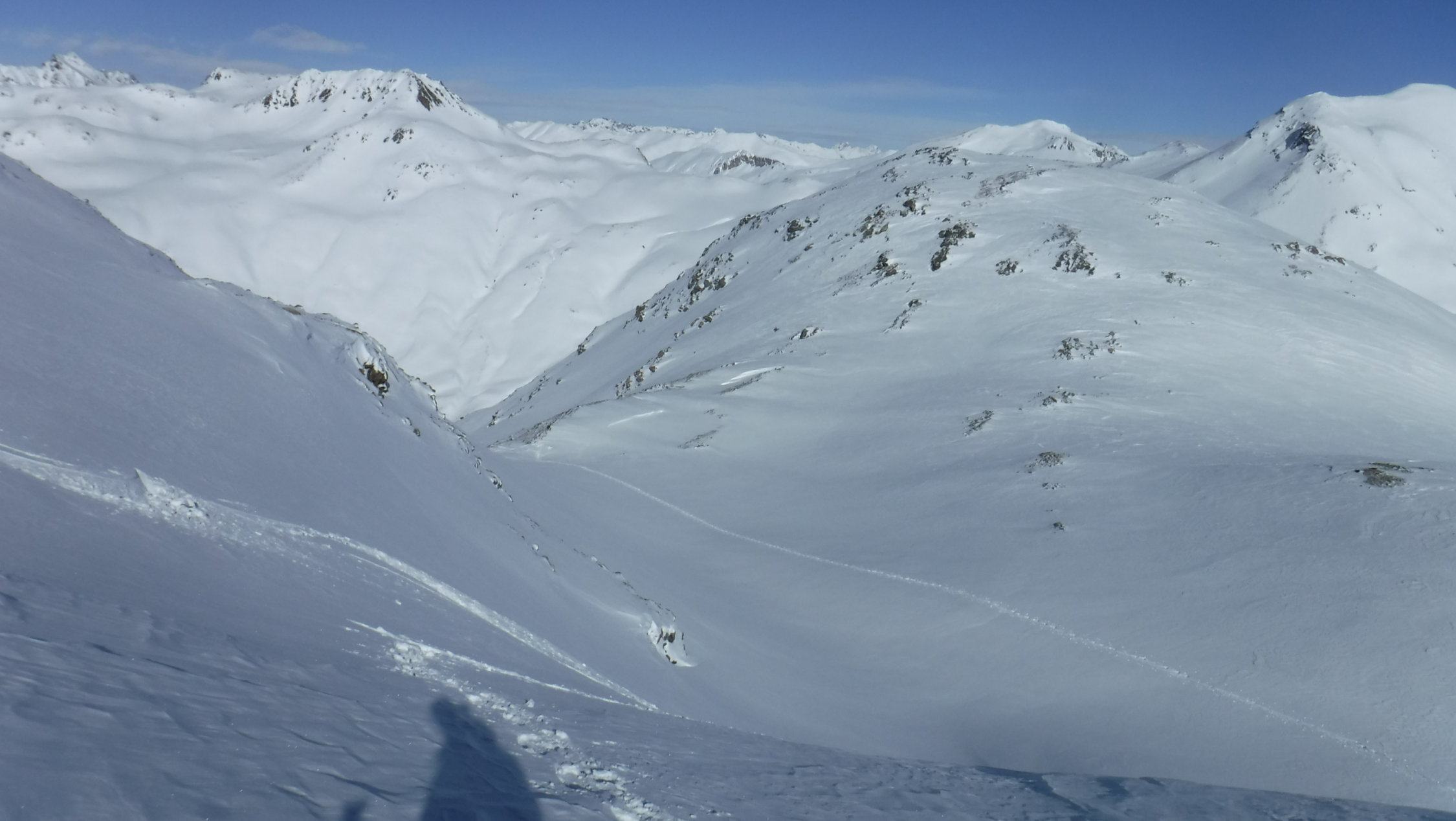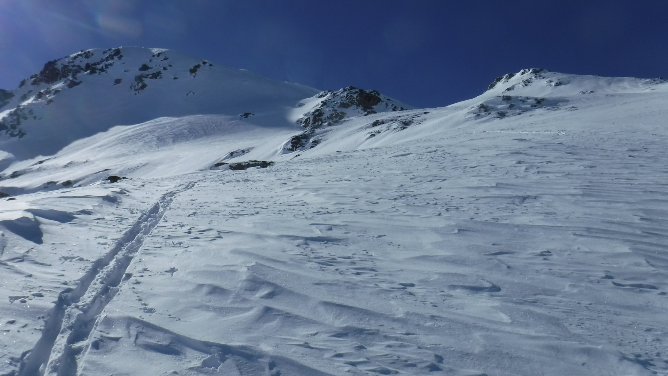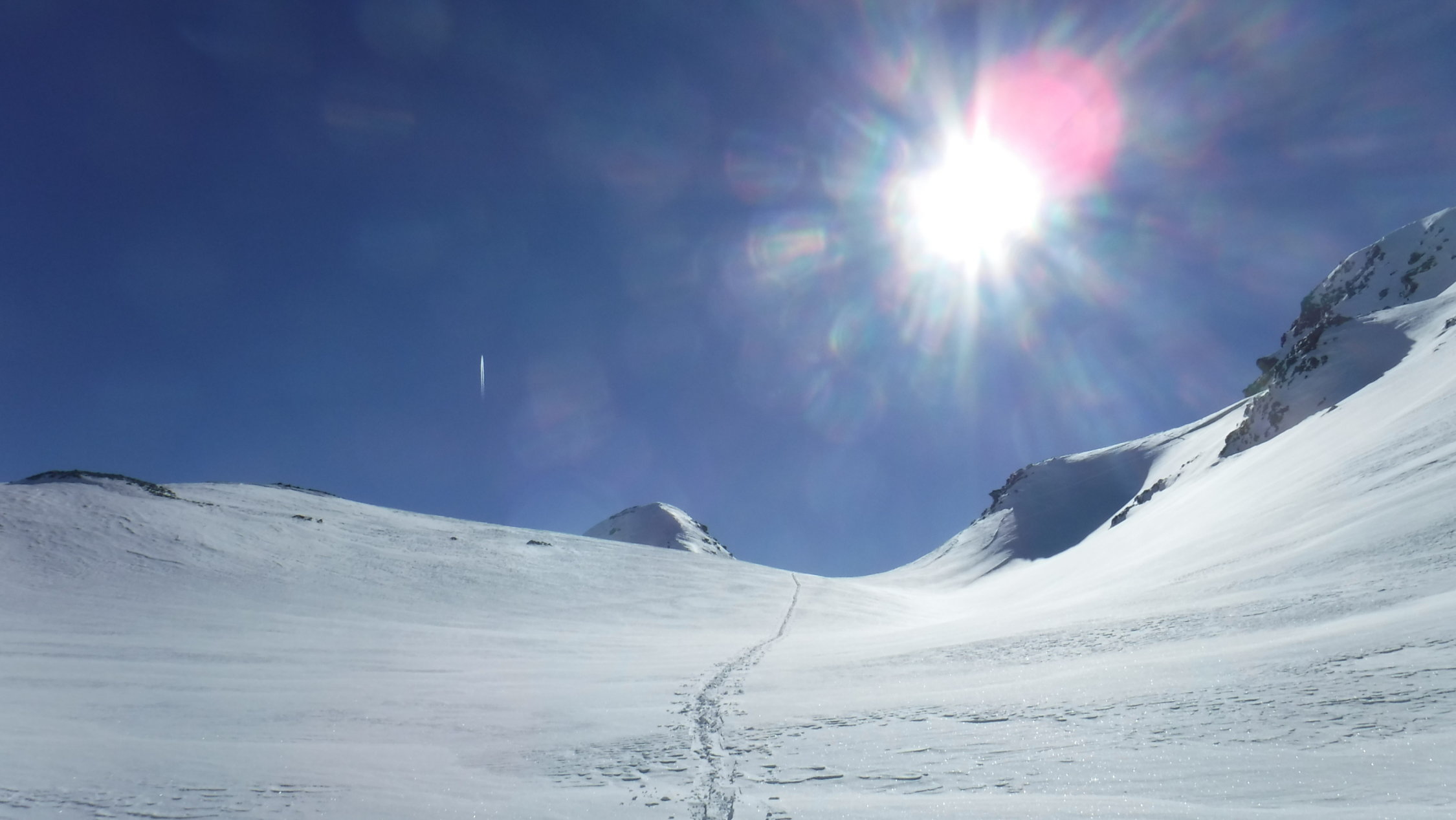 Tourenbeginn um 08:05 Uhr bei -9°C unter stellenweiser Wolkenschicht, die sich schnell verzog und den Himmel dann völlig frei gab. Am Gipfel zeitweise etwas frischer Wand. Auf dem Rückweg durch das Val da Fain dann bei 14°C in purer Sonne. Es lag eine neue Pulverschicht von ca. 20 cm auf älterer Schneeschicht, ohne dass diese darunter besonders verfestigt war.