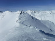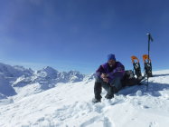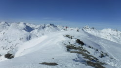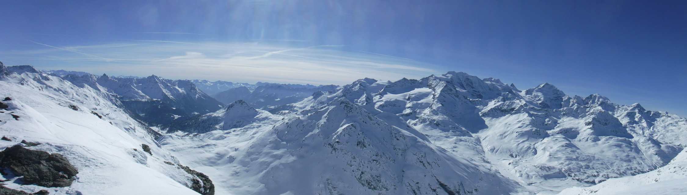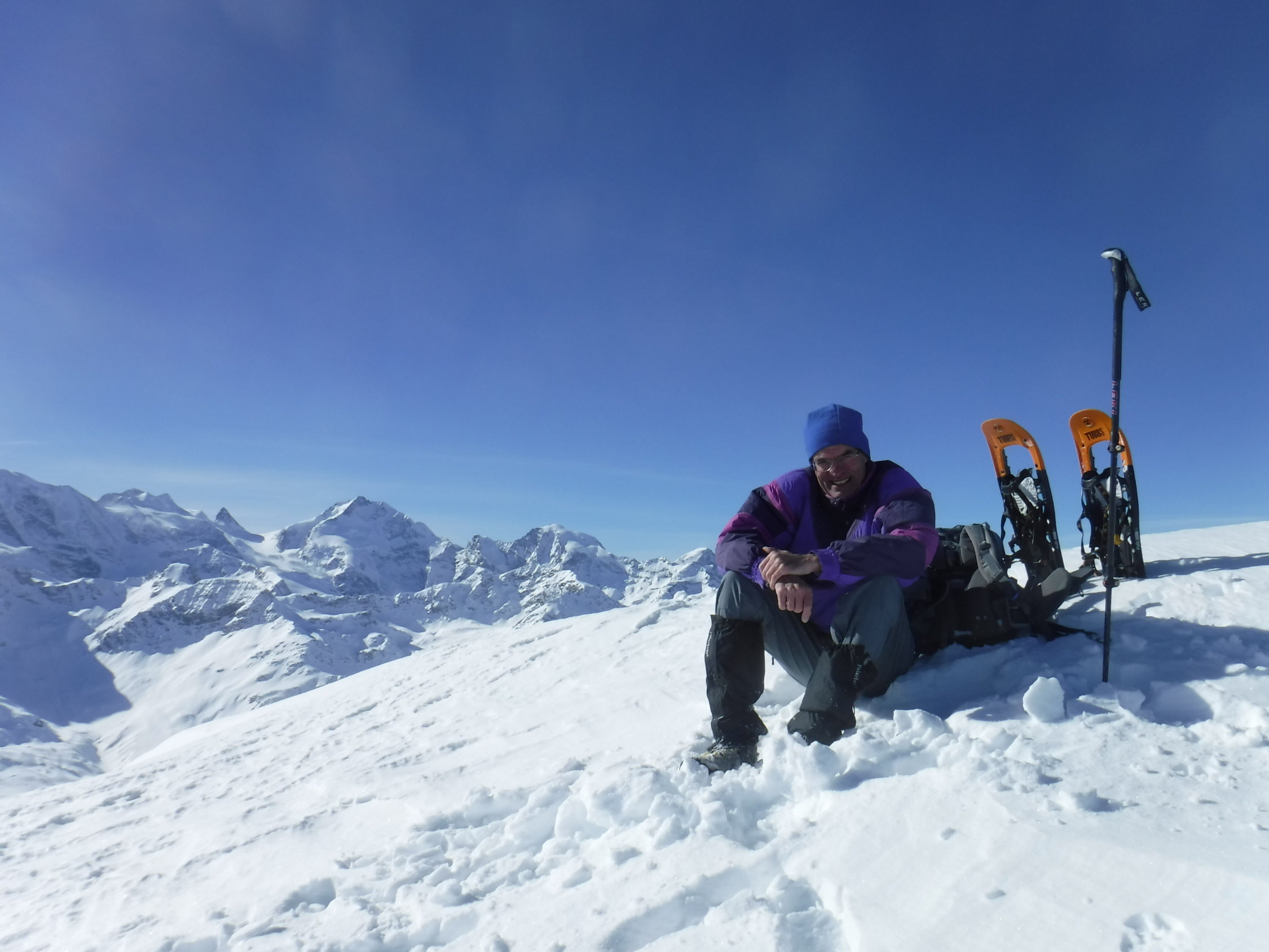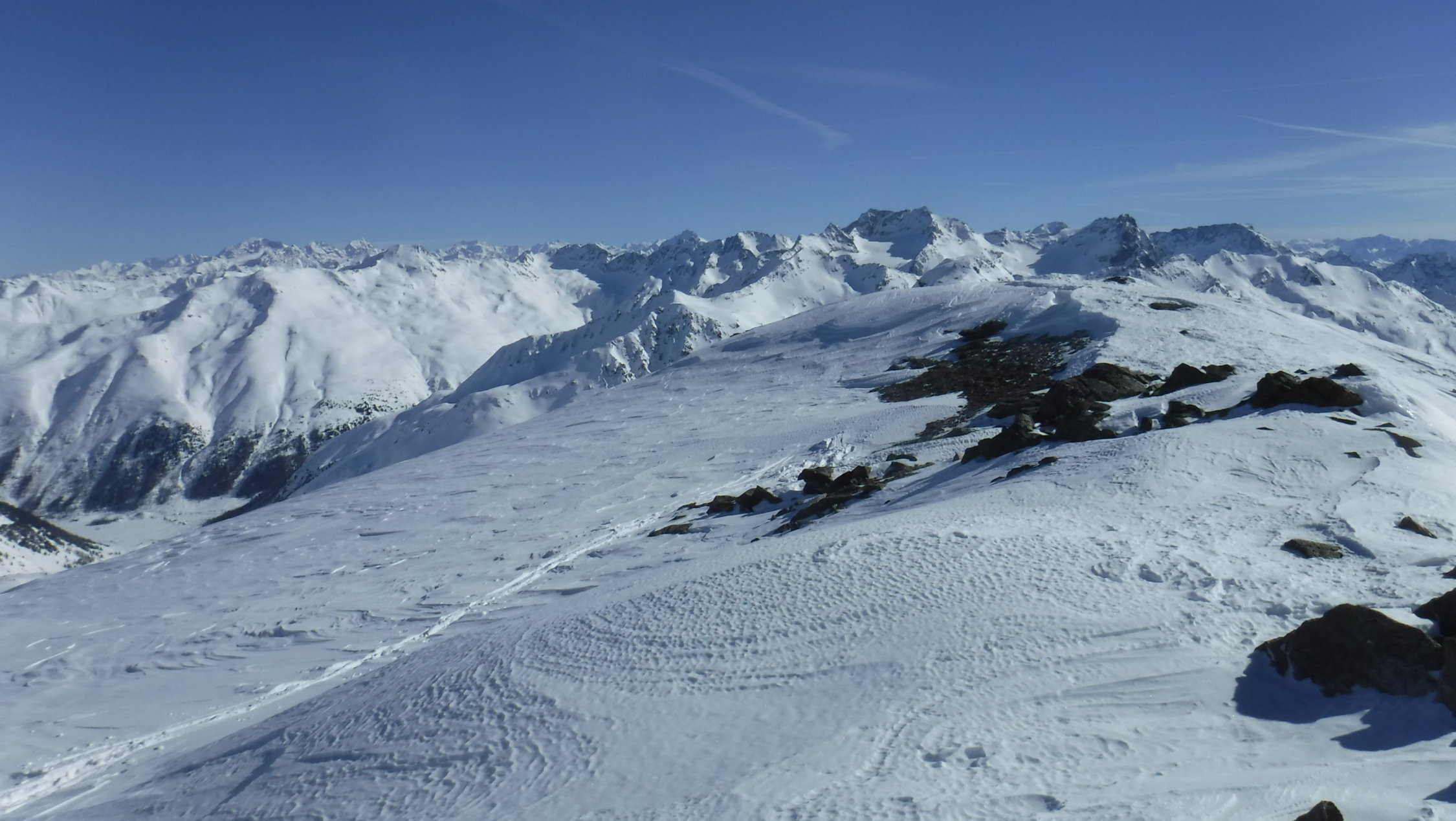 Steigeisen waren nicht erforderlich für den Gipfelhang. Bei starker Verfirnung oder gar Vereisung wäre dann sogar ein Pickel kein Luxus. Sehr schöner Ausblick in alle Richtungen, besonders zur nahen Bernina-Gruppe im Südwesten.