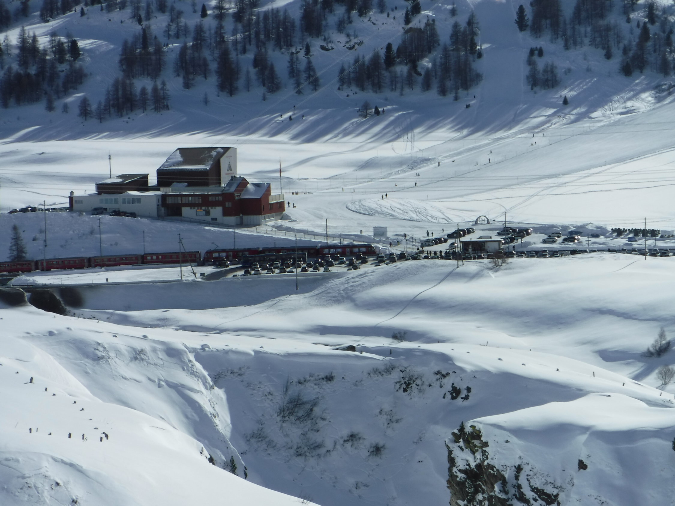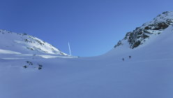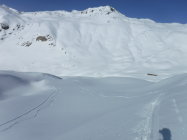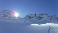 Vor mir spurten 2 Skitüerler, welche über die Nordostrampe zum Piz Alv aufstiegen. Vor dem Wegweiser (P 2172) überholte mich ein Skitourengänger, der mir oberhalb vom Sattelplateau (P 2832) wieder entgegengefahren kam. Beim P 2304 überholte mich ein Pärchen, deren Spur ich dann folgte. Im Abstieg kamen mir oberhalb vom P 2832 noch ca. 12 Leute noch entgegen.