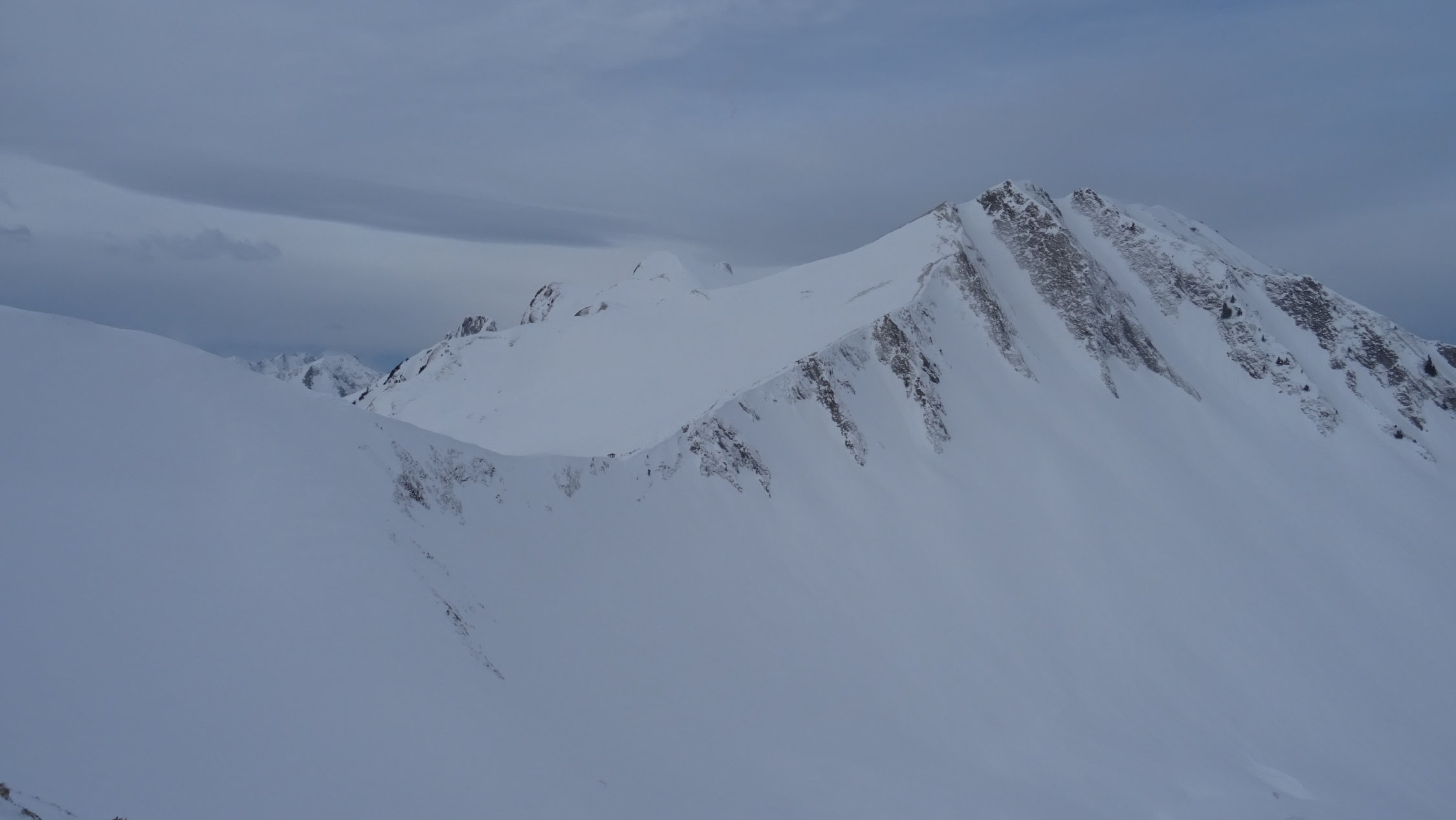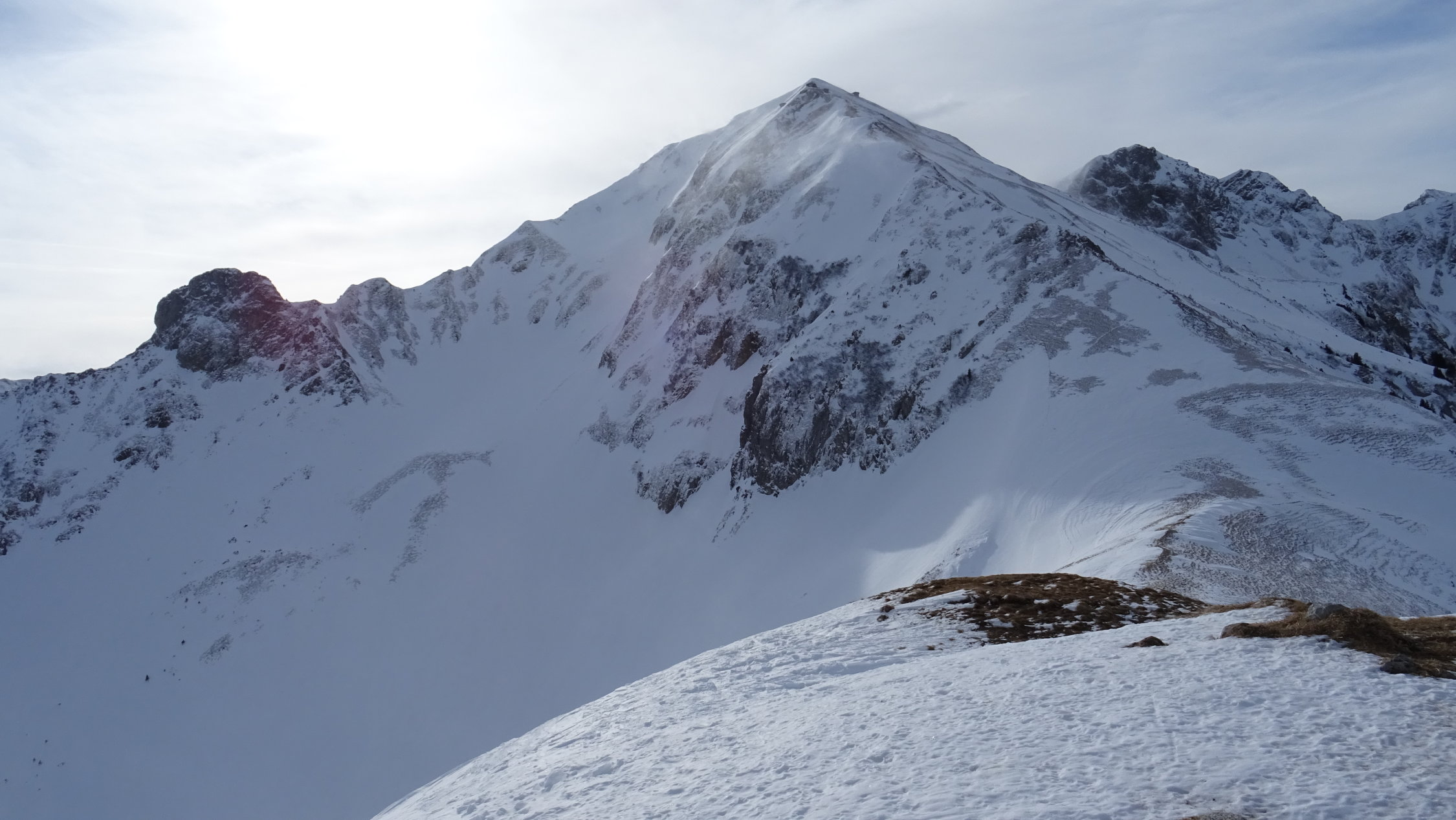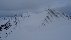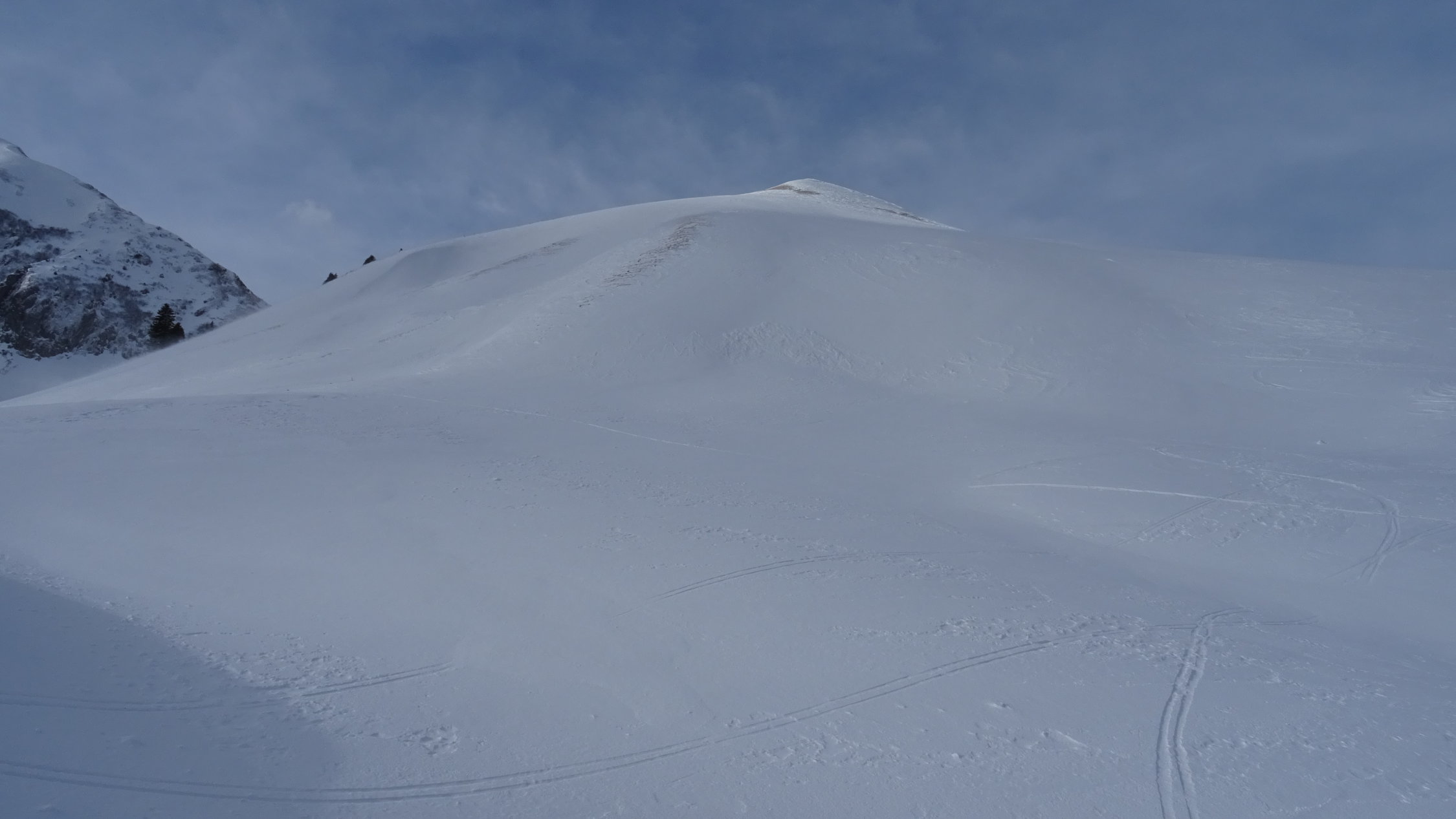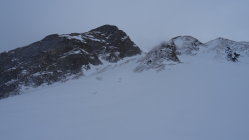 Nach mühsamen Felle entfernen und paar Sekunden Orkanwindpause konnte ich in den NW Hang Abfahren.