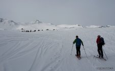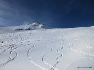 Mit dem Föhn schön aufgehellt, dann sogar blauer Himmel, sehr warm. Nur ganz oben ging zeitweise starker Wind. Viel Schnee ab Vermol.