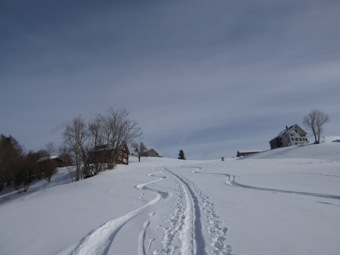 Schnee: Ab Parkplatz (Schäfli) bis zum Gipfel liegt noch viel Schnee: Eine sehr gute Unterlage, darüber 10 bis 30 cm Pulverschnee aus den gestrigen Niederschlägen. Daher wunderschöne Abfahrt!