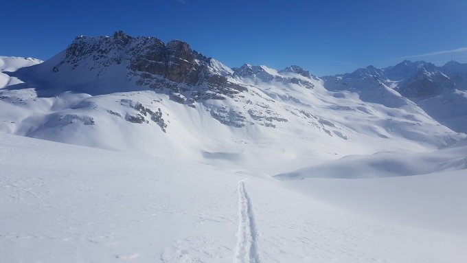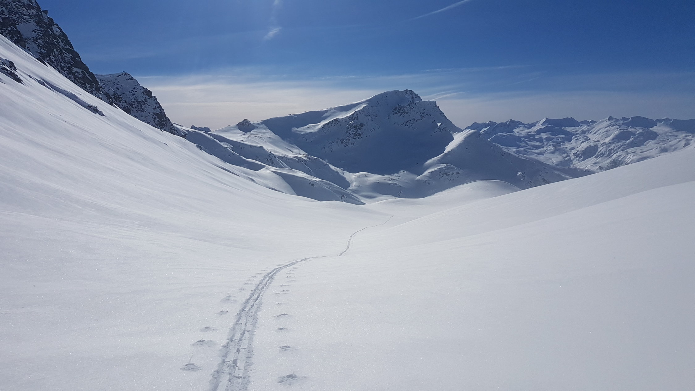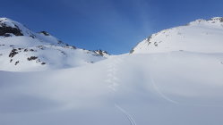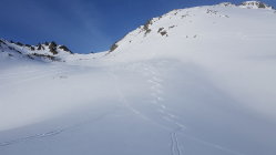 Habe eine nicht ganz normale Route für den Piz d'Agnel gewählt. Das Tal hinein war gespurt. Auf den Sattel südlich des Piz Campagnun habe ich die Hauptspur verlassen und bin etwas südlicher aufgestiegen. Wollte zuerst den steileren Hang hinten runter, war mir dann aber zu riskant. Wieder etwas aufgestiegen und etwas mehr links runter gefahren. Westlich vom Südgrat eine einsame Spur gelegt, lediglich zwei Abfahrtsspuren waren schon vorhanden. Auf dem SW-Grat war Vorsicht geboten, habe dort die Route immer knapp unter den Felsen gewählt. Am Schluss den Hang hoch auf den Gipfel ging wieder ganz gut.