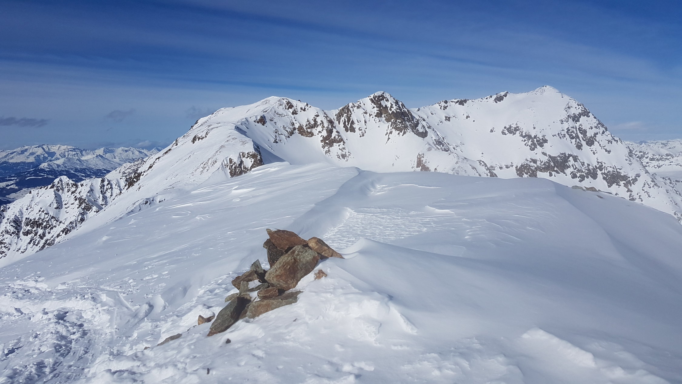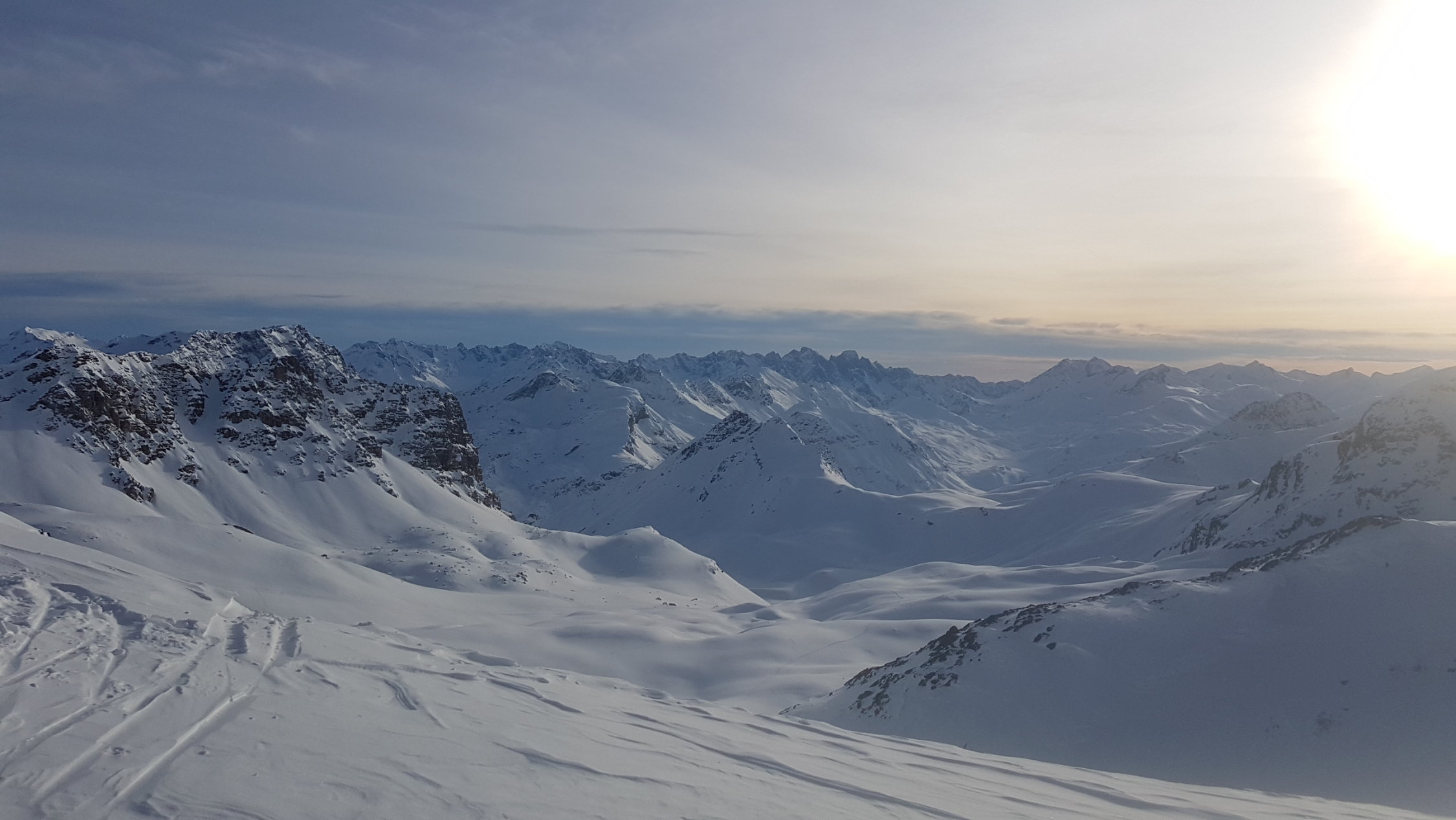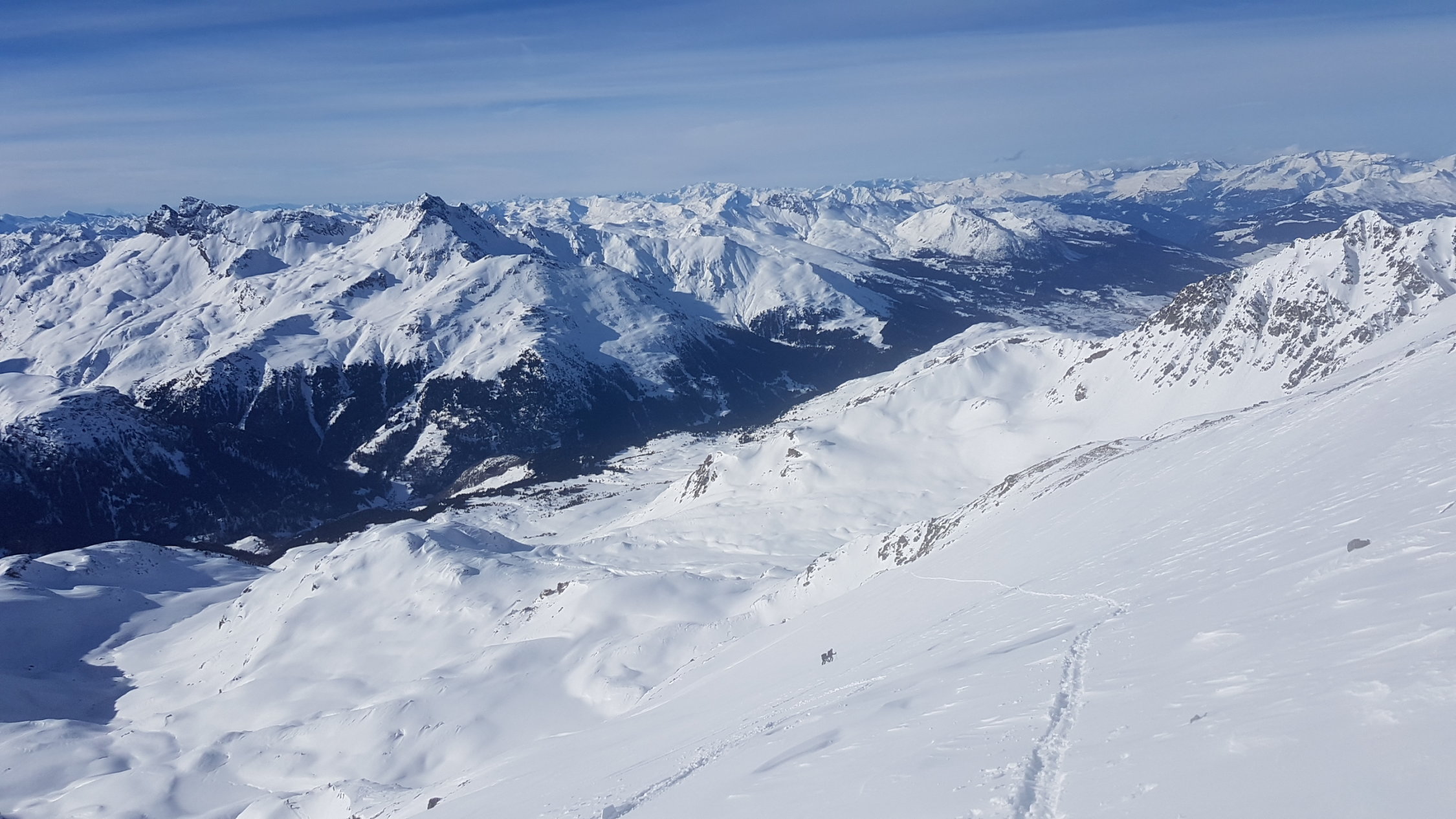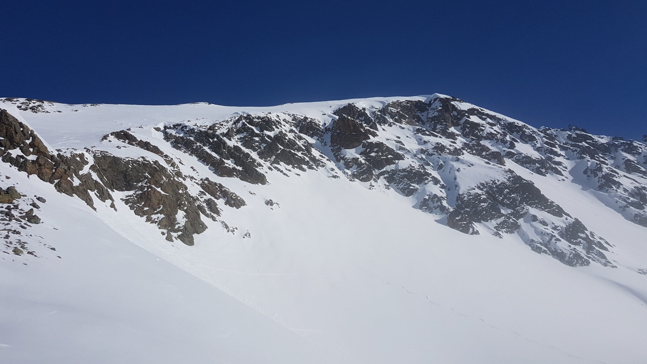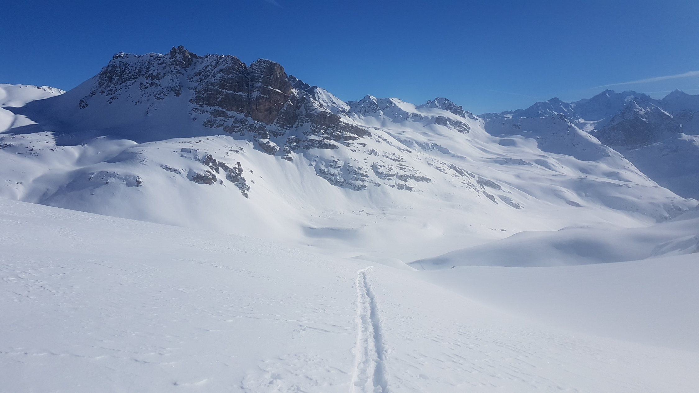 Wollte mir das SW-Couloir anschauen und bin ein Stück runter gefahren. Ganz oben im Couloir lösten sich ganze Blöcke, so dass ich dieses Vorhaben schnell aufgegeben habe. Wieder Felle rauf und zurück zum Gipfel. Dann via Fuorcla da Flix zur Fuorcla d'Agnel. Der NW-Grat ist komplett abgeblasen. Ganz recht sind Wächten, links davon sehr steinig. Die meisten sind zu Fuss hoch gegangen von der Fuorcla da Flix.
