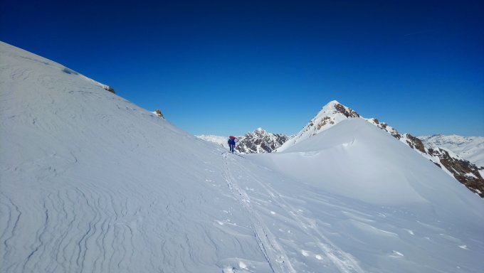 weniger schnee als norden, aber genug für skitouren, aufstieg griffig ohne Harscheisen (wahrscheinlich bald sinnvoll mit Firn)