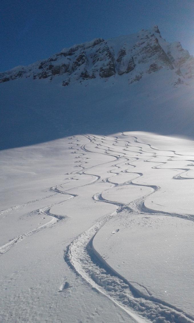 Beim Wiederaufstieg Monster-Stollen. Da ständiger Wechsel zwischen Nassschnee und Pulver