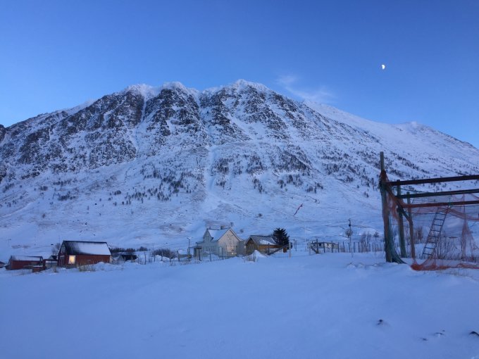 Den Neuschnee vom Vortag hatte es dann auch schon aus der Südostflanke ins Meer geblasen. Abfahrt vom Gipfel auf einem ruppigen Windharschdeckel. Im Russelvdalen waren noch ein paar Pulverschwünge möglich.
