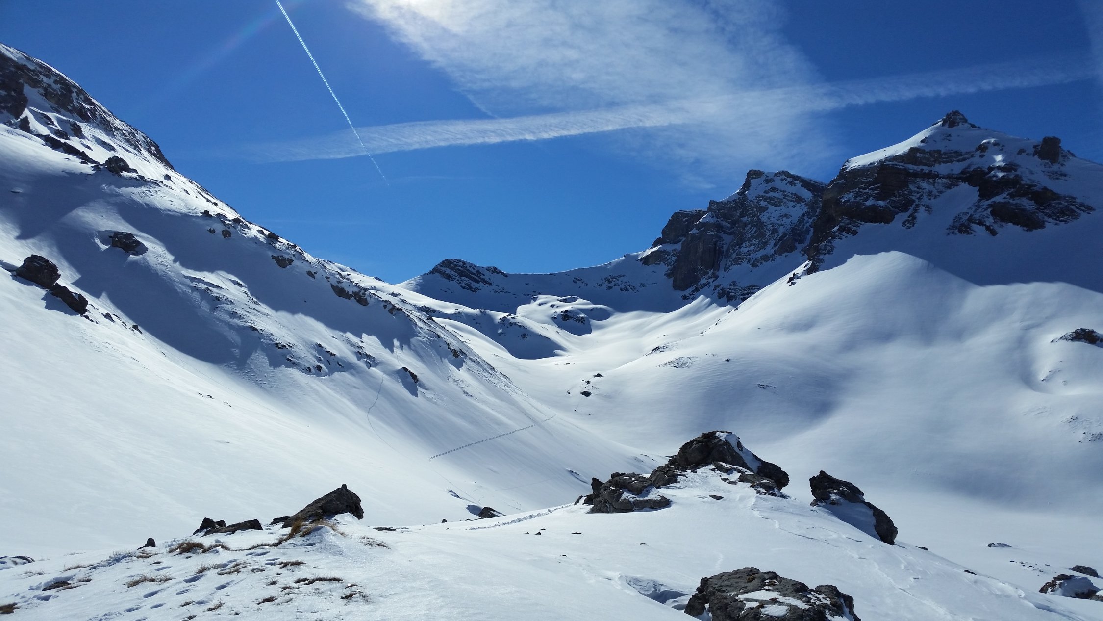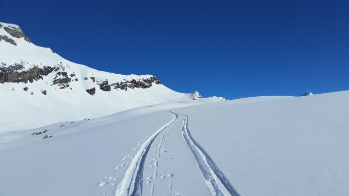 Route Richtung Lämmerenhorn / Steghorn noch kaum benutzt, nur eine ältere Spur gefunden, Schnee: gleichmässiger Alt-Pulver gut zu fahren.