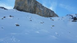 Abfahrt durch Üschinental: Je später die Stunde ist, ist etwas Vorsicht in diesem Bereich wahrscheinlich nicht völlig unangebracht, da die Südflanke des Lohners in der Sonne zu weiteren Nassschneelawinen neigen "könnte".