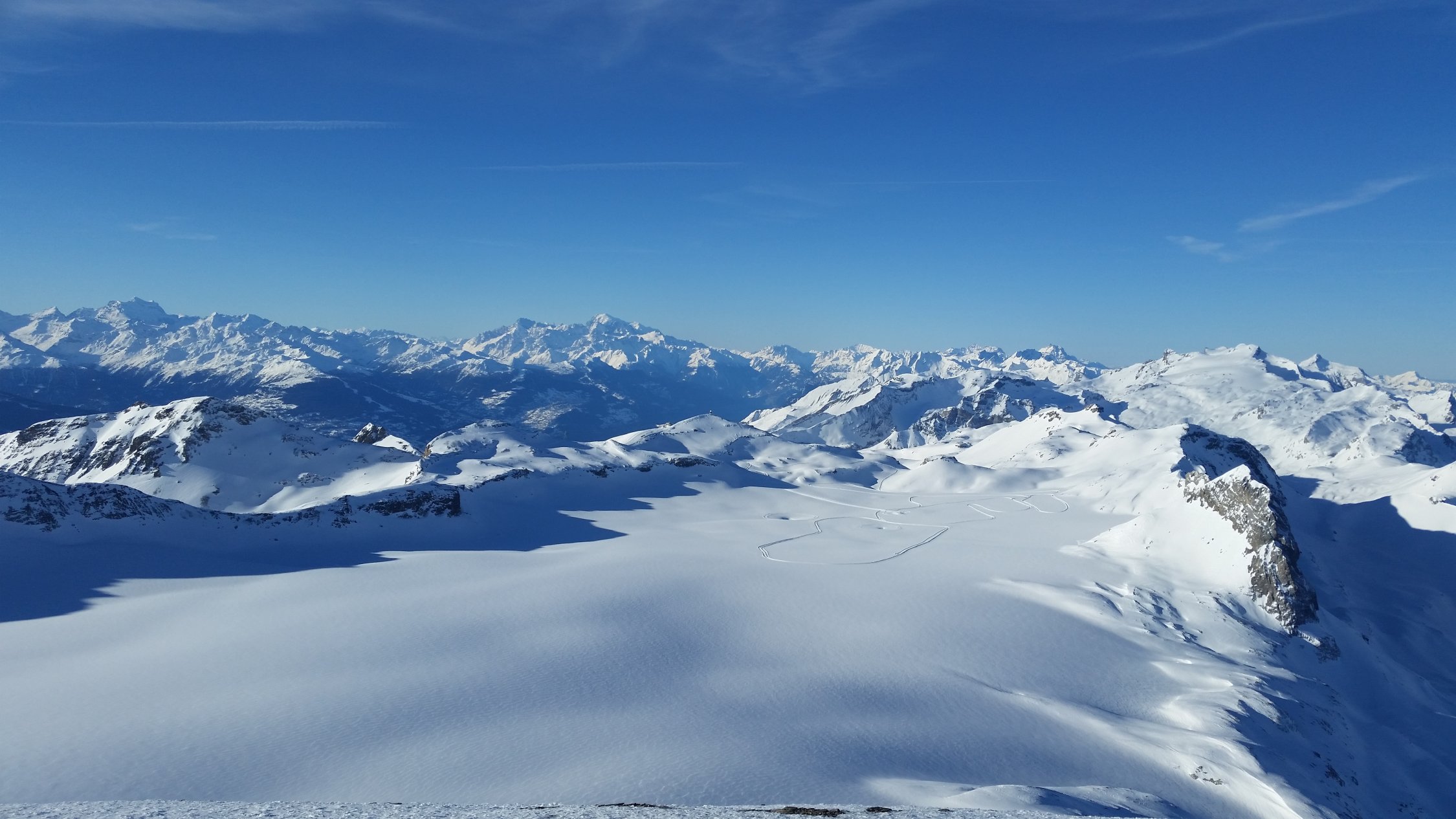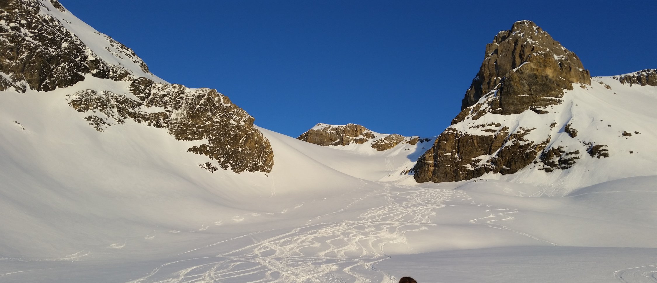 Abfahrtsroute vor allem im schönen Bereich zwischen 3100 und 2800 hat noch genügend Platz für eigene Spuren. Wunderbares Pulver-Vergnügen.