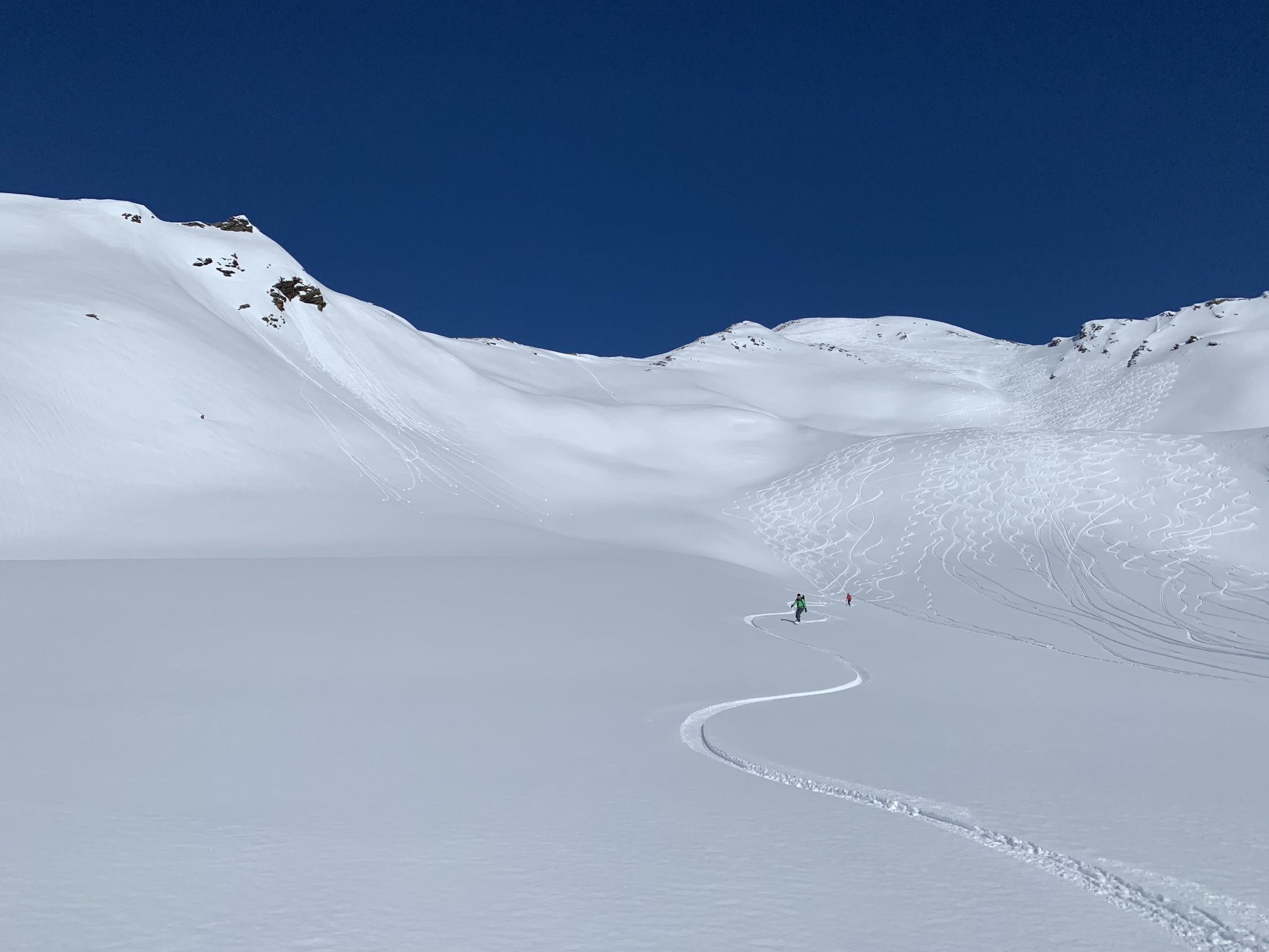 Gute Spur zum Gipfel. Für Splitboarder lohnen sich Harscheisen. Es hat noch genug Platz für Kurven in der Abfahrt. Spuren zum Lauizughorn und Vereina vorhanden