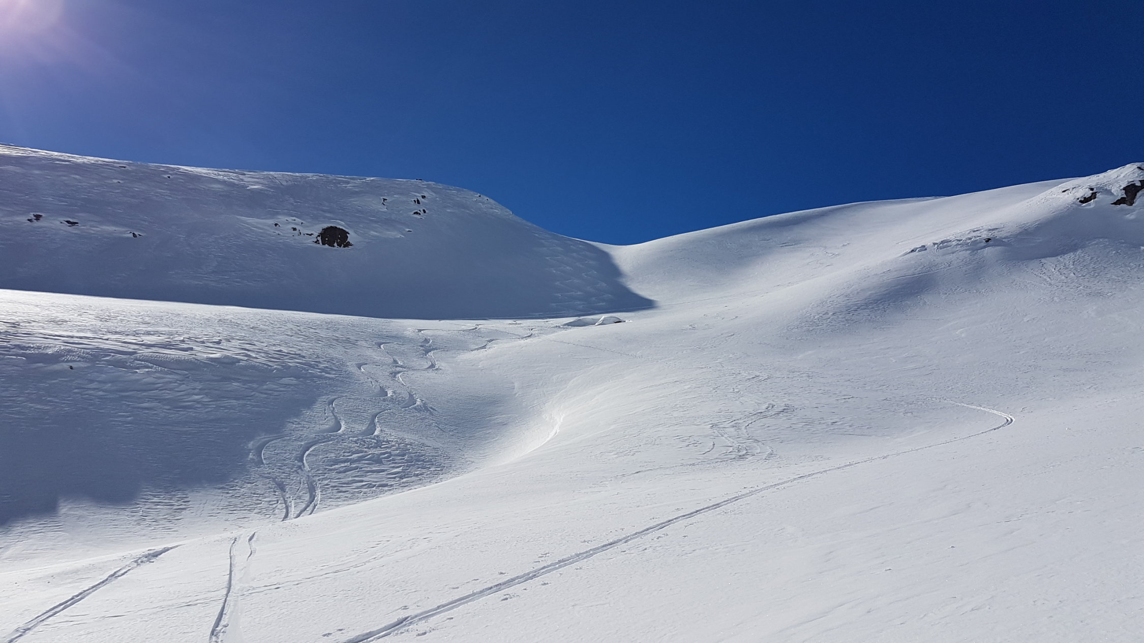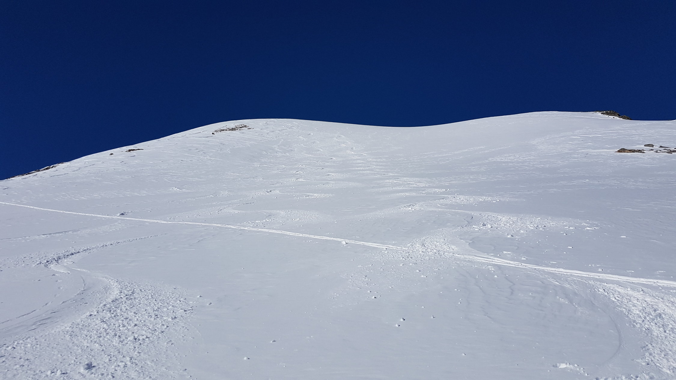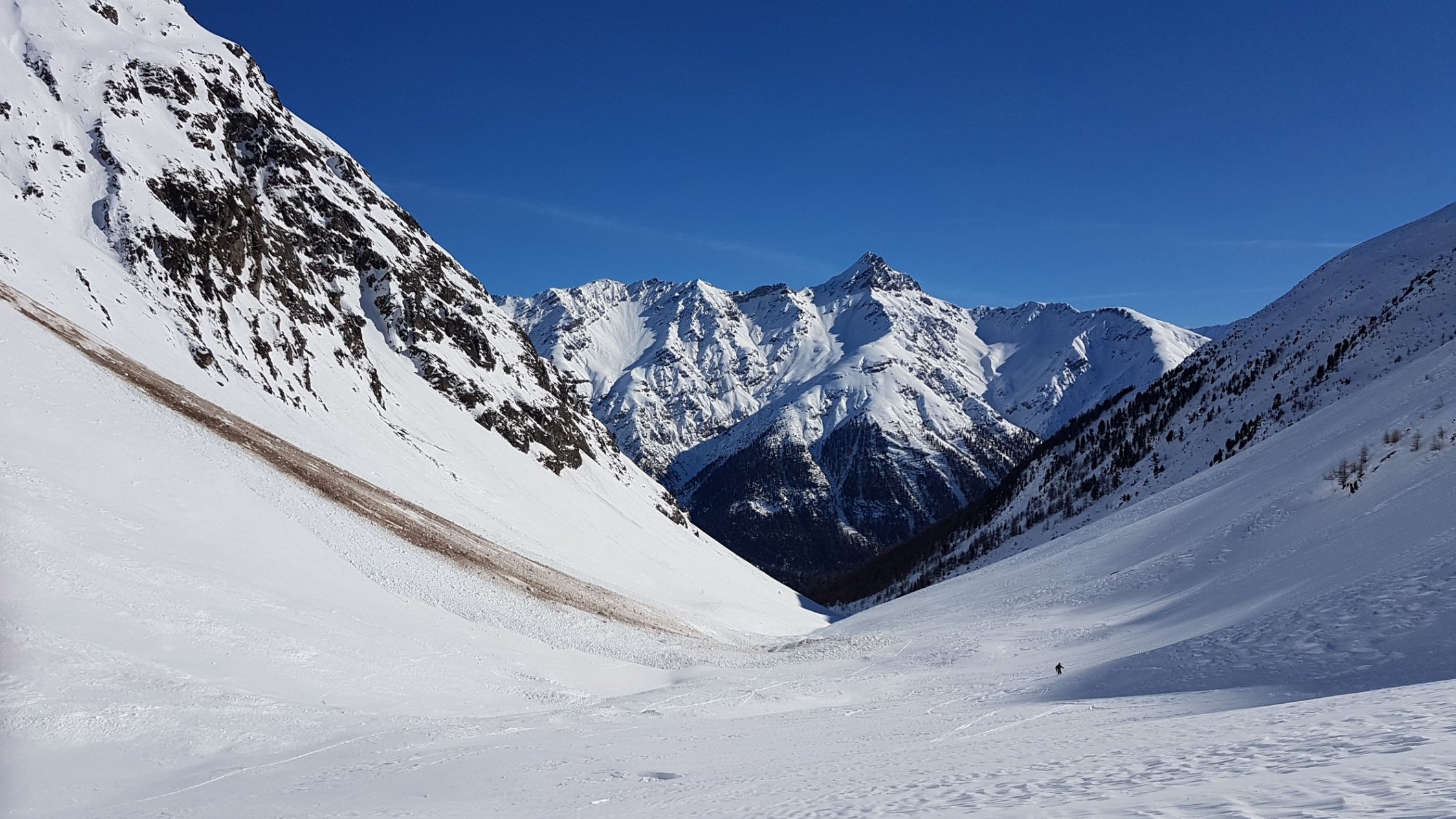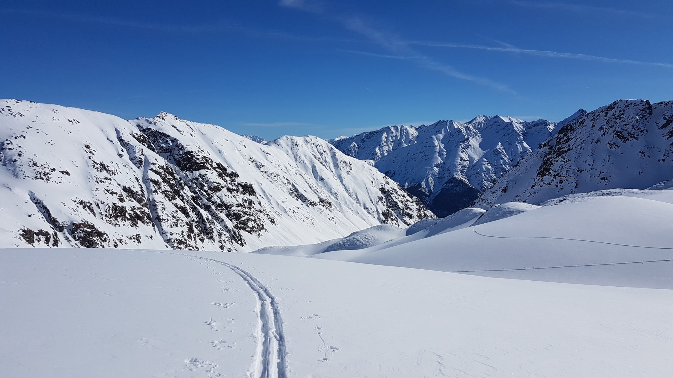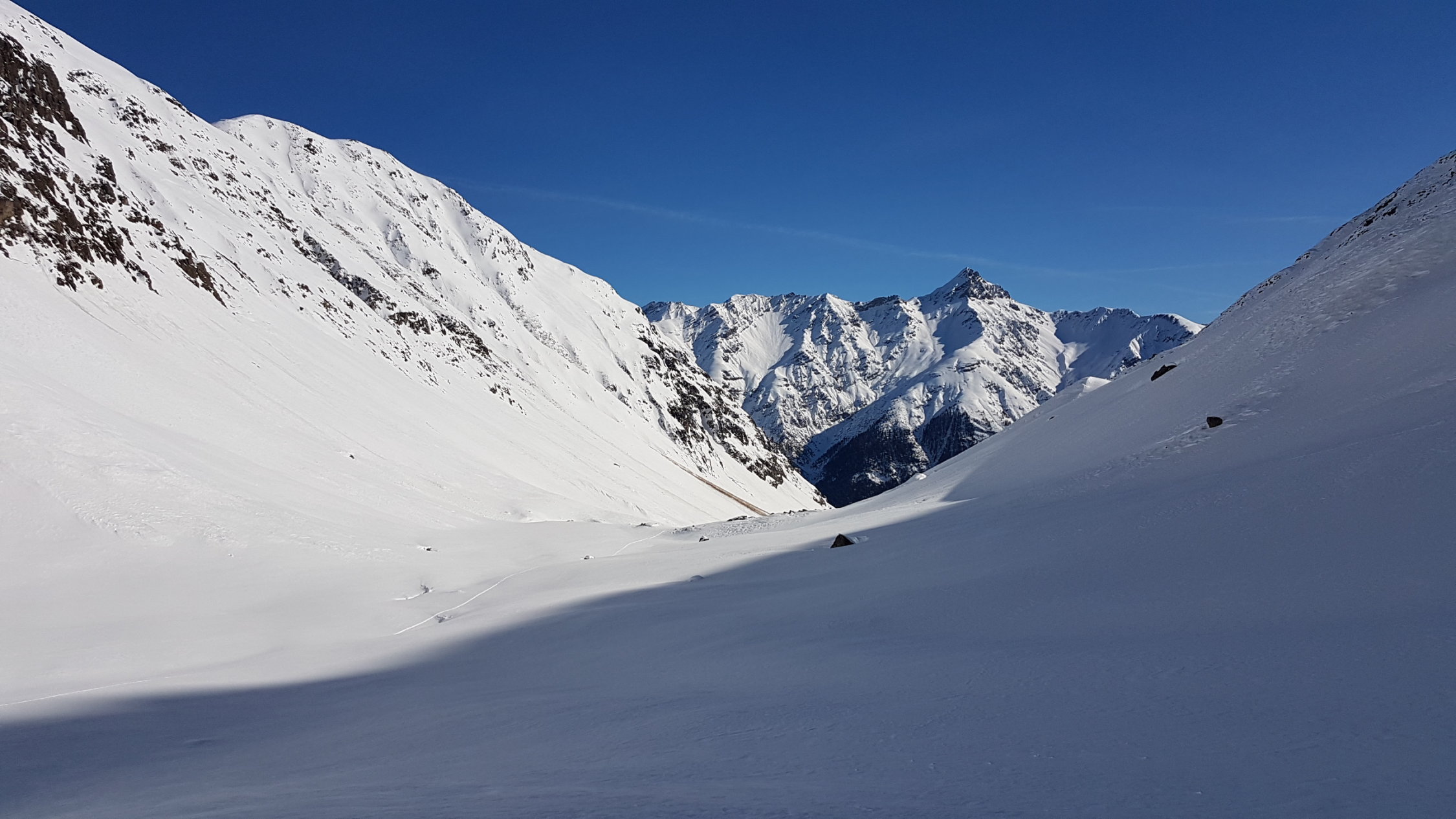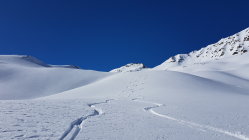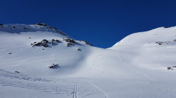 Im Val Punt Ota war bereist gespurt. Ein Stück oben ist eine grössere Lawine runter gegangen, die leicht umgangen werden kann. Wir sind heute hinten im Tal etwas nördlicher als üblich aufgestiegen, ging auch ganz gut.
