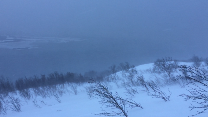 Die Schneeoberfläche ist bis ca. 200 hm vom gestrigen Schneeregen gezeichnet, der Schnee ist schwer und stollt an den Fellen. Über der Baumgrenze dann wegen heftigem Wind und schlechter Sicht umgekehrt.