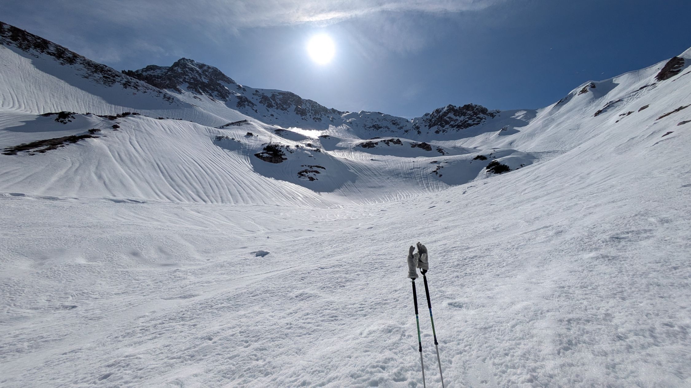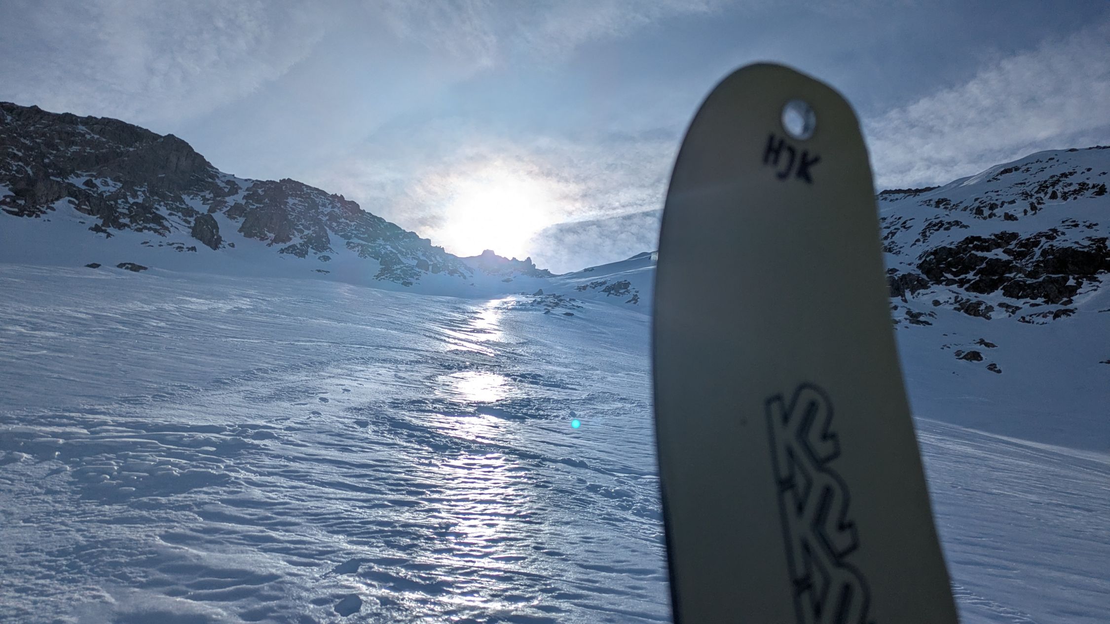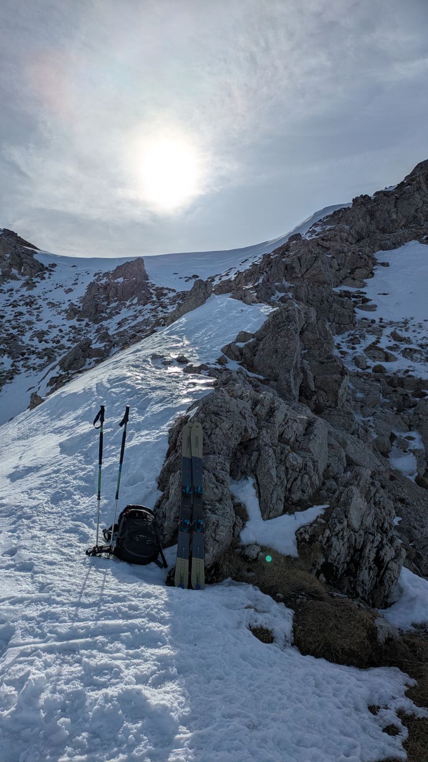 Mit. Steigeisen hoch und großteils wieder runter.Kein Halt mit meinen Ski!