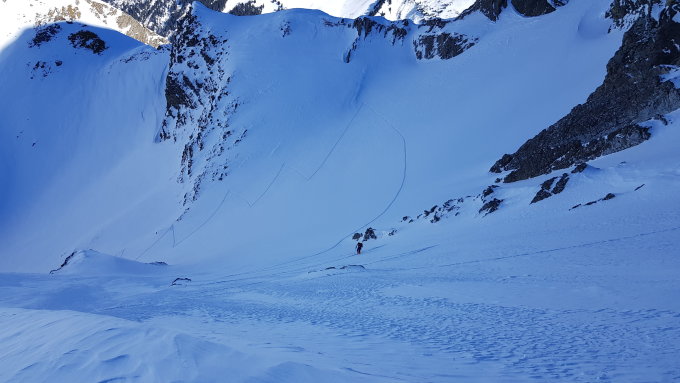 Aufstieg: Schnee unterer Teil bis Bütschi von der Sonne leicht gedeckelt. In den Couloirs Mischung aus Pulver und Bereichen mit leichtem Windeinfluss. Insgesamt sehr griffige Spur. Kein Aufbinden der Ski nötig. Grat ebenfalls gut begehbar.