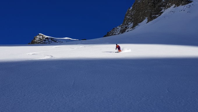 Abfahrt: Oben super mit viel Pulver, unten Sulz und Nassschnee.