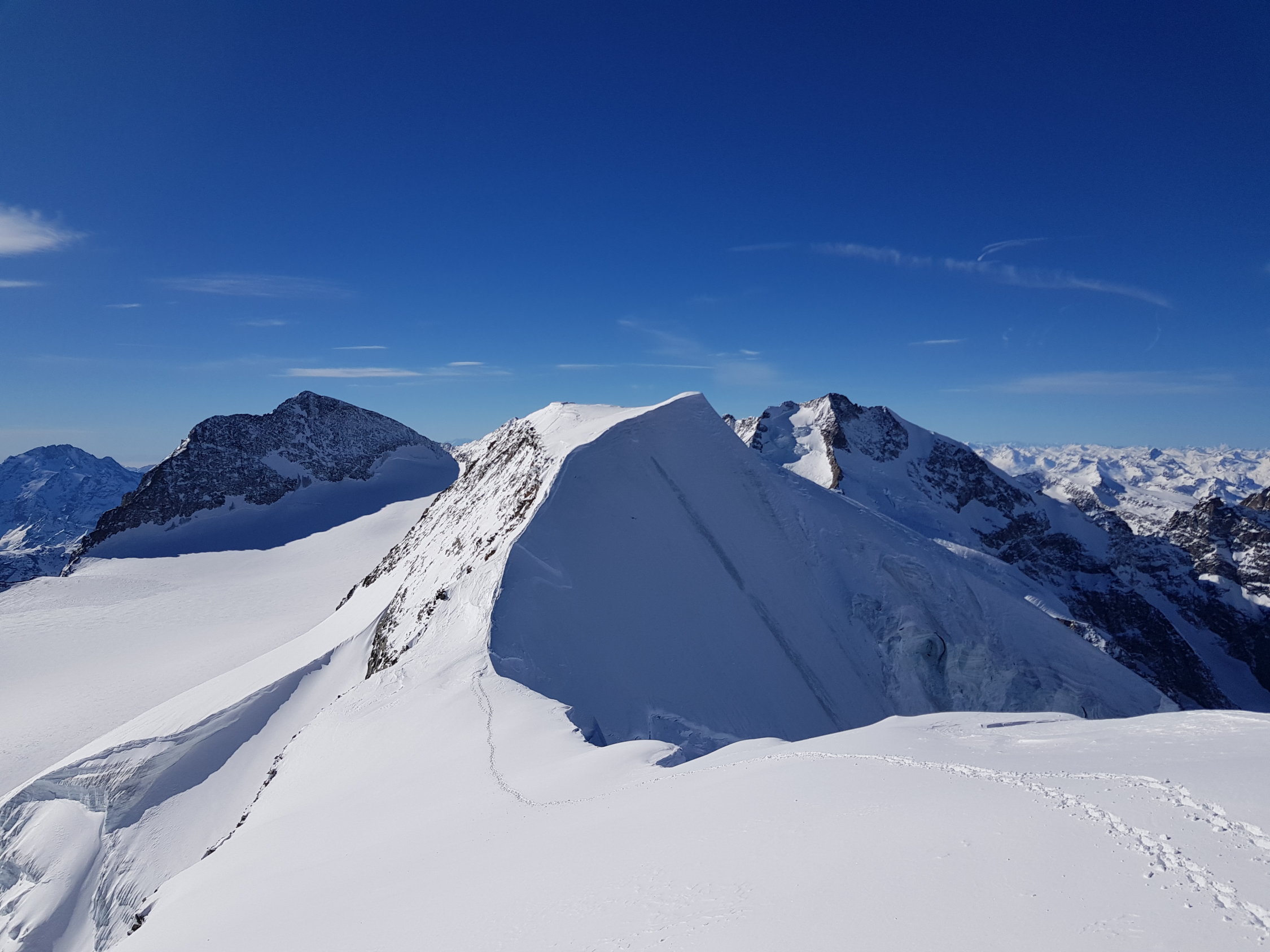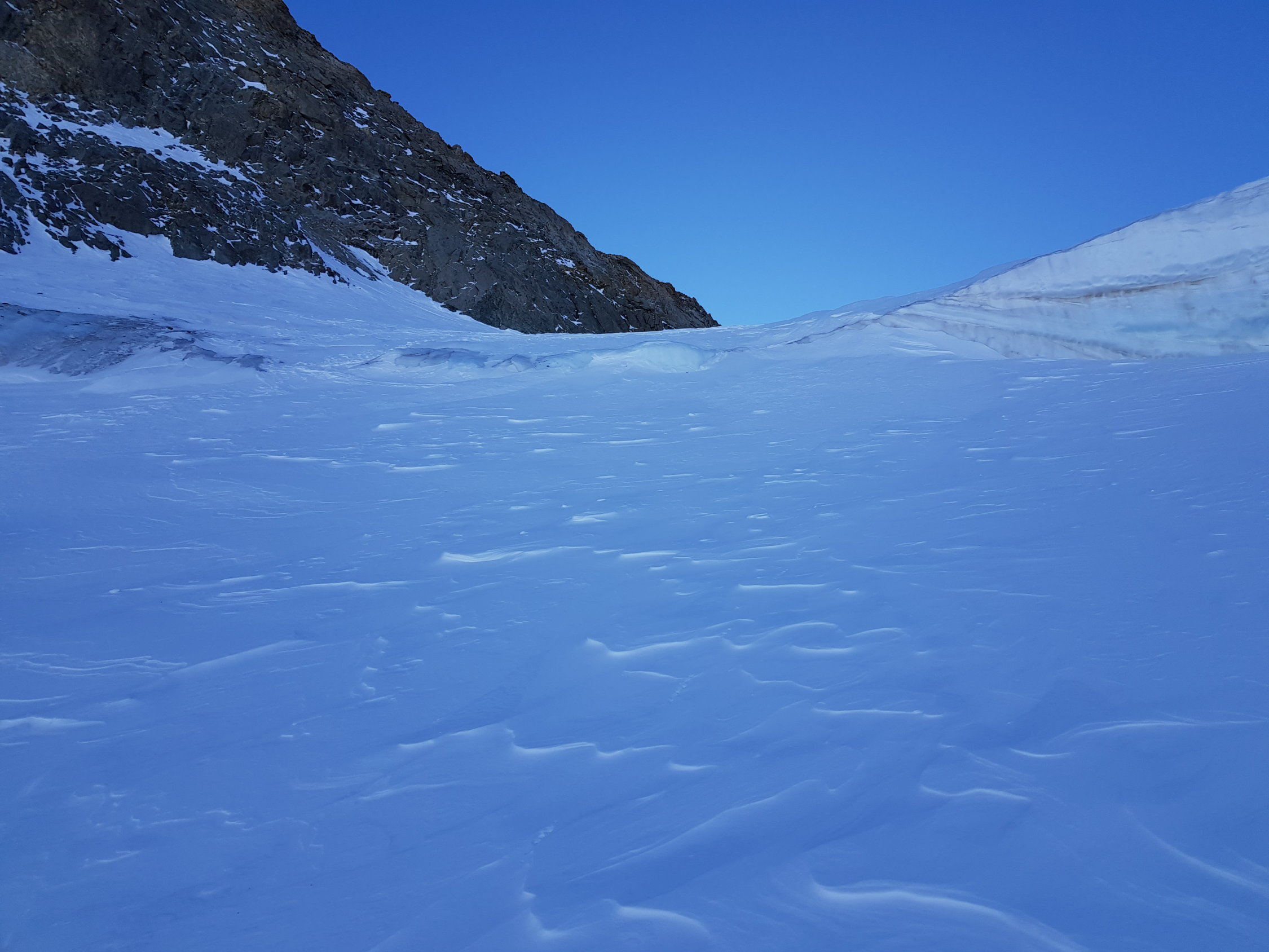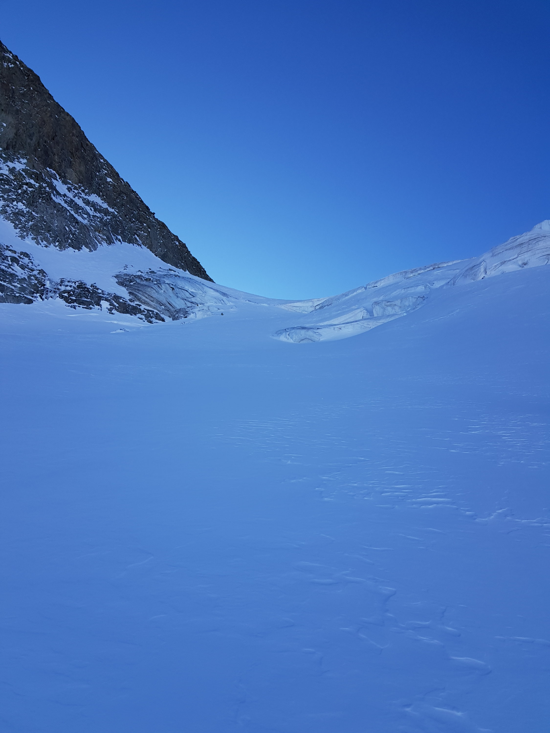 Hang oberhalb Schnapsboden teils stark abgeblasen, Harscheisen können evtl. hilfreich sein. Die grosse Querspalte auf ca. 3600 m lässt sich zur Zeit anders als gewohnt über eine steile Firnbrücke auf der linken Seite überqueren, ganz rechts ist der Spalt (noch) sehr weit offen. Die Spalte lässt sich nur zu Fuss überwinden, meiner Meinung nach lohnt es sich das Skidepot bereits unterhalb der Spalte zu machen.
