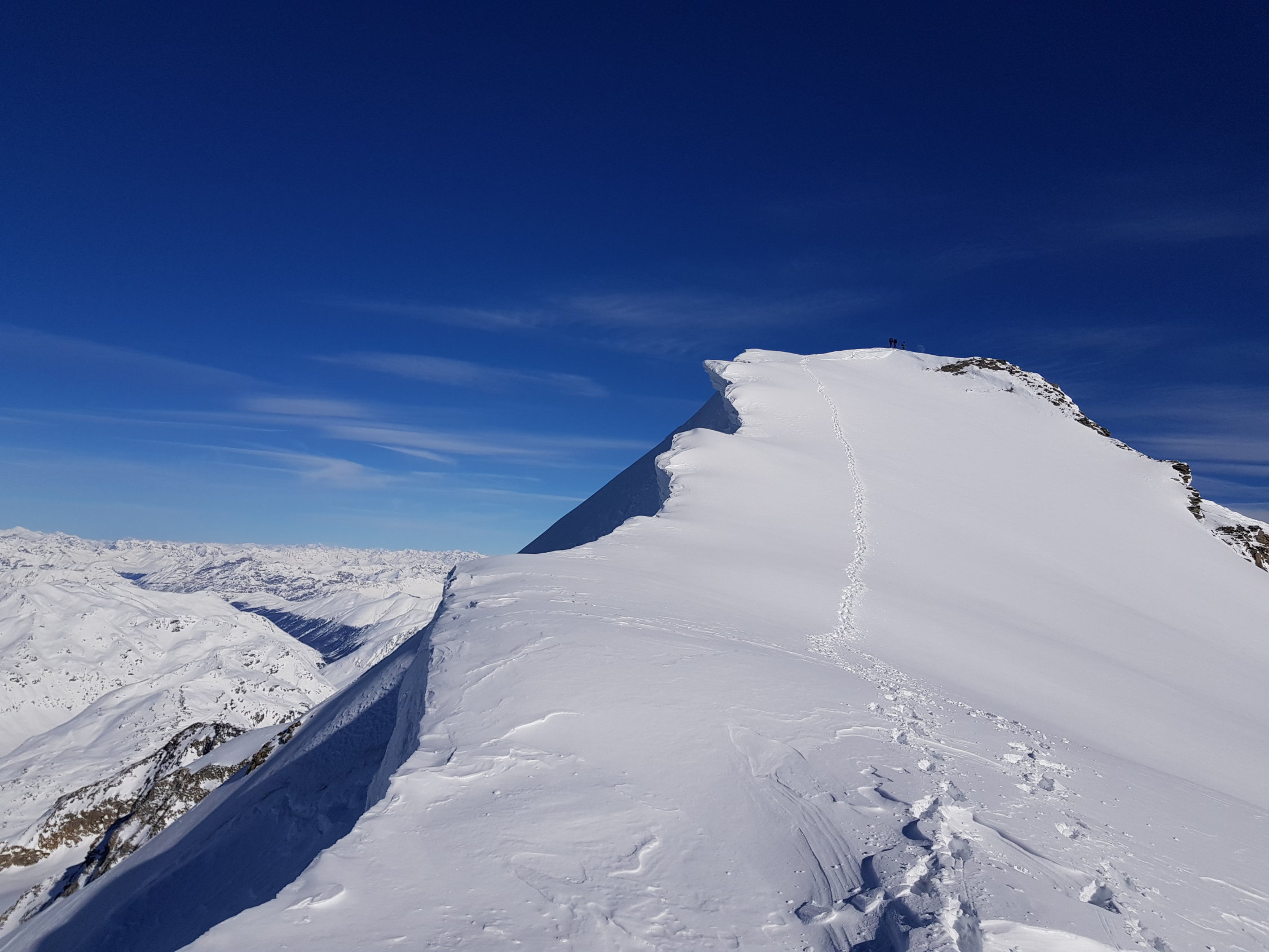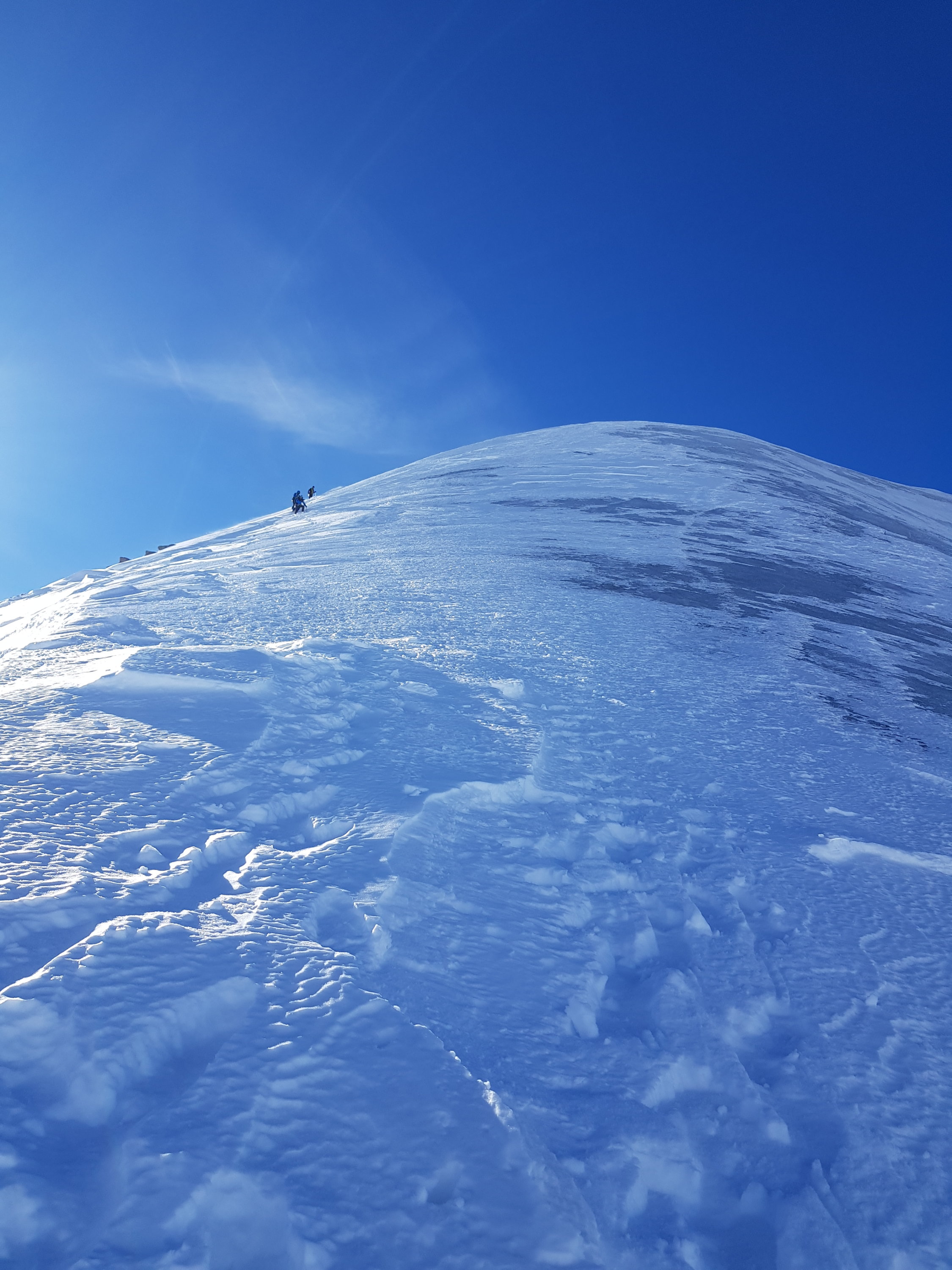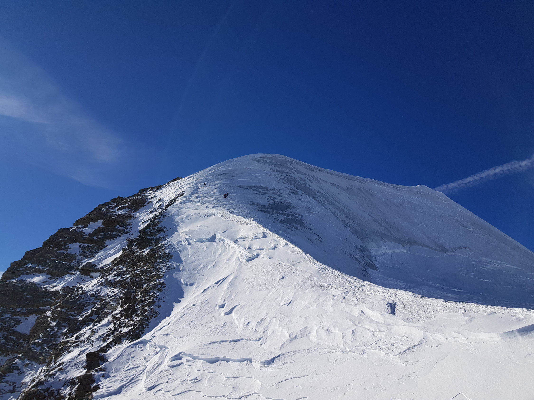Hang oberhalb Schnapsboden teils stark abgeblasen, Harscheisen können evtl. hilfreich sein. Die grosse Querspalte auf ca. 3600 m lässt sich zur Zeit anders als gewohnt über eine steile Firnbrücke auf der linken Seite überqueren, ganz rechts ist der Spalt (noch) sehr weit offen. Die Spalte lässt sich nur zu Fuss überwinden, meiner Meinung nach lohnt es sich das Skidepot bereits unterhalb der Spalte zu machen.