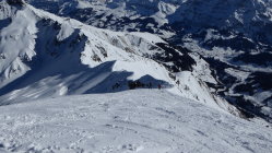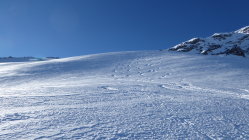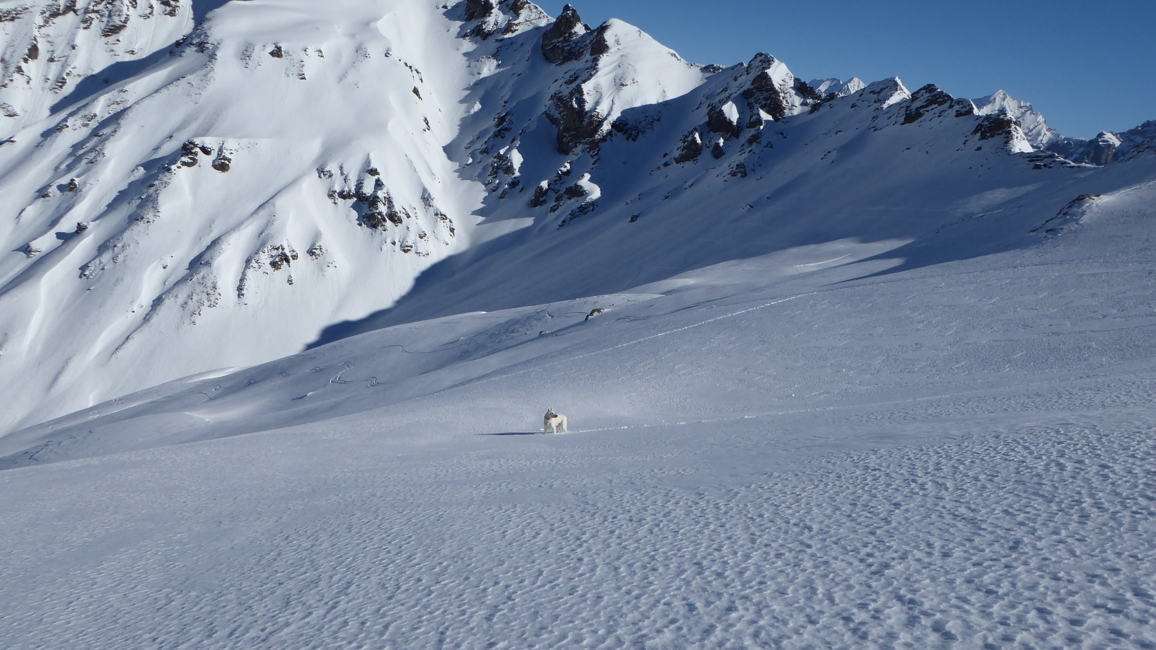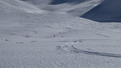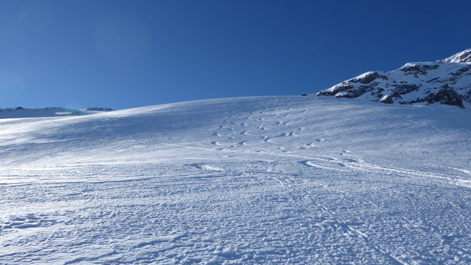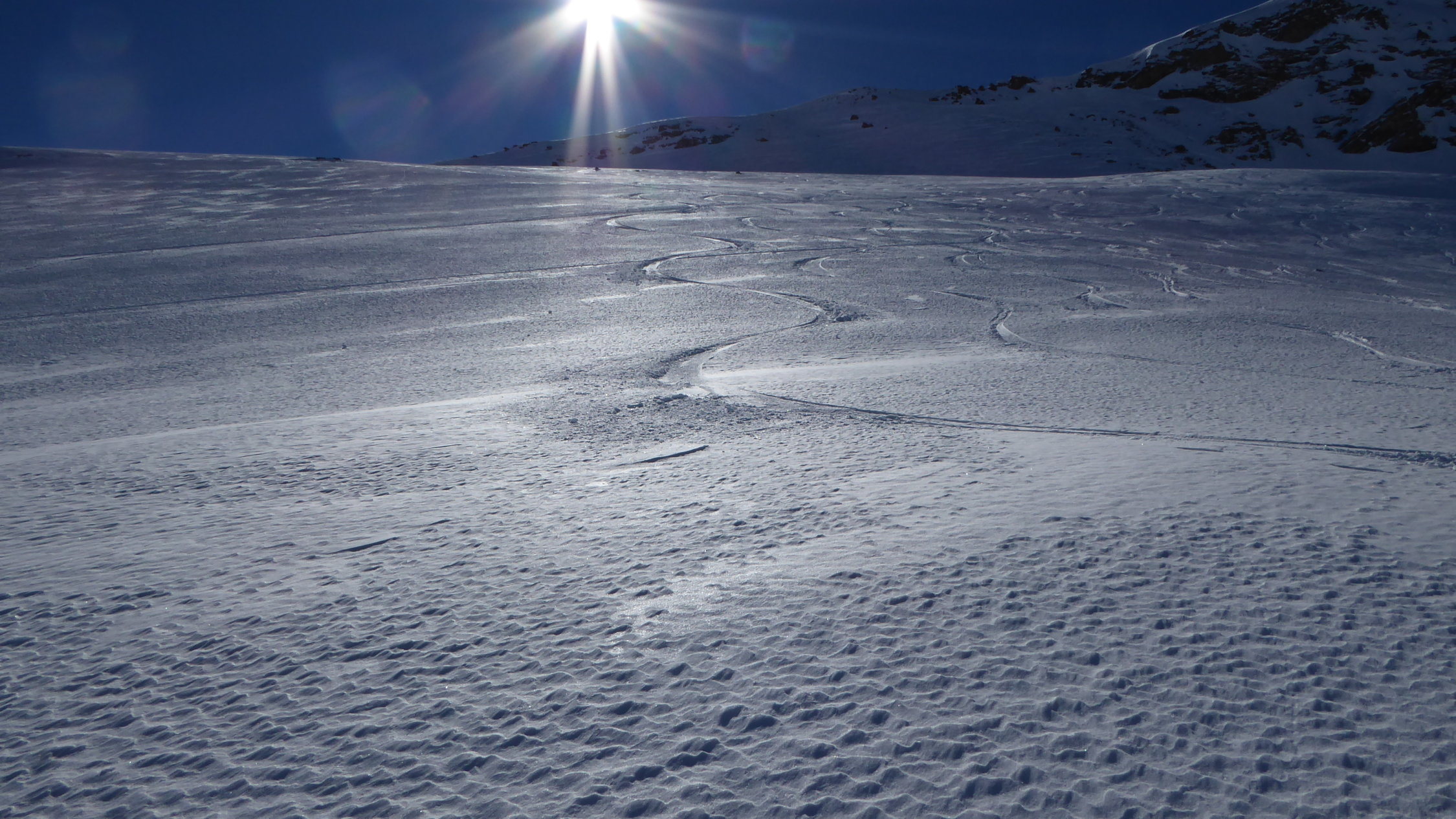 Es hat noch viel Platz für eigene Spuren. Bei der Abfahrt war heute der Wechsel von Pulver zu Nassschnee fliessend. Auf der Abfahrt durch die Osthänge habe ich keine einzige gedeckelte Stelle gefunden.