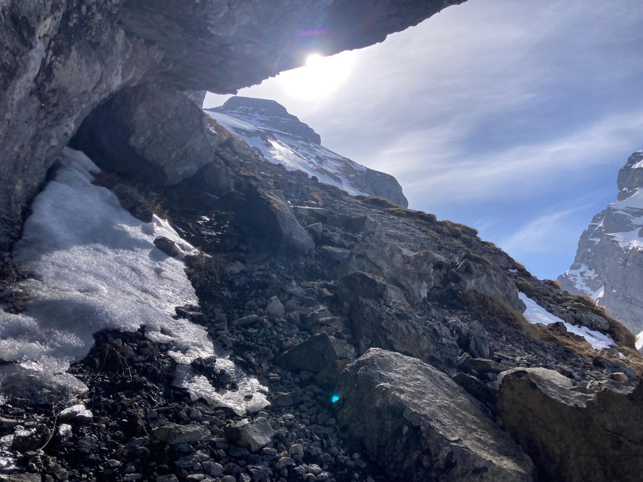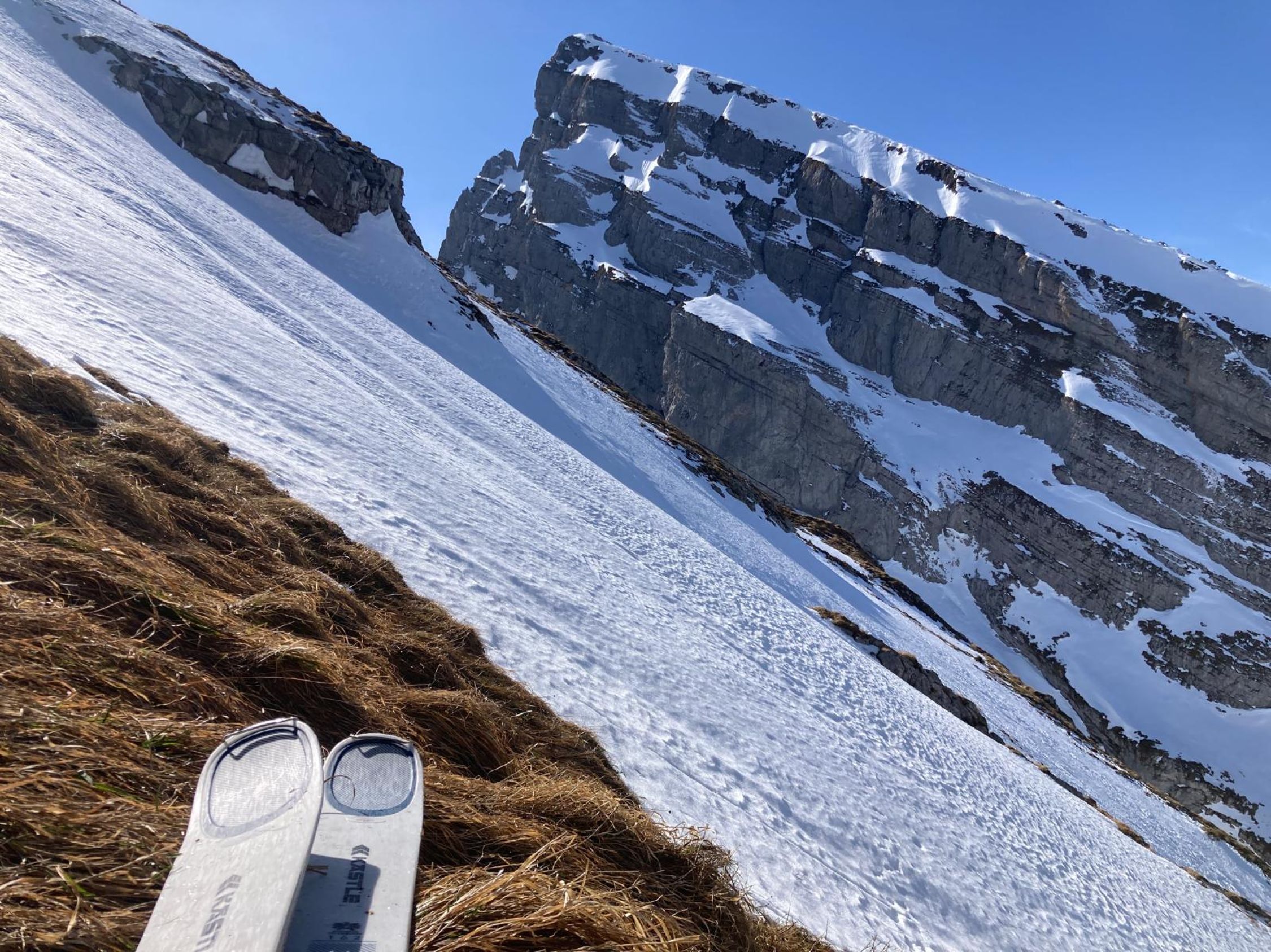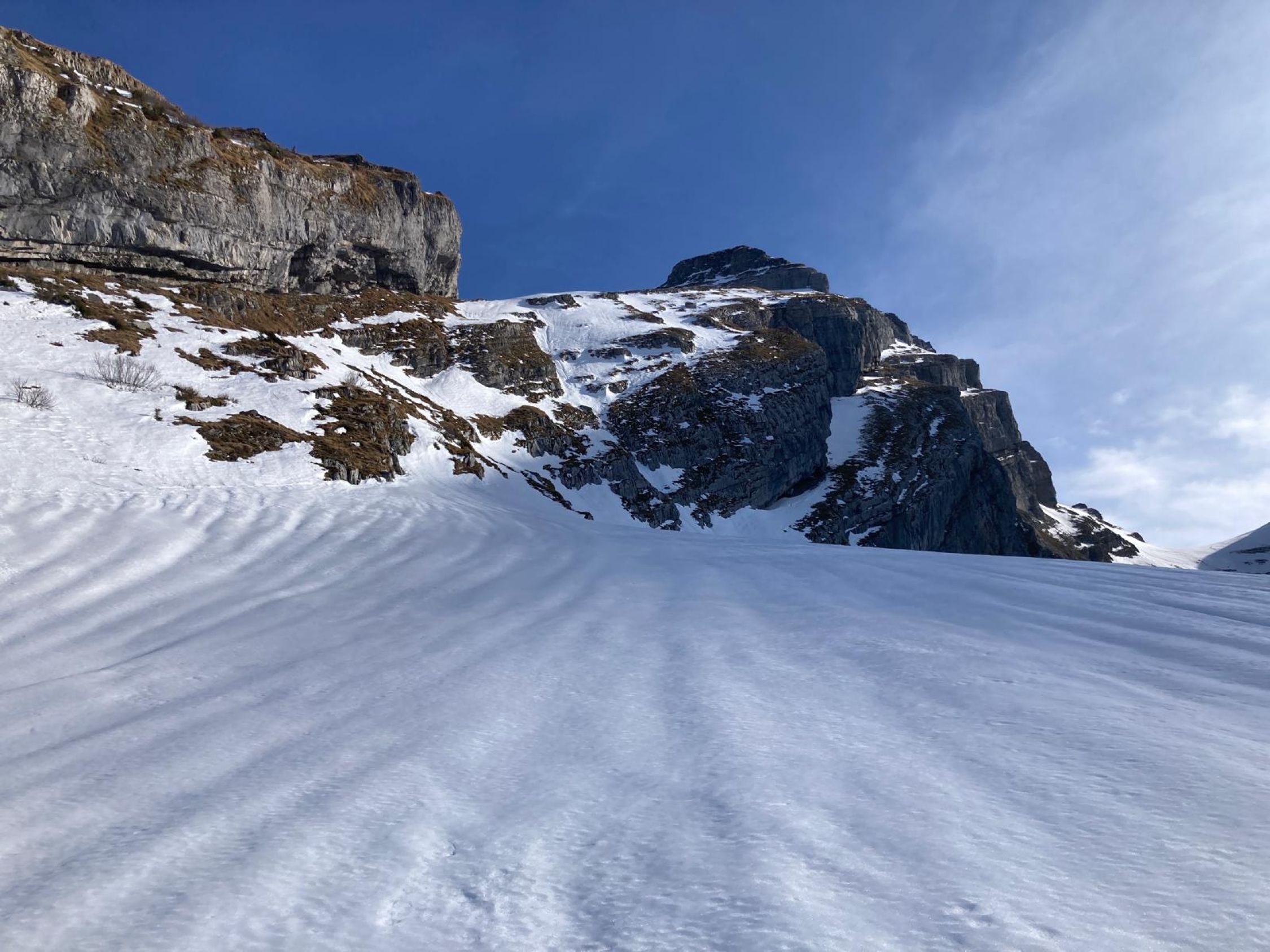 Auf der Tragestrecke unter dem Felsen lag fast kein Schnee, so dass der Wanderweg gut begehbar war. Viel glatter gepresster Schnee auf dem hängenden Karrenfeld, mit Harscheisen gut griffig. Gipfelanstieg problemlos. Abfahrt über den breiten Karrenfeld hang hart aber griffig, in der Rinne auf der Ostseite schön angesulzt. Genug Schnee auch im steilen unteren Teil bis zum Anfang des Stollentals. Rest bis zum Strichboden noch immer mit "Regenrinnen", aber schön angesulzt und leicht zu fahren.