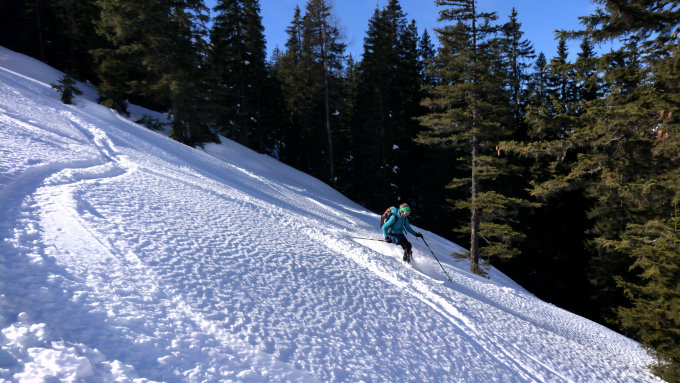 Pulverschnee nordseitig noch gut, SO-seitig und auch an steileren Westhängen gibts bereits einen nicht tragenden Harschdeckel.