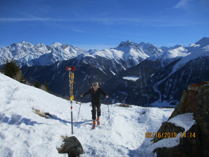 Aus der vereinbarten Startzeit zum Gipfel wurde anstatt 8 zwar 9 Uhr, doch tat dies den guten Schneeverhältnissen keinen Abbruch. Trotz frühlingshafter Erwärmung konnten wir nach klarer Nacht in einer gut durchgehärteten Spur aufsteigen und durch die freien Hänge anschließend schwungvoll wieder hinunterspurten. In ähnlicher Weise äußerten sich auch unsere beiden Skifahrer. Etwas mühsamer ließ sich dann der Abstieg von der Chamanna Cler bis hinab nach Bos-Cha an, wo sich über der zerfahrenen Schneedecke häufig eine Kruste gebildet hatte und es hin und wieder auch zu tieferem Einsinken mit den Schneeschuhen kam.