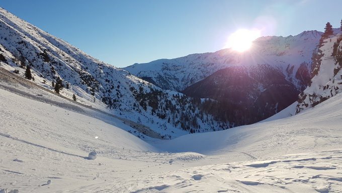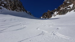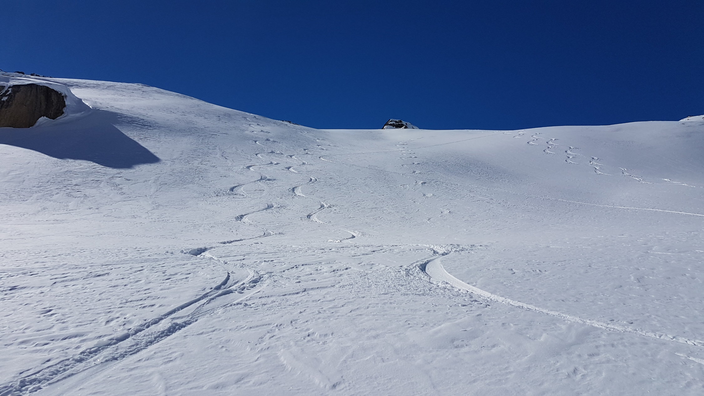 Ganz oben brettig, dann aber schöne Verhältnisse. Oft ein leichter Deckel, aber doch sehr gut fahrbar. Unten dann Sulzschnee.