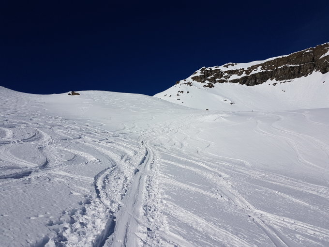 Genug Schnee, grösstenteils gute Spur bis auf den Gipfel, in der Abfahrt schattseitig noch gut Pulver, wenn auch schon viel verfahren.