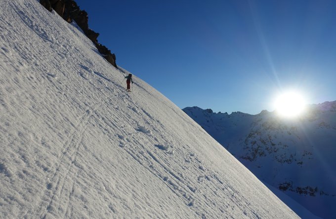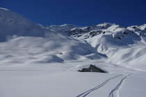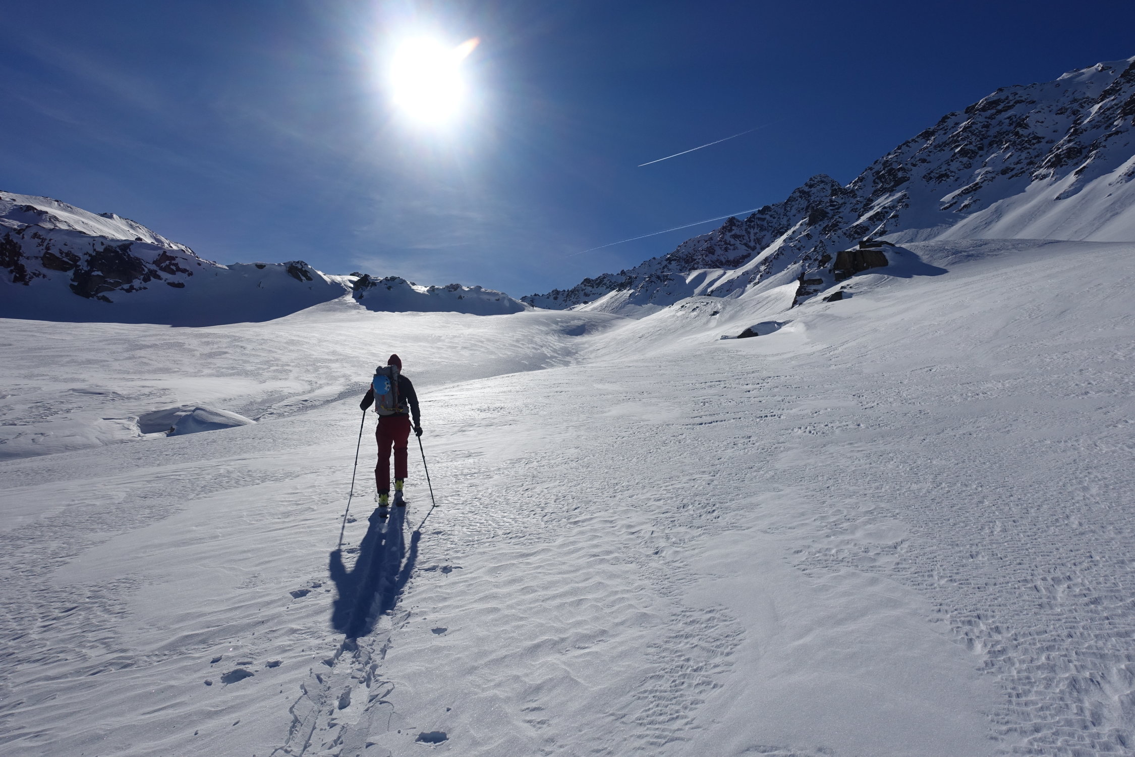 Die Grialetsch Hütte war ganz gut belegt, aber die meisten Leute starteten am nächsten Morgen in Richtung Scalettahorn, so dass wir im Anstieg zur Fuorcla Radönt wieder alleine waren und es auch keine Spur gab.