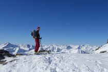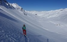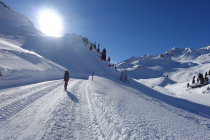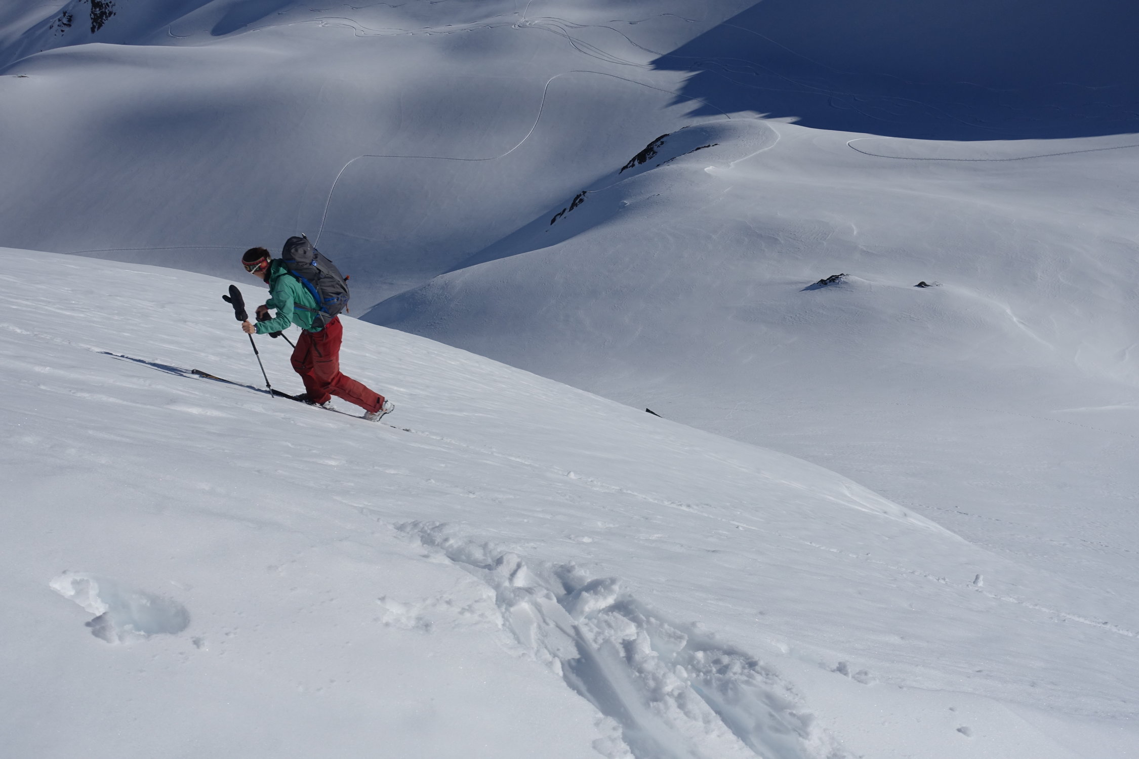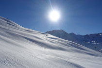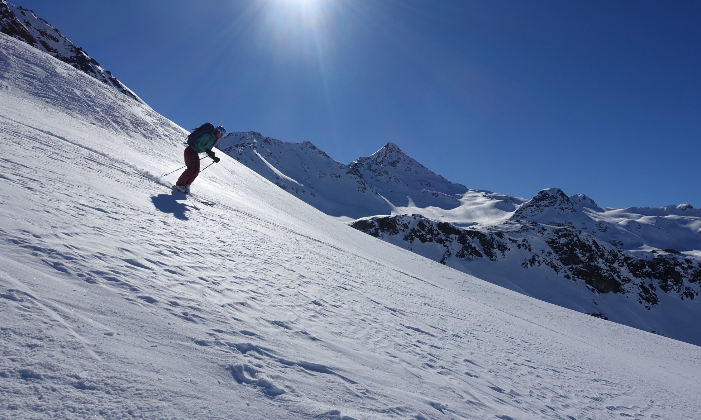 Die südseitigen Hänge waren früh am Morgen noch pickelhart gefroren und ohne Harscheisen wäre kein Durchkommen möglich gewesen. Ab der Fuorcla Radönt dann toller Pulver bis hinunter zur Paßstraße. Im Gegenanstieg dann gänzlich andere Verhältnisse. Aufsteig im T-Shirt, aber trotzdem fühlte man sich wie auf dem Grill. Bis zum Skidepot trafen wir eine Gruppe mit 3 Leuten, welche in Richtung Piz Champatsch unterwegs waren, ansonsten wieder einsame Ruhe. Das änderte sich ab dem Skidepot, am Flüela Wisshorn waren bestimmt 15-20 Leute unterwegs. Der Auf und Abstieg war problemlos mit Steigeisen und Pickel im besten Trittschnee zu bewältigen. Nun folgte eine tolle Abfahrt in Richtung Vereina Hütte. ...ab hier wieder alleine und absolut einsam unterwegs. Wir querten vorher im Gegenanstieg nach den Jöriseen noch etwas nach oben um einen weiteren Abfahrtshang in die Tour einzubauen zu können. In den nordseitigen Expositionen gab es nämlich immer noch traumhaften Pulverschnee. Den konnte man nicht so einfach lins, bzw. rechts liegen lassen. Für den letzten Gegenanstieg mit 800hm galt es nun noch mal die Kräfte zu sammeln. Da wir diesen aber im Schatten zurücklegen konnten und es auch eine Aufstiegsspur gab, verlief der Aufstieg recht problemlos. Oben an der Isenfürggli angekommen empfing uns wieder die Sonne. Was für ein toller Tag. Die Abfahrt in Richtung Tschuggen war sehr interessant. Von komplett durchfeuchtetem Nassschnee über Bruchharsch bis Traumpulver war alles dabei.