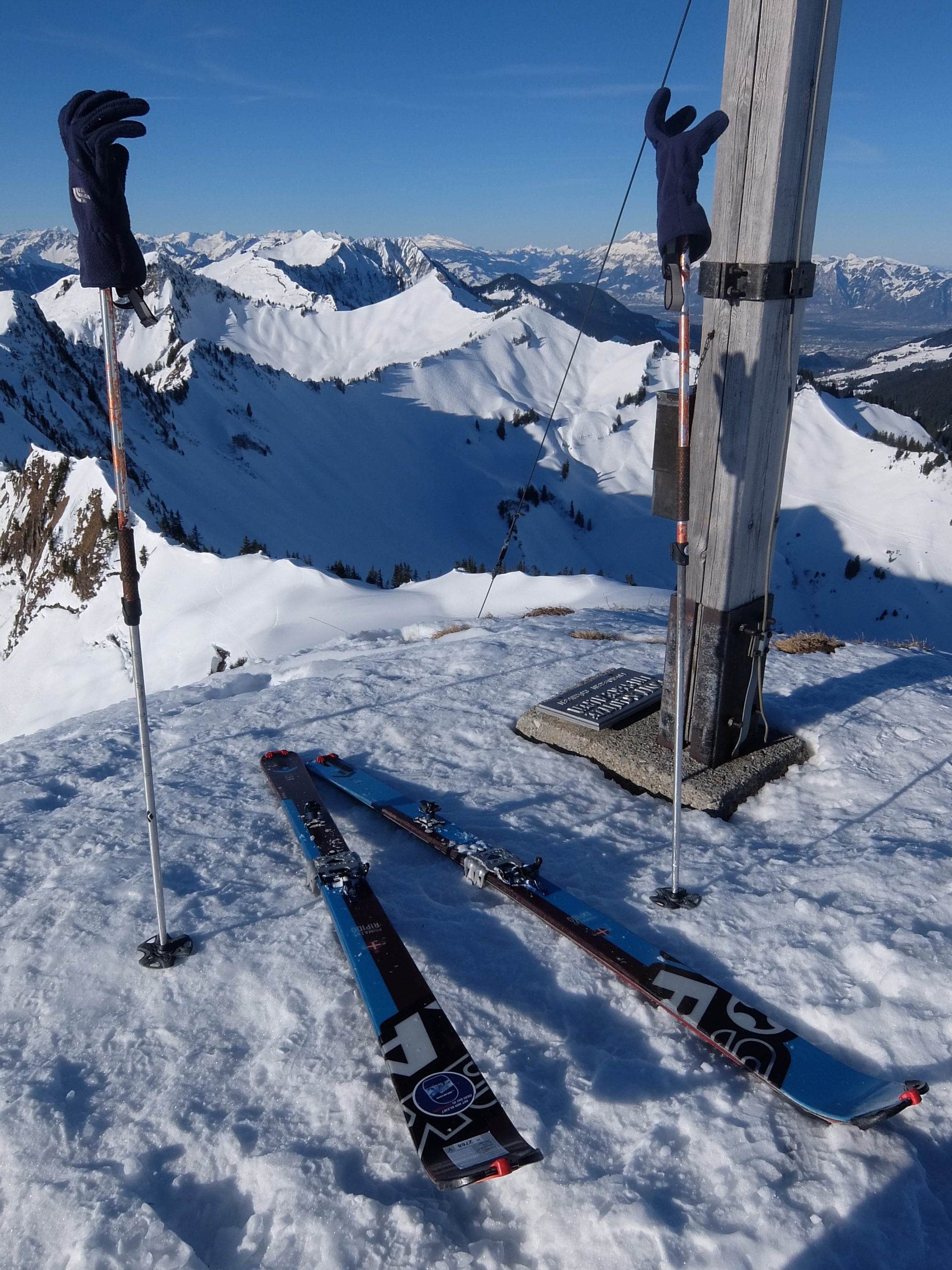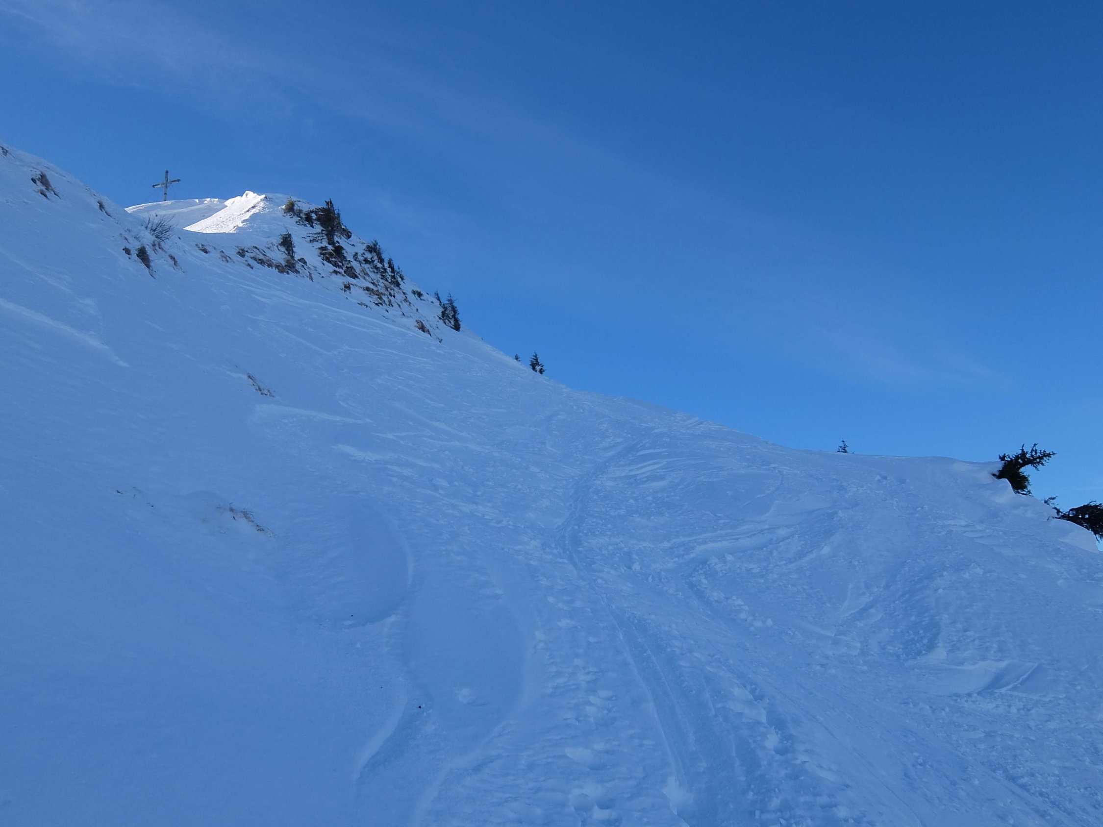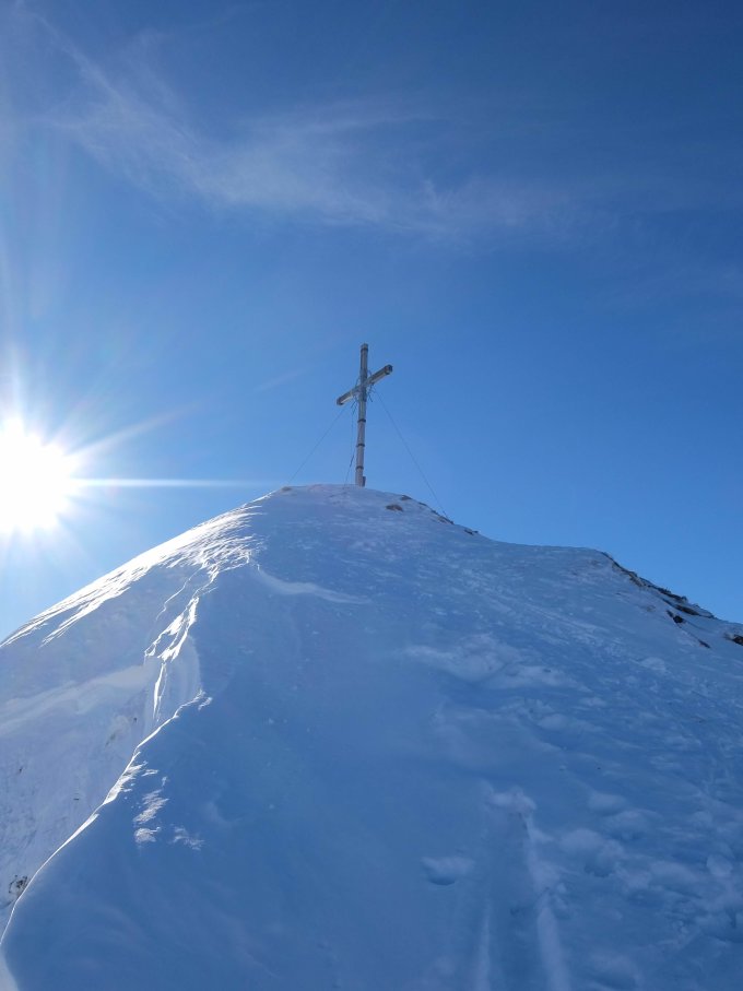 Ich war ein paar Mal auf der Löffelspitze, jedes Mal ist es ein besonderes Erlebnis, vom schattigen Hang in die Sonne zum Gipfel zu kommen. Man darf sich allerdings nicht zu sehr entspannen, man muss die steilen Hänge auch wieder runter. Heute waren die Verhältnisse aber so gut, dass das überhaupt kein Problem war, einfach nur schön. Zum ersten Mal ist mir auch der komplette Aufstieg mit Fellen gelungen, obwohl es zu Fuß wohl schneller gegangen wäre.