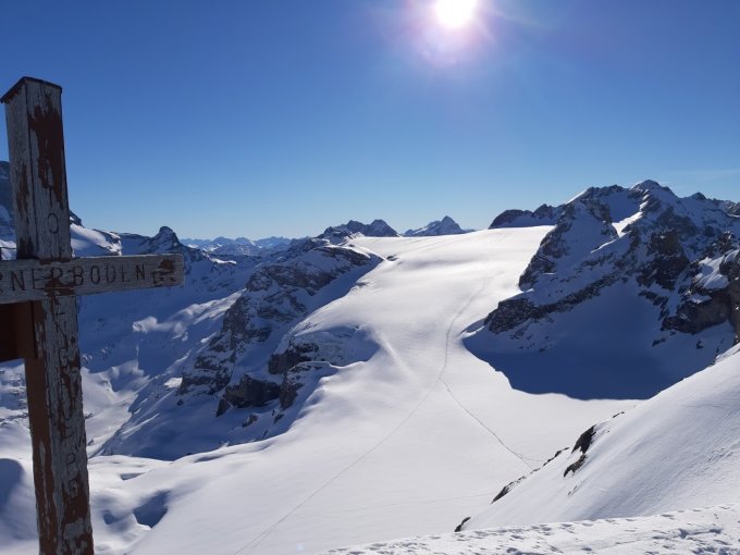 Bis auf den Gipfel etwas windgepresster Pulverschnee. Auf den Gipfelgrat ist die Kette frei und es liegt wenig Schnee. Der Schnee und Firn ist nicht besonders solide ist aber womöglich jetzt ziehmlich "Geputz".