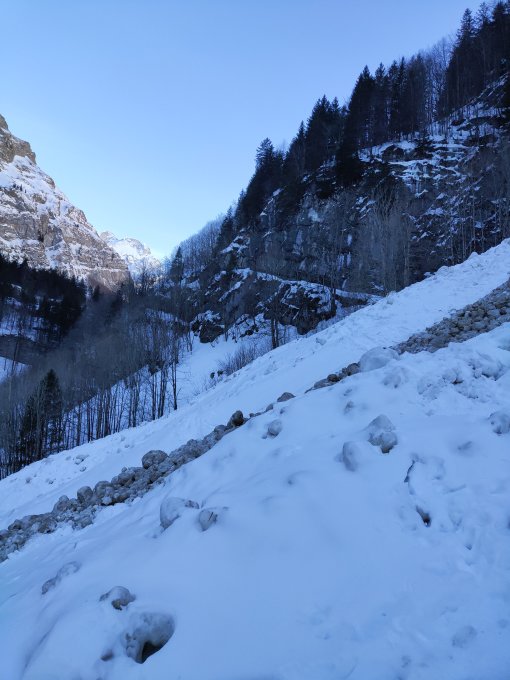 Die Steilstufe hinauf zum Gasthaus Mesmer ist nur im linken Teil des Tals begehbar da auch hier rechts Lawinenkegel den Aufstieg erschweren. Wir haben dort außerdem mehrere, allesamt kleine, Schneerutsche während unseres Aufstiegs beobachten können. Viele Spitzkehren in der steilen Passage sind erforderlich. Der Schnee hier ist griffig hart.