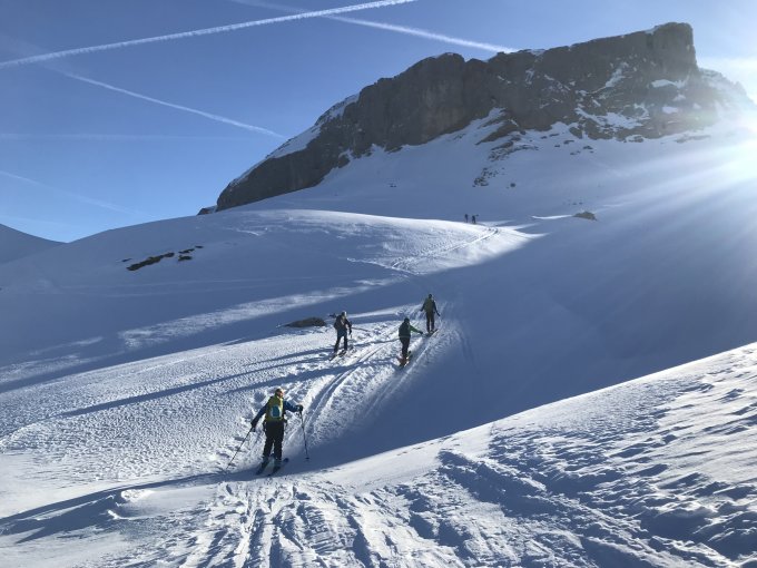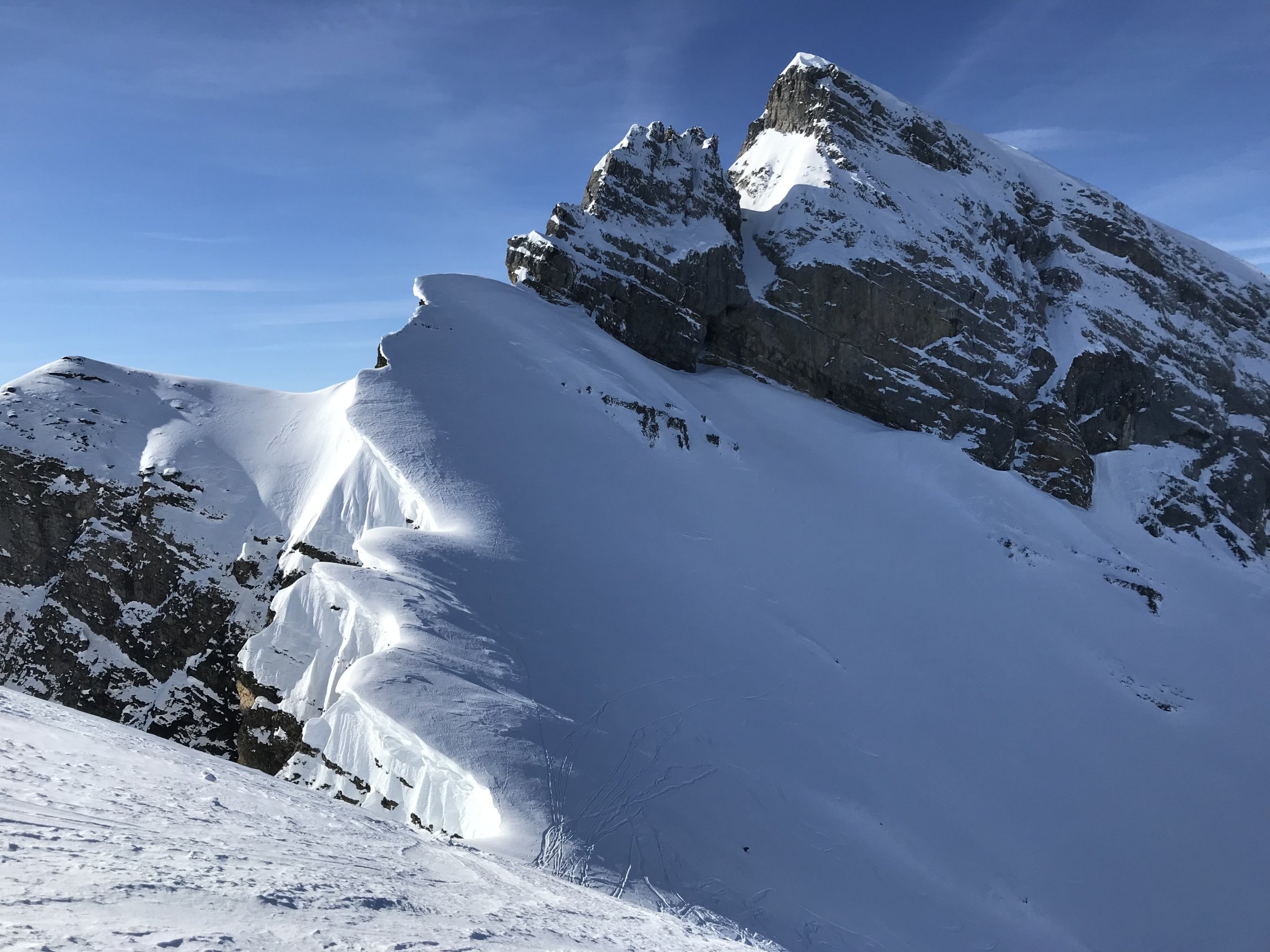 Der Anblick des Kaiserstocks mit seinen Schneewächten war wunderschön. Wenige Meter nach dem Sattel erreichten wir das Skidepot.