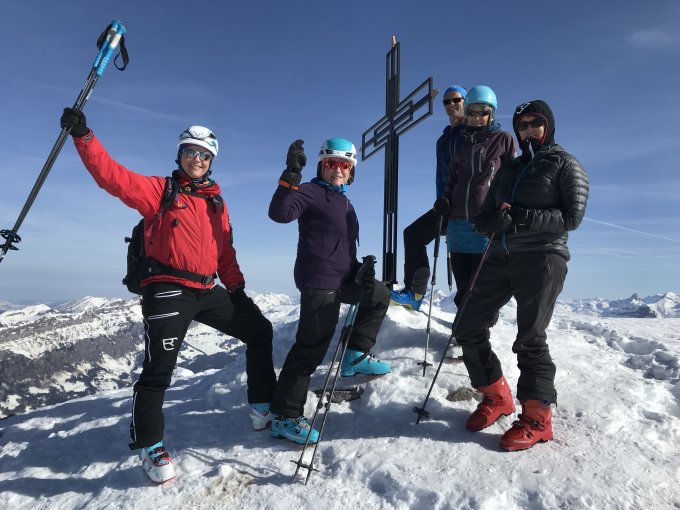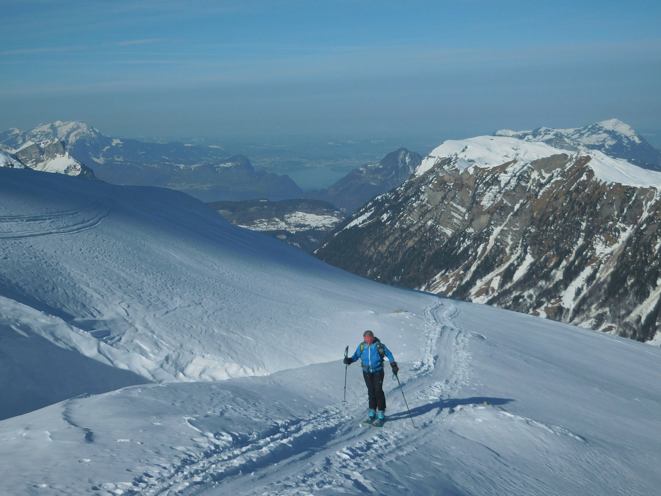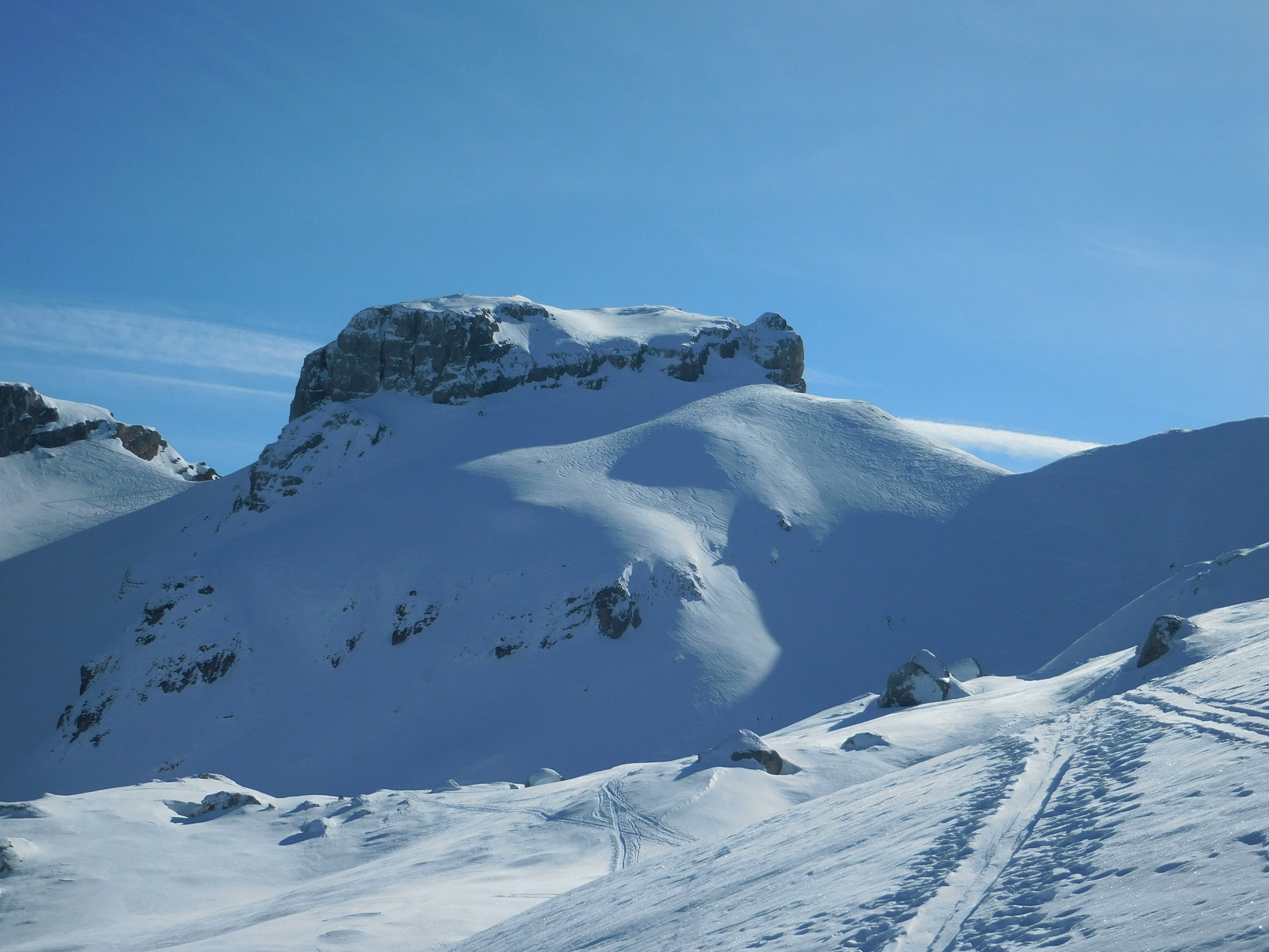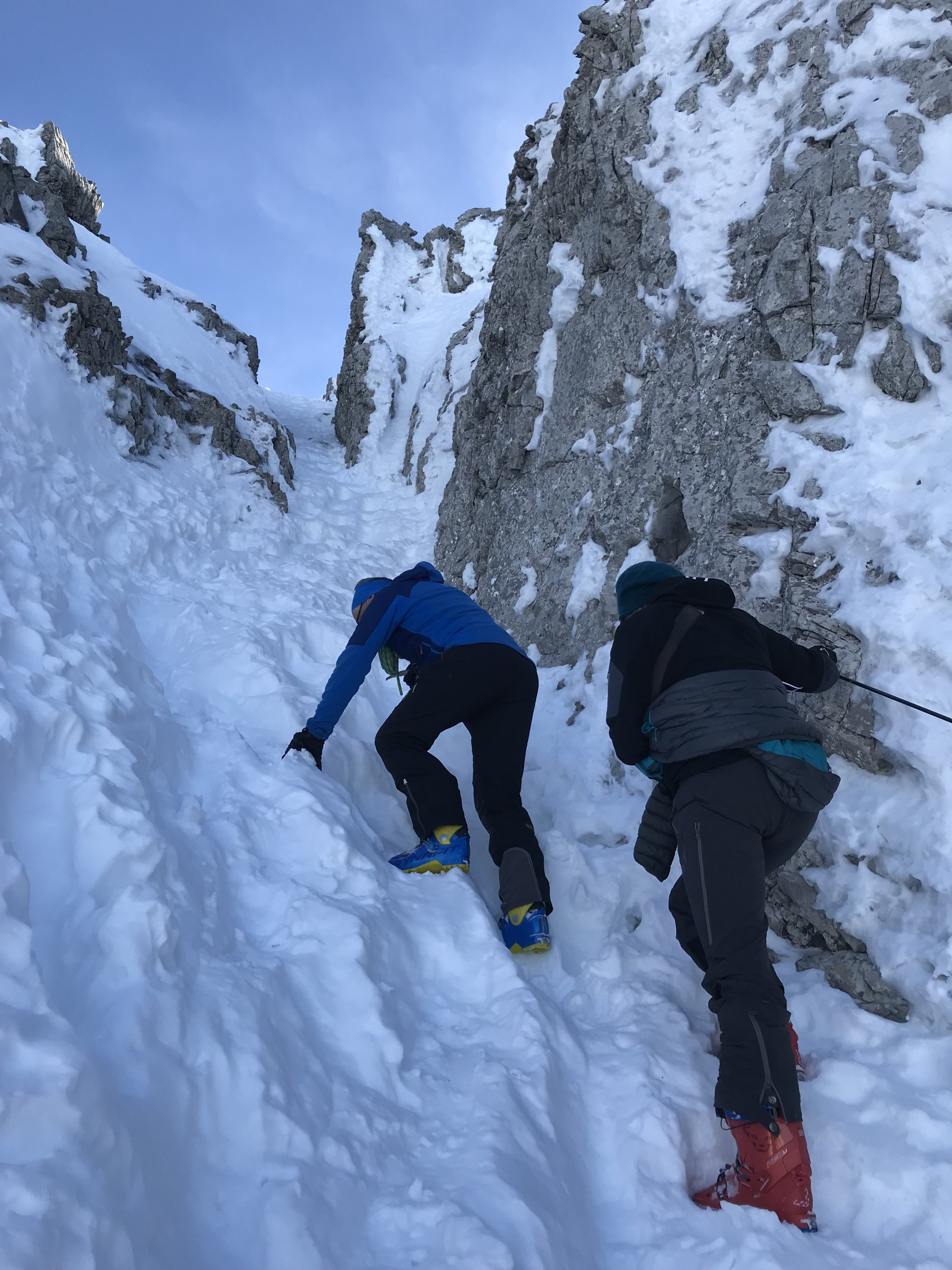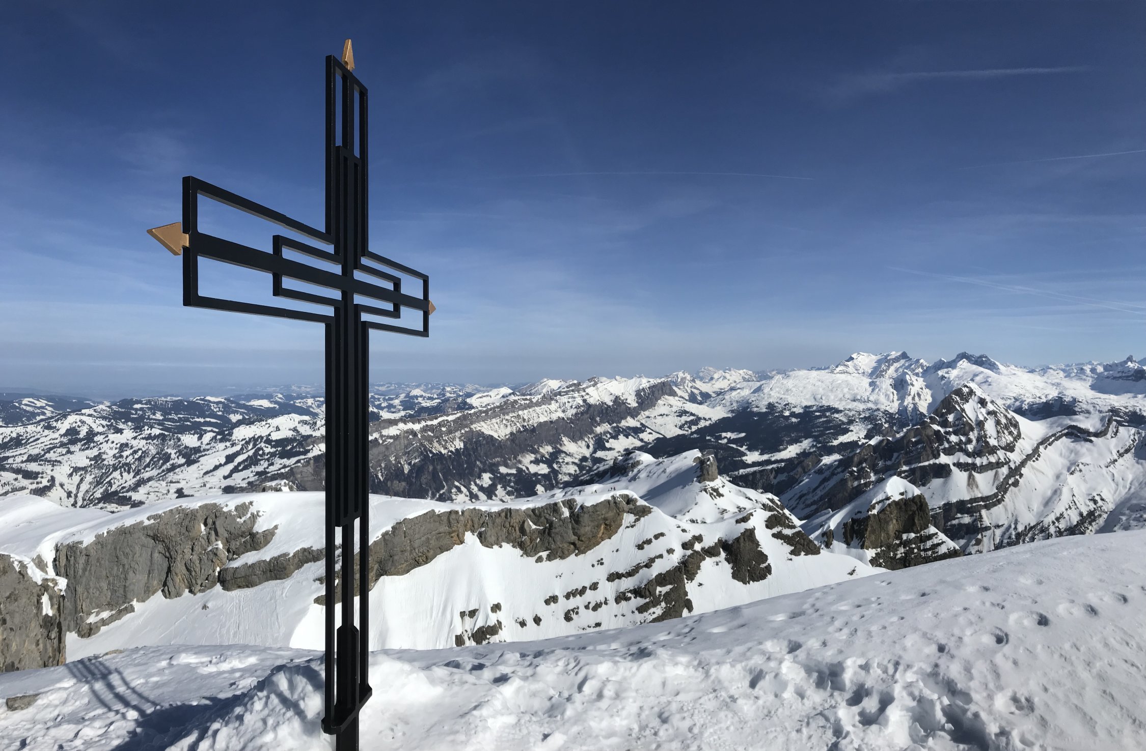 Von hief führt ein Couloir nach oben, das durch die Tritte und Stufen im Schnee sehr gut begehbar ist. Die letzten Meter zum Gipfel führen über eine flache Wiese und vom Gipfelkreuz aus sieht man sogar auf den Blüemberg hinunter.