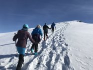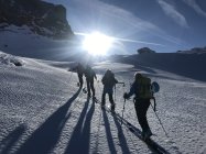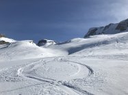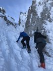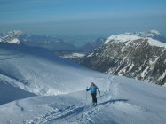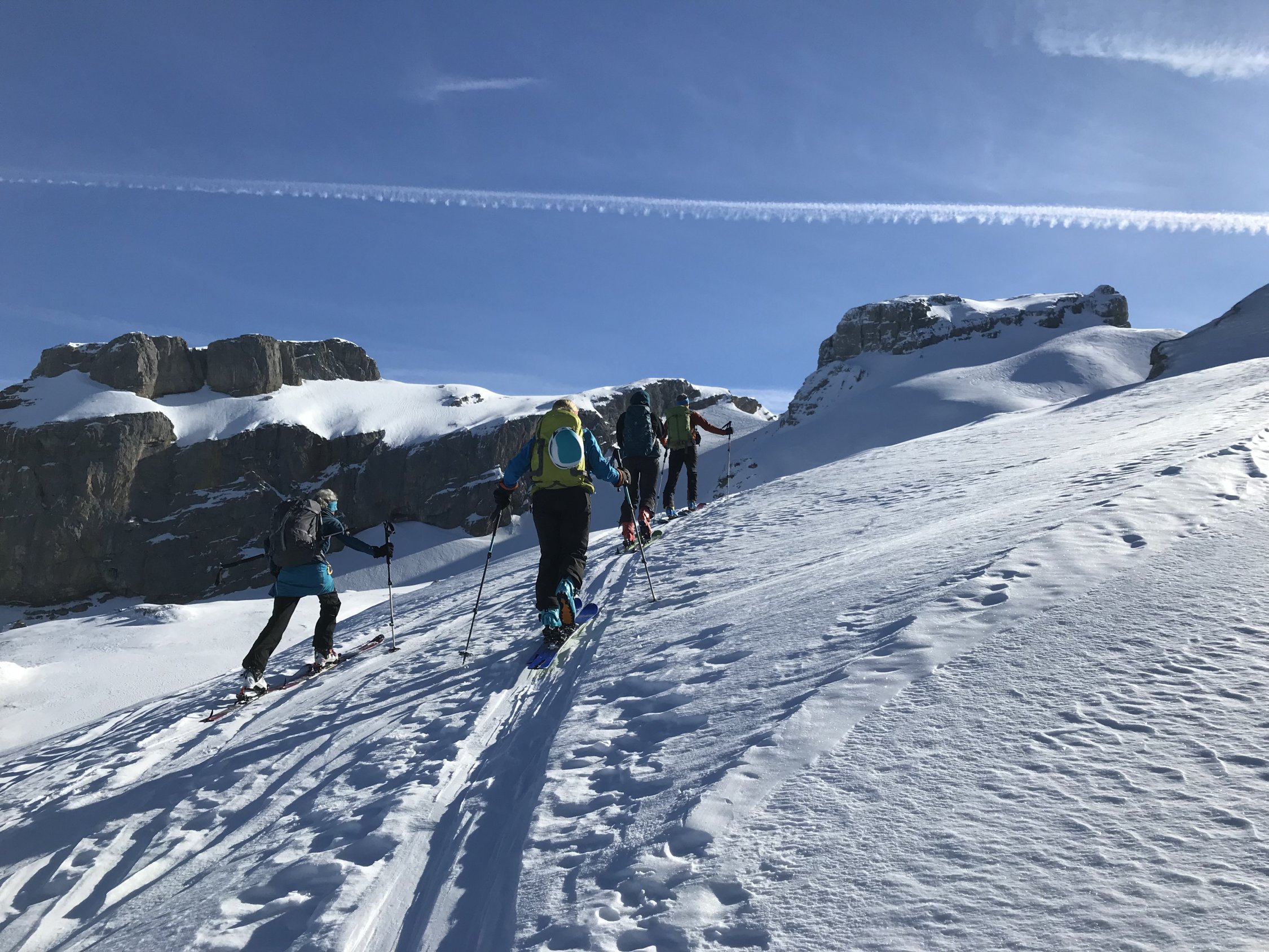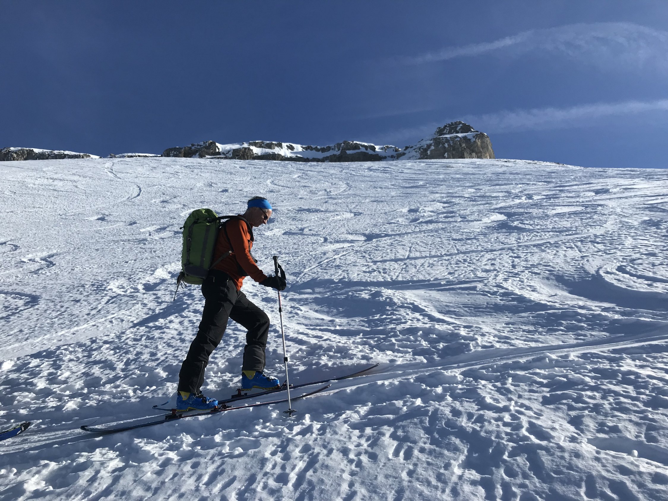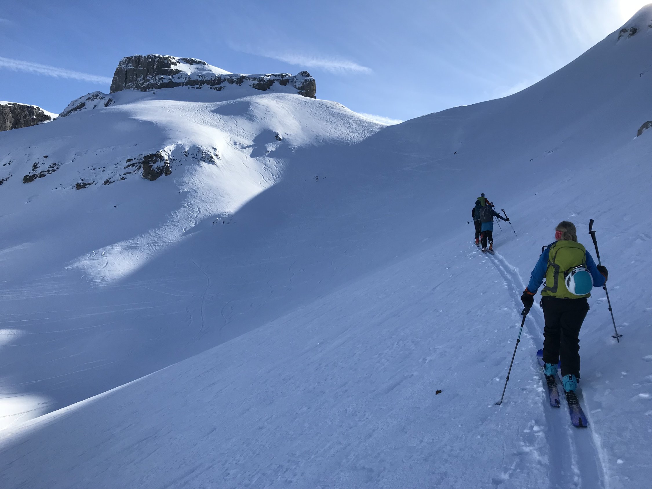 Der Hang bis zum Sattel zwischen Kaiser- und Kronenstock schien sehr steil zu sein, aber wir meisterten ihn mit wenigen Spitzkehren. Die vorhandene Spur war vereist, deshalb legten wir eine neue neue Spur im Tiefschnee an.