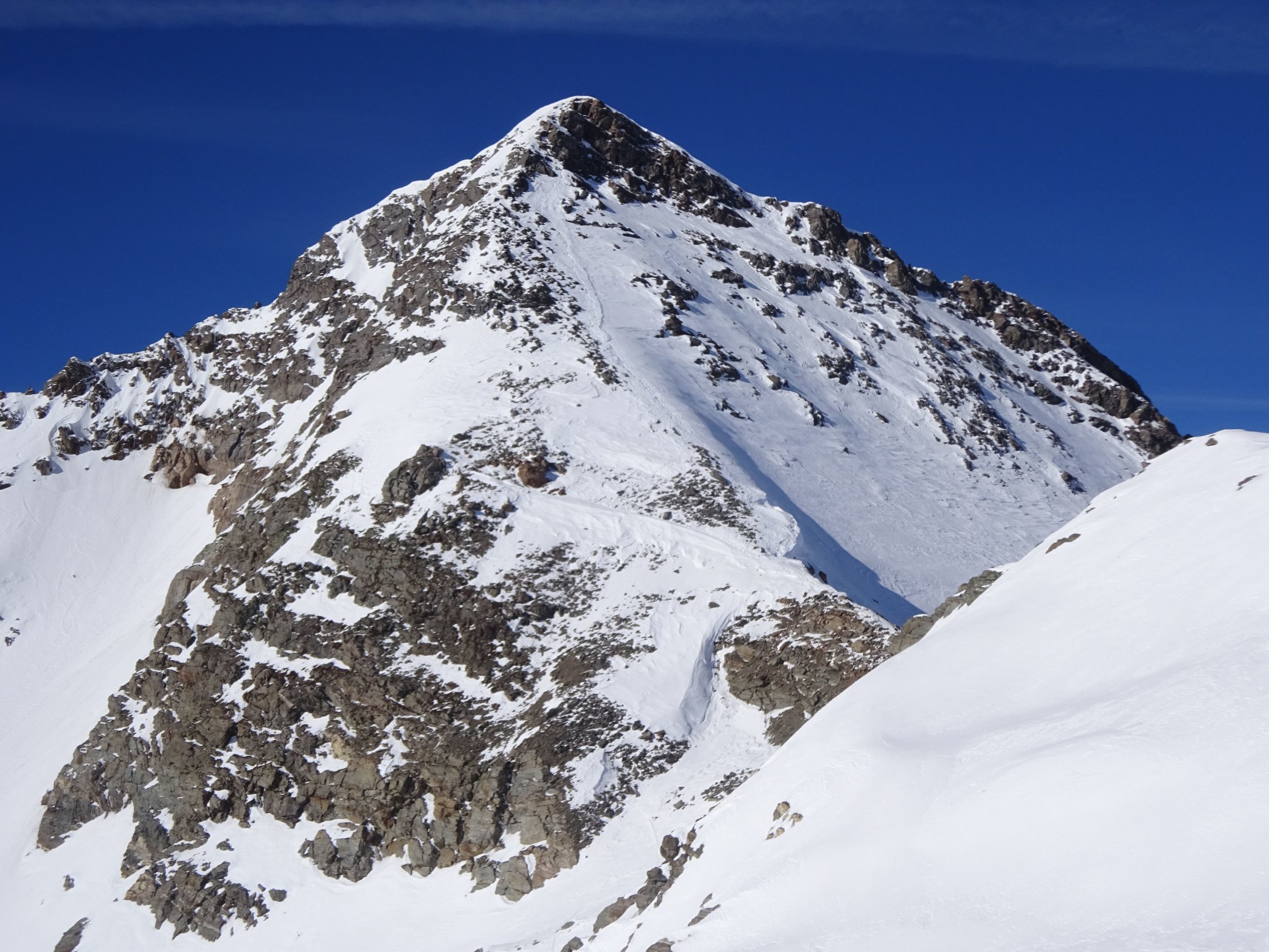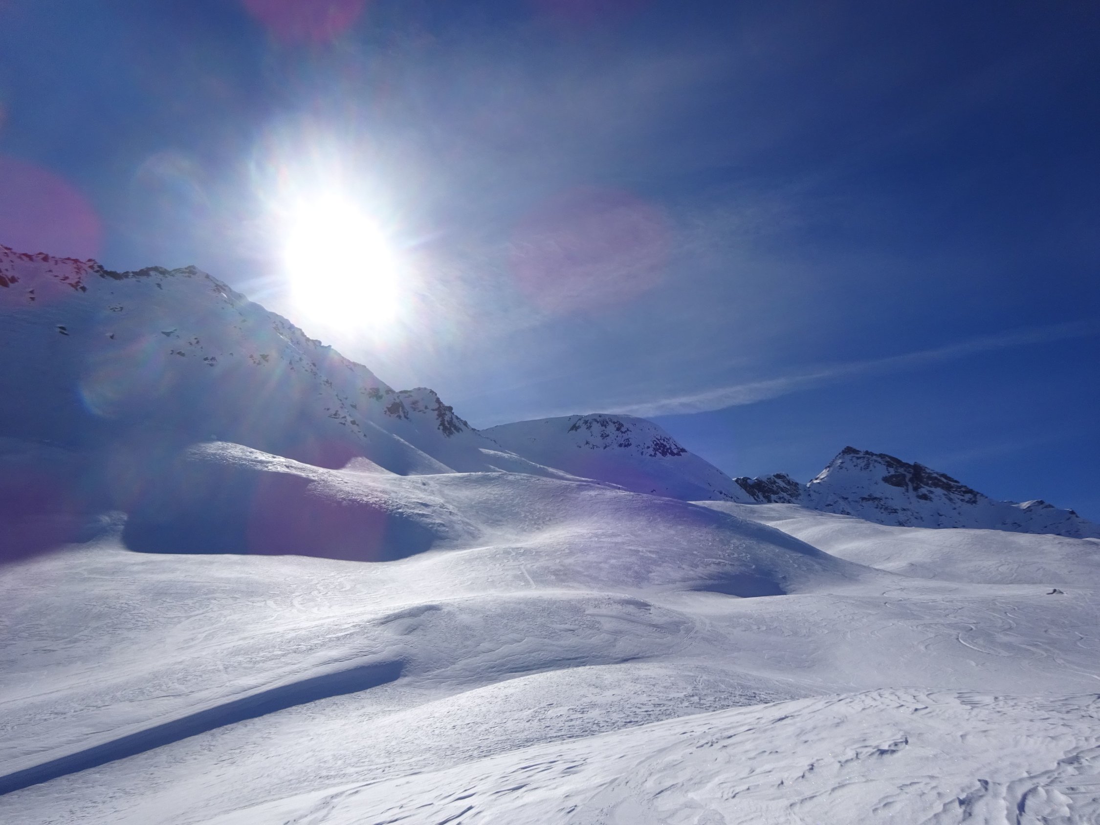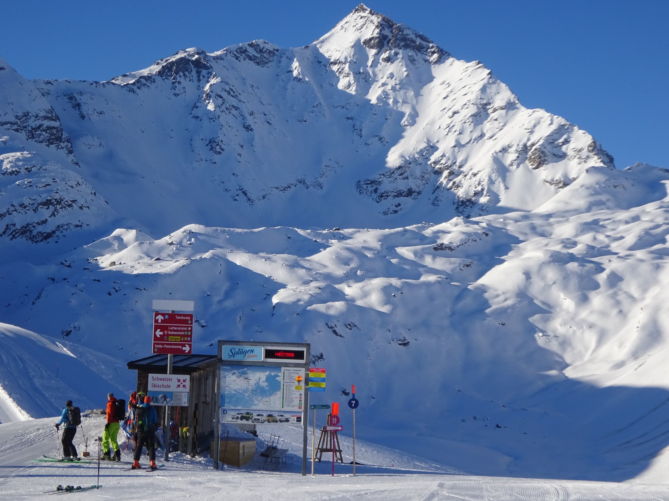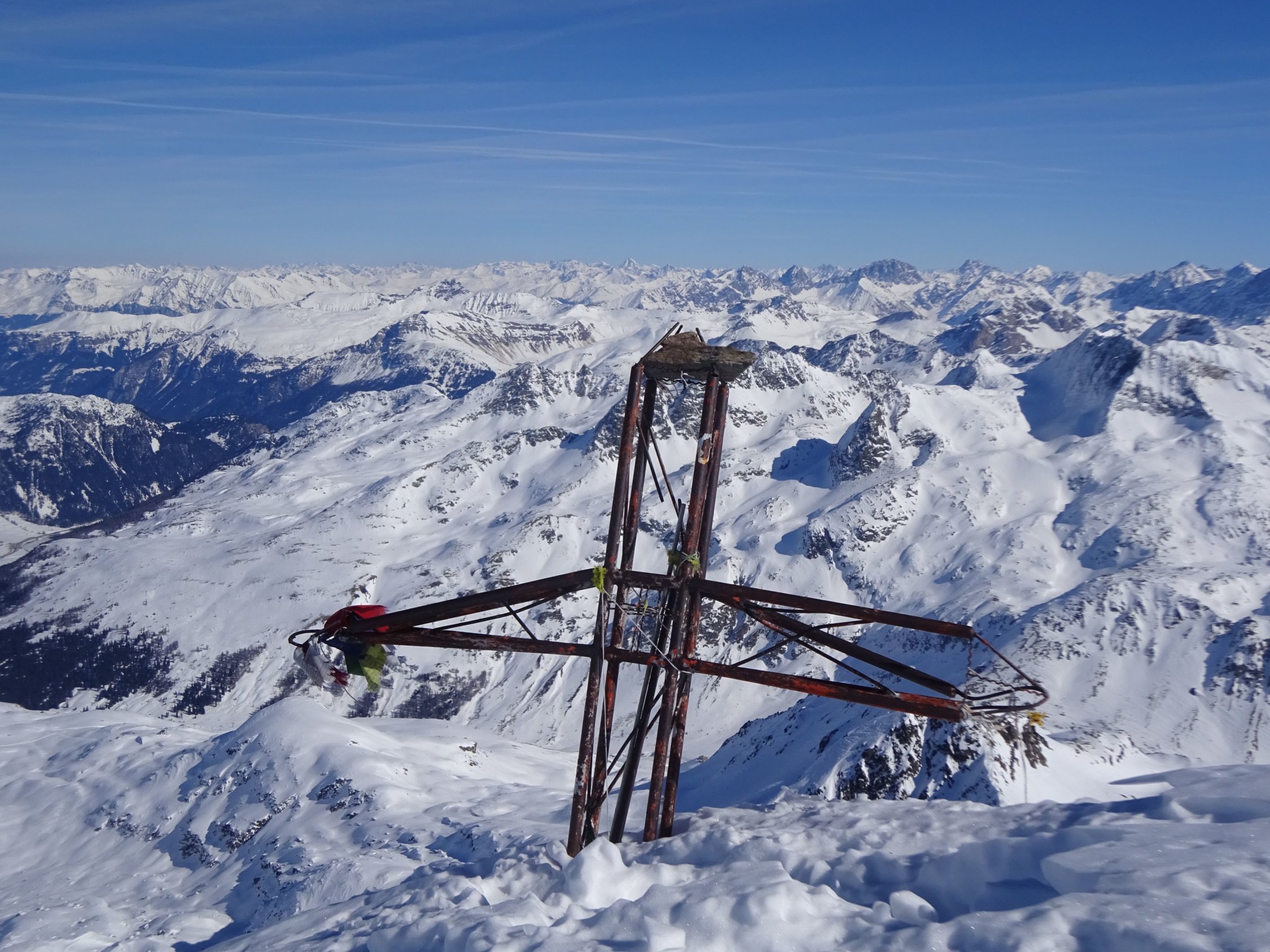 Mit Hilfe der Tourenkarte der Bergbahnen Splügen (Fr. 21.-) lässt sich ein respektabler Dreitausender mit nicht allzu grossem Aufwand erreichen. Nach dem Skidepot geht es aber kaum ohne Steigeisen und Pickel! Die Spur war teilweise etwas glasig; ich bin längere Abschnitte mit Harscheisen gelaufen. Vom Skidepot zum Gipfel guter Trittschnee und tiefe Tritte. Auf dem Gipfel warm und absolut windstill. Der Schnee ist allgemein windgepresst. Er trägt überall, ist aber ziemlich unregelmässig. Weiter unten ist er besser als oben, wo der Wind kräftig gewirkt hat. Trotz der hohen Temperaturen hat es kaum aufgefirnt.