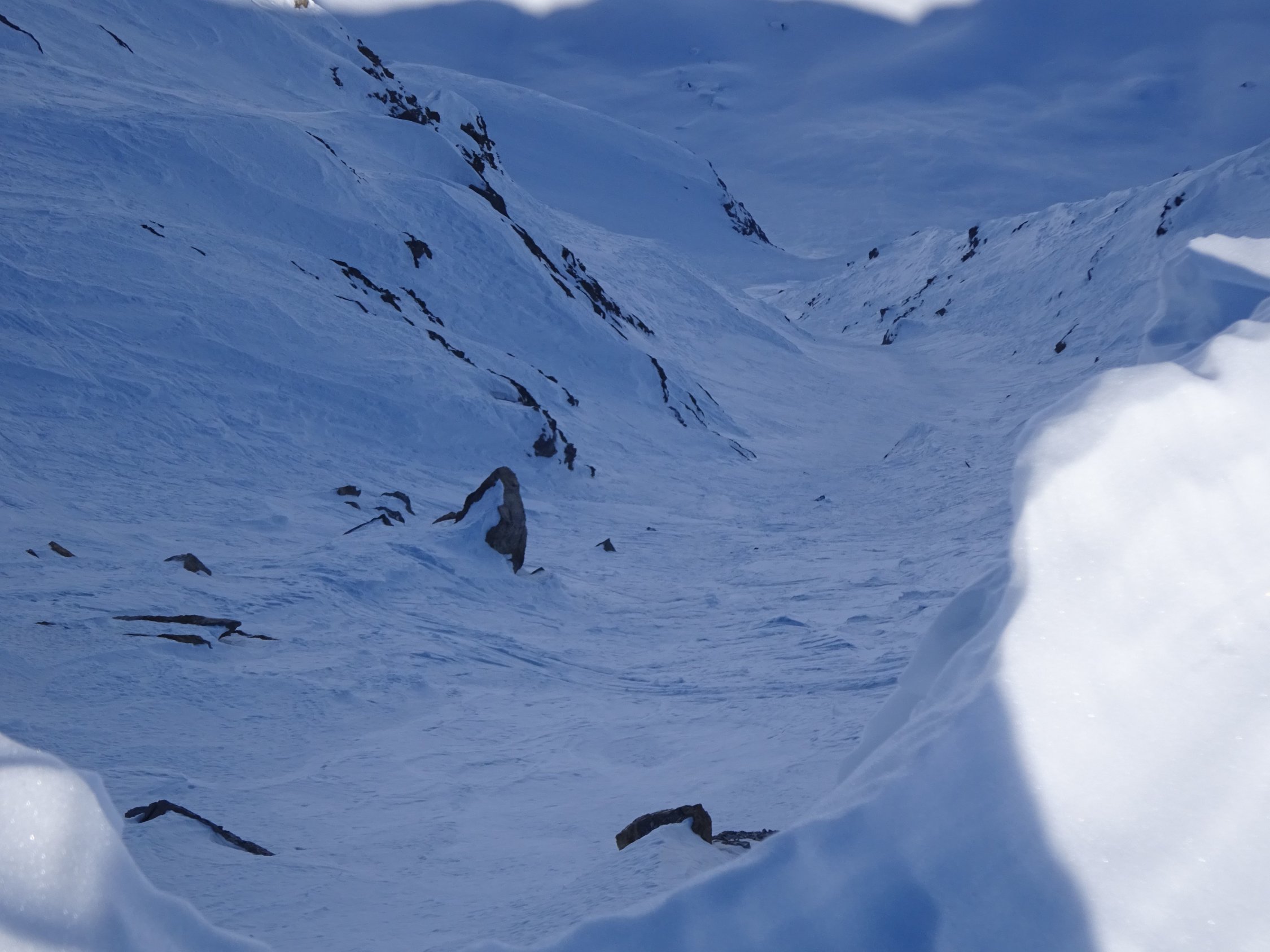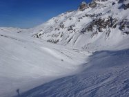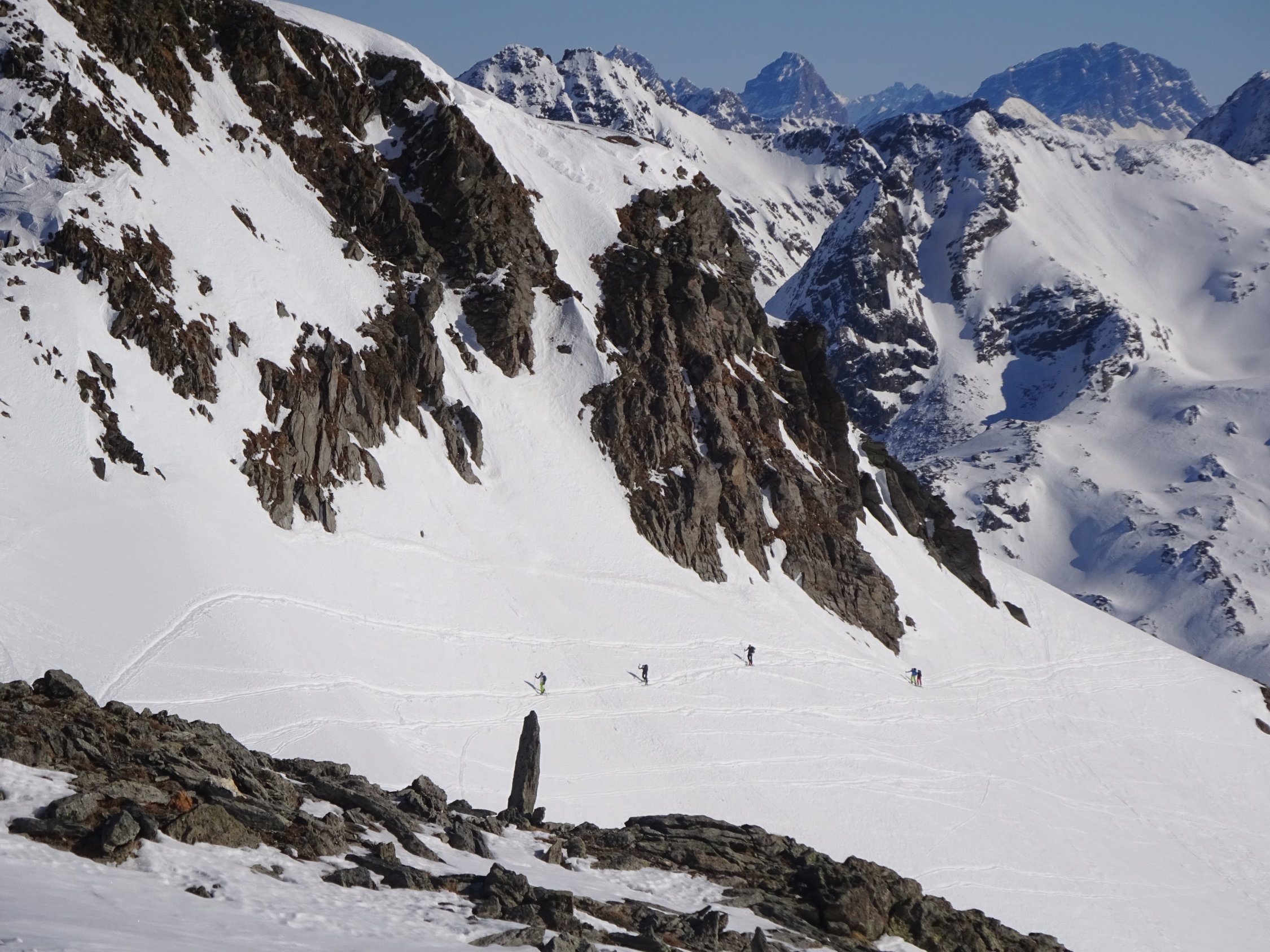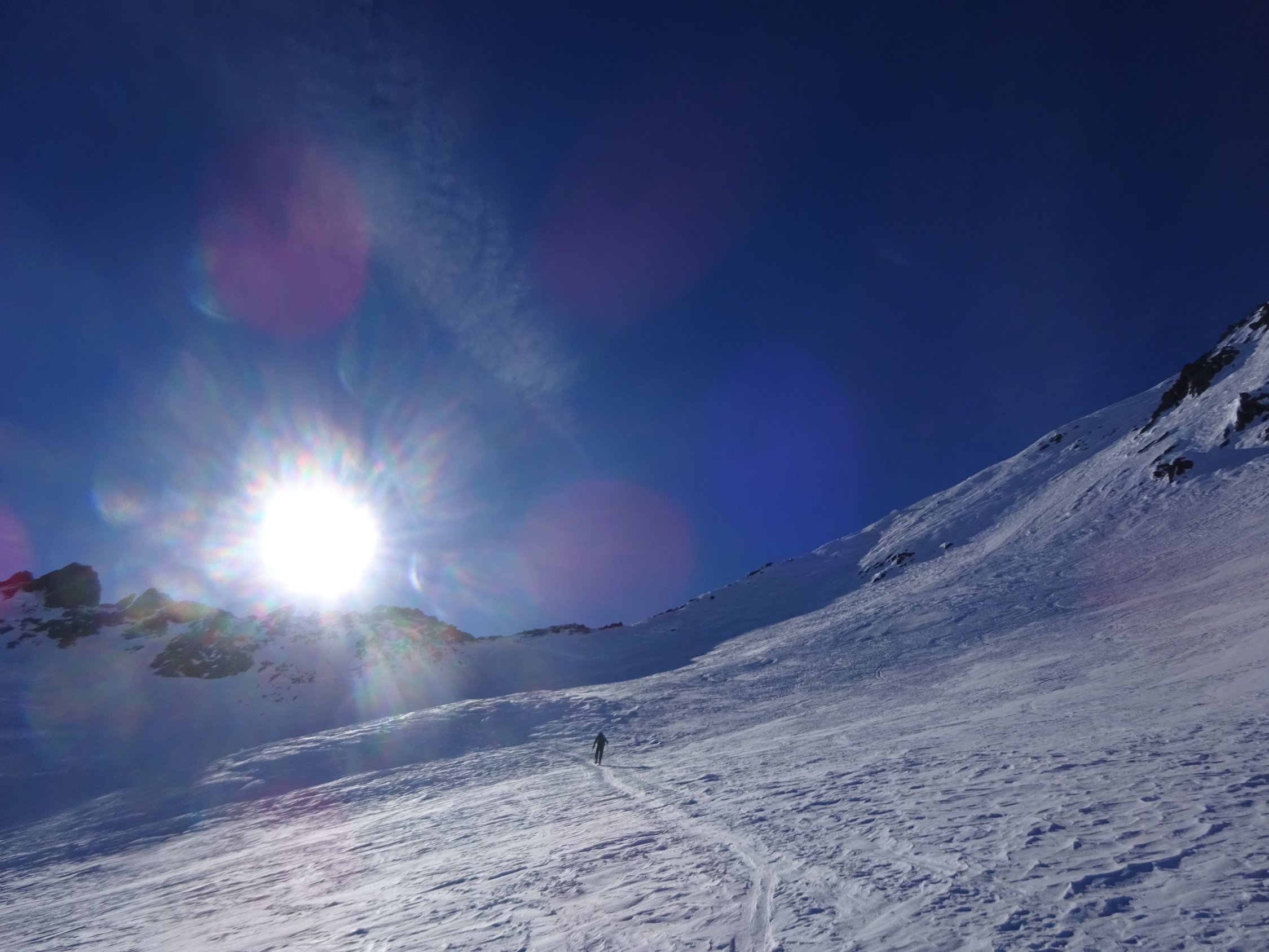 Mit Hilfe der Tourenkarte der Bergbahnen Splügen (Fr. 21.-) lässt sich ein respektabler Dreitausender mit nicht allzu grossem Aufwand erreichen. Nach dem Skidepot geht es aber kaum ohne Steigeisen und Pickel! Die Spur war teilweise etwas glasig; ich bin längere Abschnitte mit Harscheisen gelaufen. Vom Skidepot zum Gipfel guter Trittschnee und tiefe Tritte. Auf dem Gipfel warm und absolut windstill. Der Schnee ist allgemein windgepresst. Er trägt überall, ist aber ziemlich unregelmässig. Weiter unten ist er besser als oben, wo der Wind kräftig gewirkt hat. Trotz der hohen Temperaturen hat es kaum aufgefirnt.