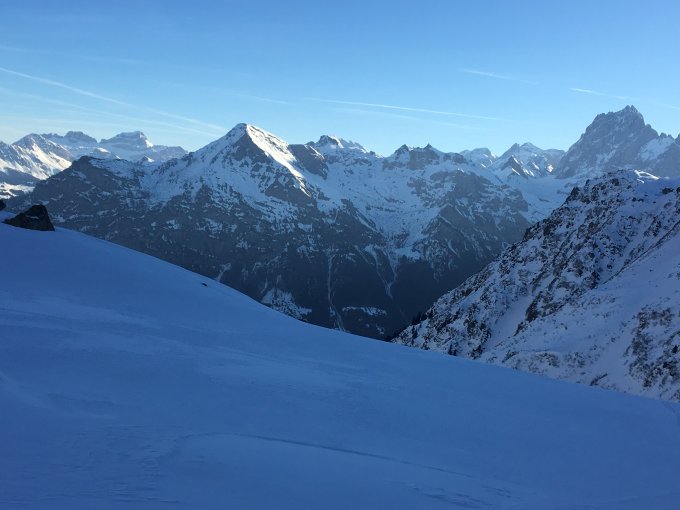 Start Bodenberg 7:00 bei -1 Grad. Ab Start gut gesetzter Pulver. Vorhandene Spur tendenziell zu steil (besser mit Harscheisen). Auf eigener Spur ohne Harscheisen. Sehr schöner Auffstieg bis Ellbogen, Waldtraverse eisig (Ich habe die Ski 50 m getragen und auf das Montieren der Harscheisen verzichtet. Bis auf einige wenige Löcher hat das der Spur nicht wesentlich geschadet.). Weiterer Aufstieg bis Hütte Pulver bzw. Presspulver. Abfahrt See feinster Pulver. Bis dahin alles im Schatten. Spur durch Männdlitelti rutschig, hier mit Vorteil auf eigener Spur. Presspulver, stark windbearbeitet. Glattfirn eebenfalls Presspulver, Gipfelflanke Krönten Pickelhart, ohne Harscheisen bis gegen 3000 m.