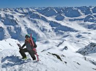 Da ich bei einem Sturz am Vortag das Lawinengerät verloren hatte, musste ich nochmals hoch. Wir sind mit den Skis bis 10m unter den Gipfel Isentällispitz augestiegen und ganz vom Gipfel abgefahren, was nicht immer möglich ist. Aber der Schnee war sehr griffig. Ca. 40 Grad steil.