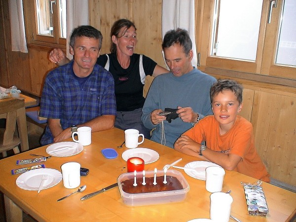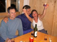 Der Tourenstress ist schuld, dass Annis 40-Jahr-Feier erst heute seinen Eintrag findet. Sorry vielmals. Gut gelaunt startet der harte Kern unserer Tourenclique mit schwerem Gepäck von Kops aus, Richtung Heilbronner-Hütte. In den Rucksäcken findet sich allerlei marscherschwerendes Material. Ein halber Keller edelster Rotweine, Sekt, Kaffee und Kuchen, köstliche Zutaten für ein dreigängiges Abendmenü, ein Kassettenrecorder und was man sonst noch so alles braucht, für den Hüttenzauber und das Gipfelglück. Nach etwa 2 Std. erreichen wir das Winterhaus der Heilbronner-Hütte (28 Lager, gemütliche Stube mit Kachelofen und Holzherd). Das Wetter ist etwas unbeständig, bisweilen regnet es leicht und so bietet sich als idealer Hüttengipfel der Nördl. Stritkopf an. Wir wandern an den Scheidseen vorbei und steigen dann weglos, aber unschwierig, über die Südostabdachung zum höchsten Punkt (ca. 1 Std. von der Hütte). Am Gipfel befinden wir uns genau auf der Grenze zwischen Vorarlberg und Tirol. Als das Wetter zunehmend unlustiger wird, ziehen wir uns in die Hütte zurück und heizen dort jetzt richtig ein. Anni verwöhnt uns mit ihren ausgezeichneten Kochkünsten. Mit lustigen Spielen, Musik und Tanz, Fredi's Mitternachtsshow und mit viel süffig Flüssigem, feiern wir Anni's 40er bis tief in die Nacht hinein. Anni ... so jung komma nimmer mehr zsamm. Es war ein SUPER FEST !!!