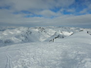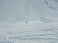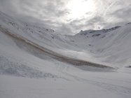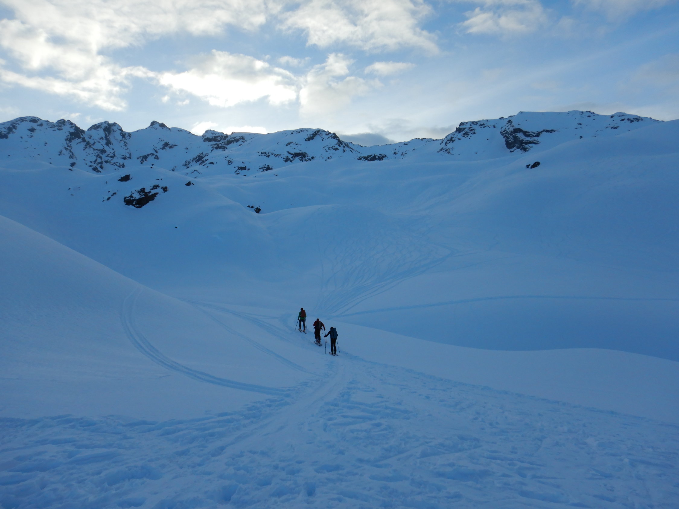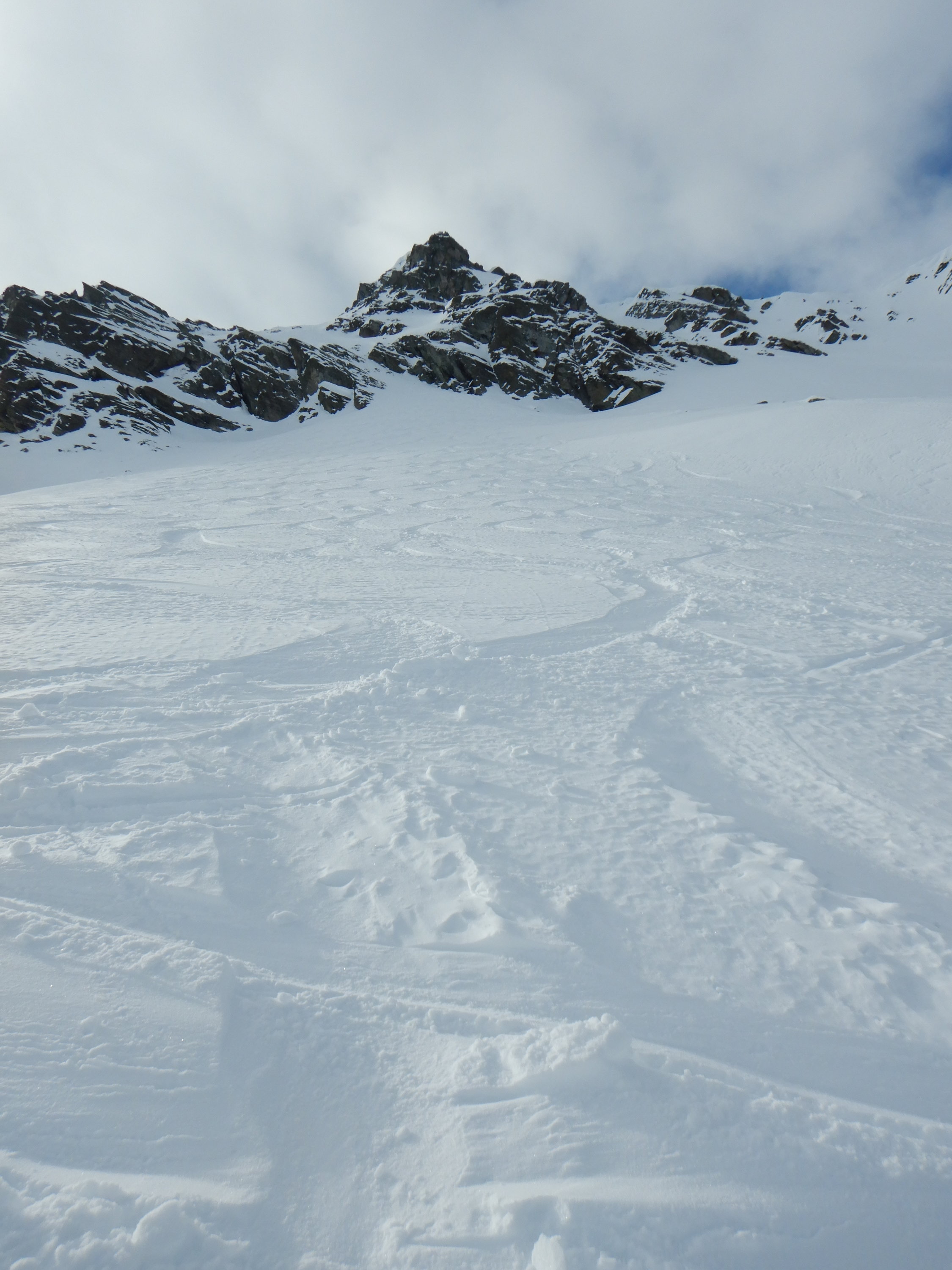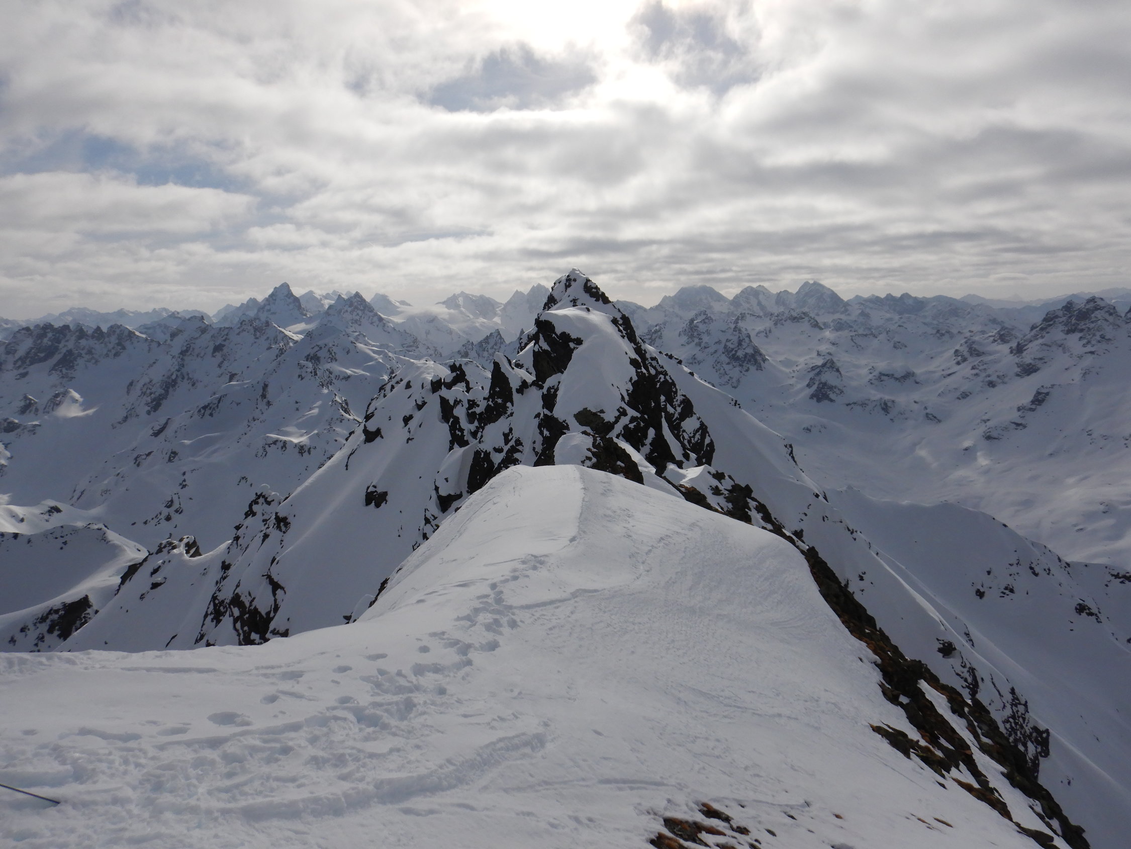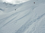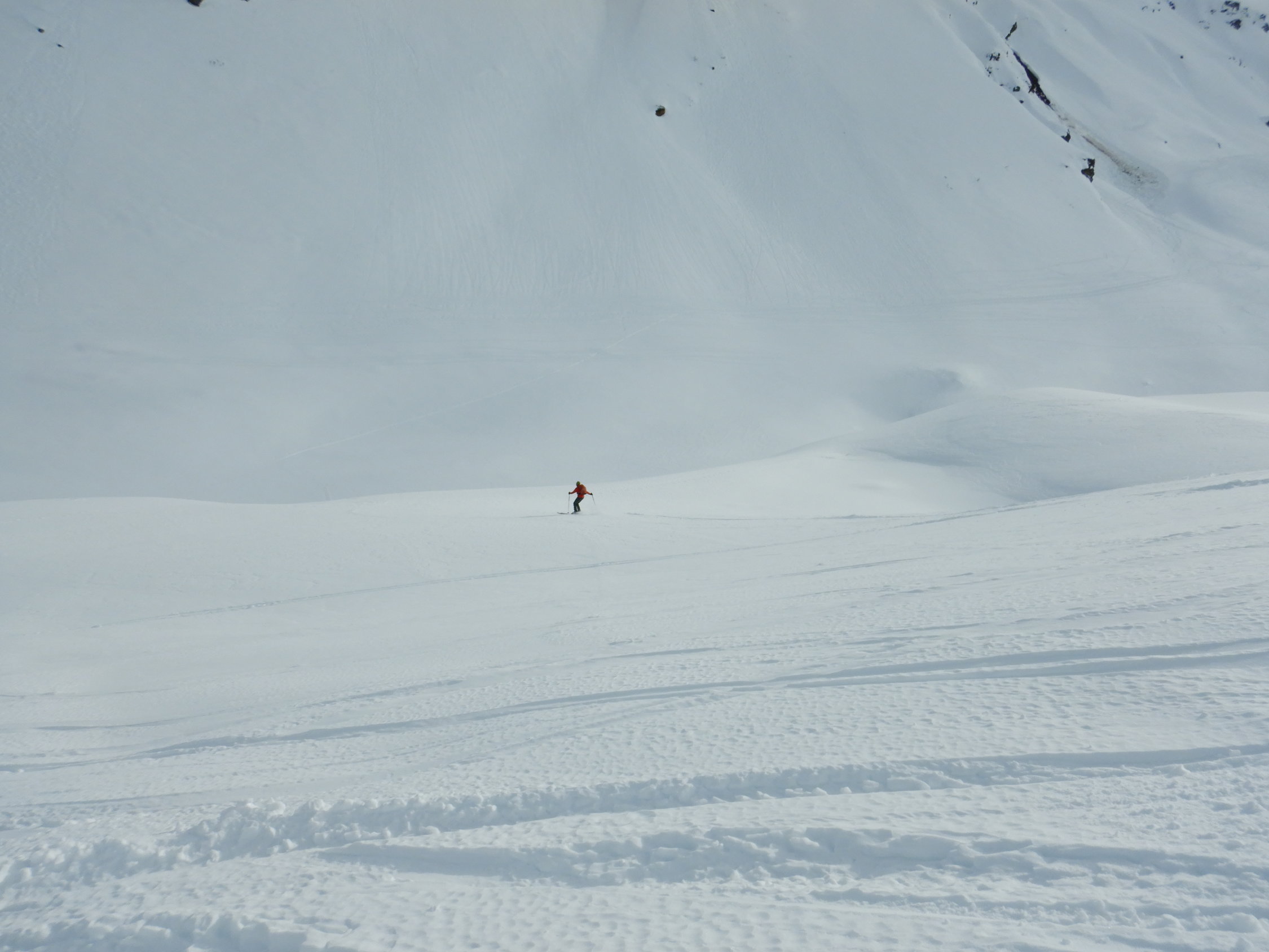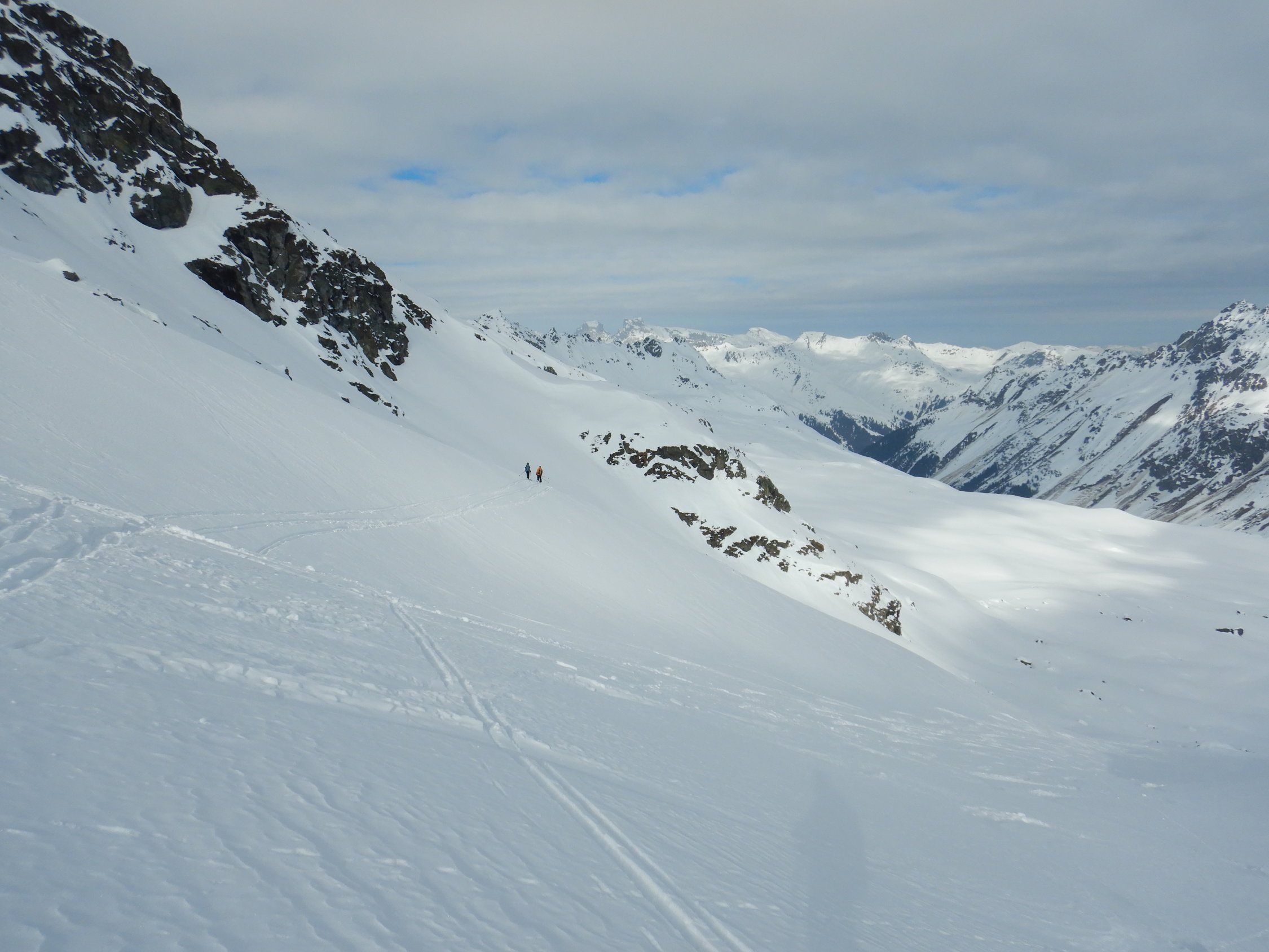 Dann Nordabfahrt direkt vom Gipfel über relativ steile Hänge ins Vergalda Tal. Der oberste Hang- Teil ist recht verspurt und windgepresst. Danach Pulverschnee, teils etwas gepresst aber toll zum fahren.
