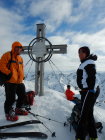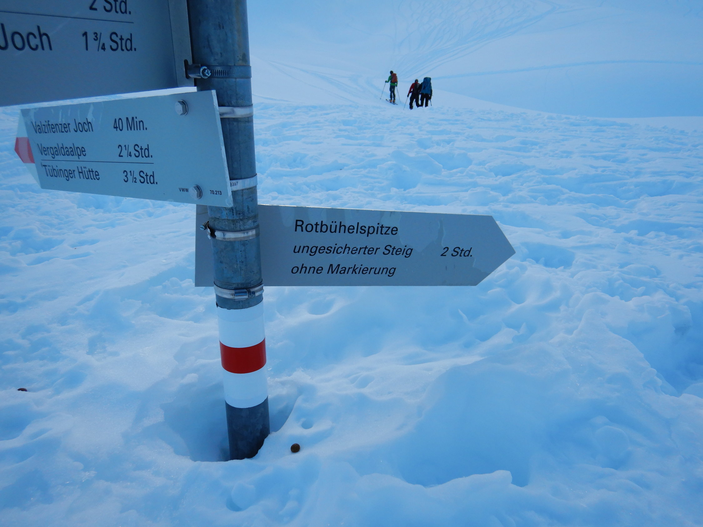 Start um 06:30 in Vergalda. Relativ einfacher Aufstieg über zum Teil etwas vereiste Spur vorbei an der Zollhütte zum Gipfel 2853m.