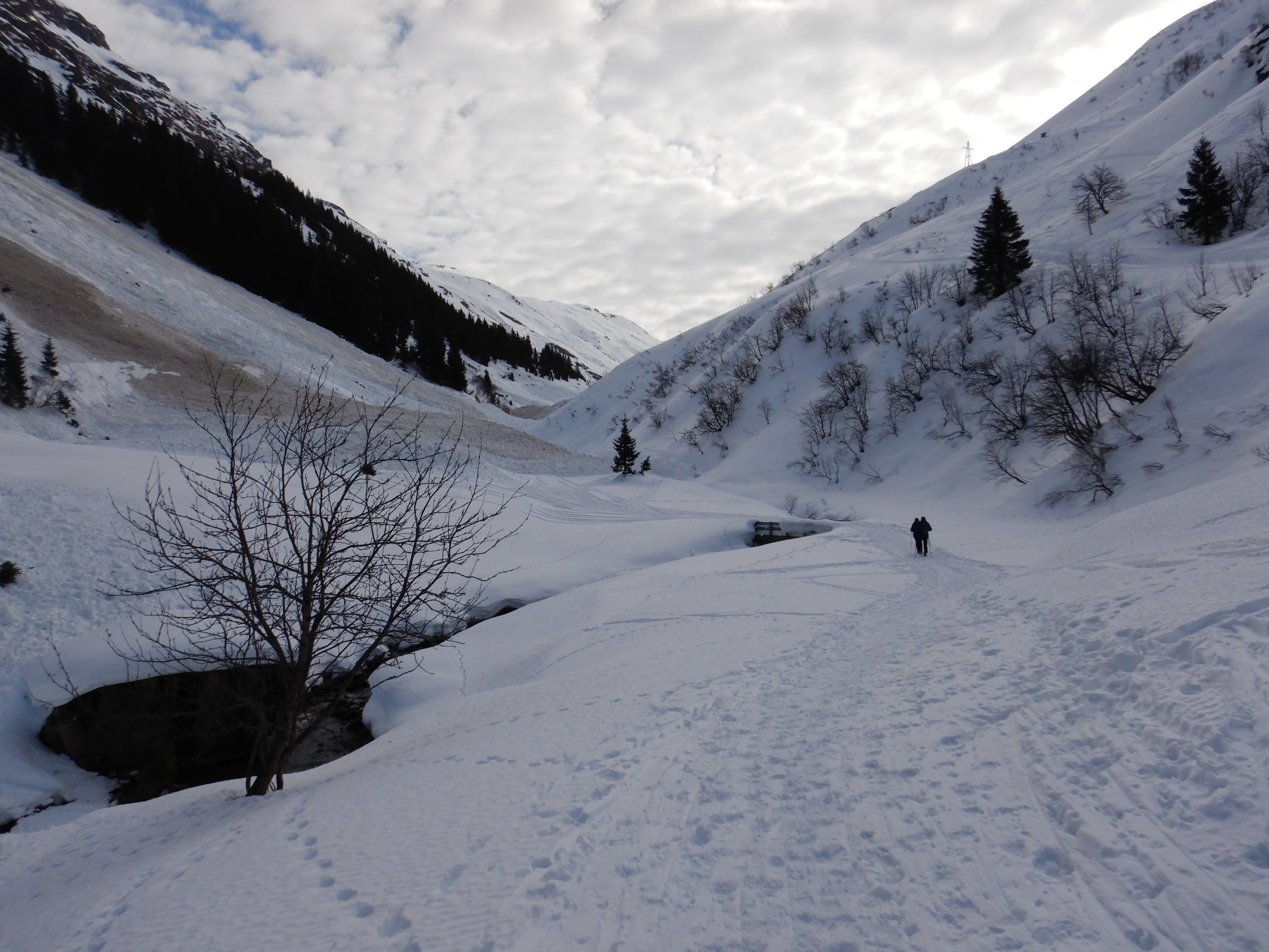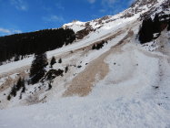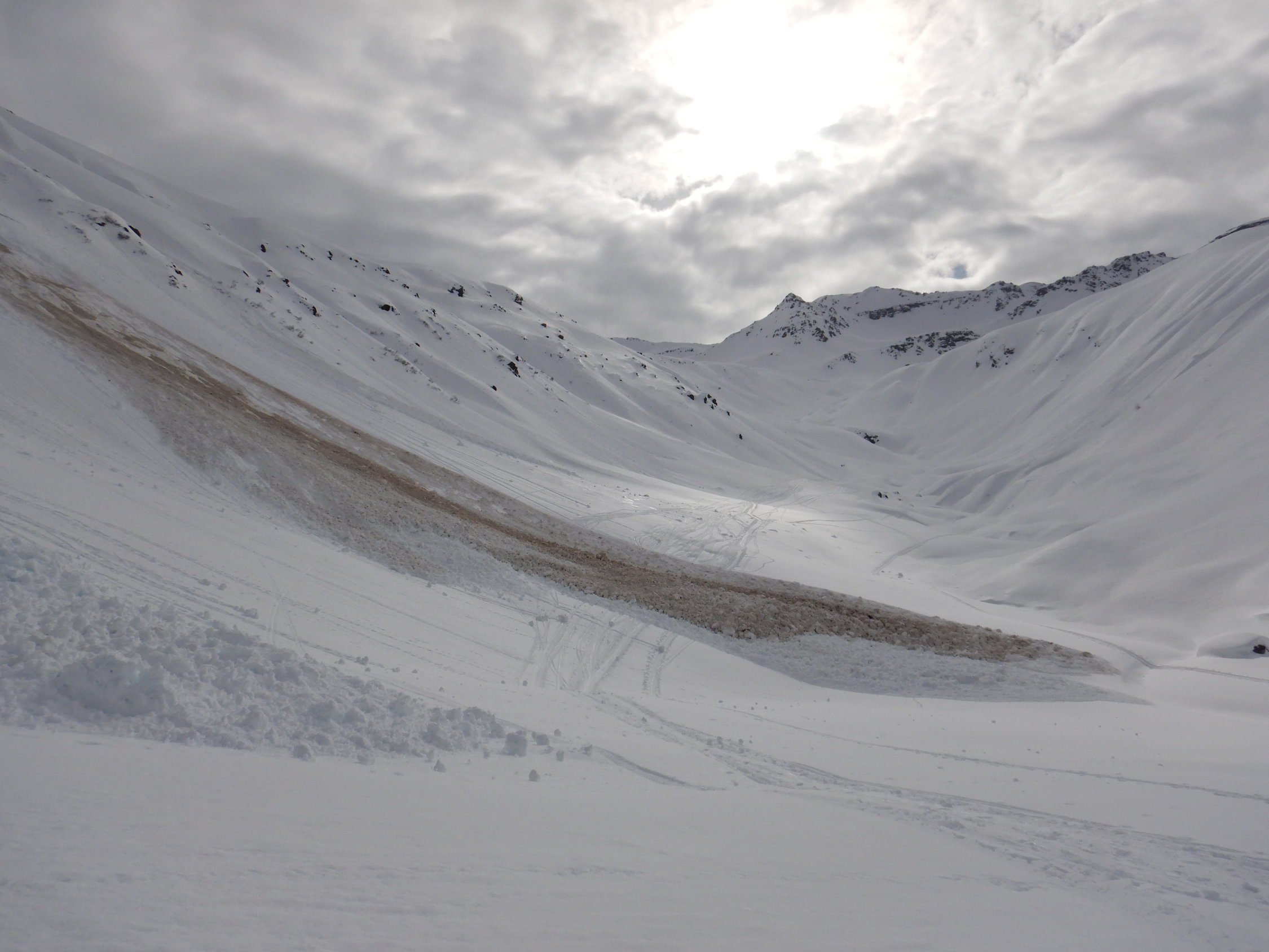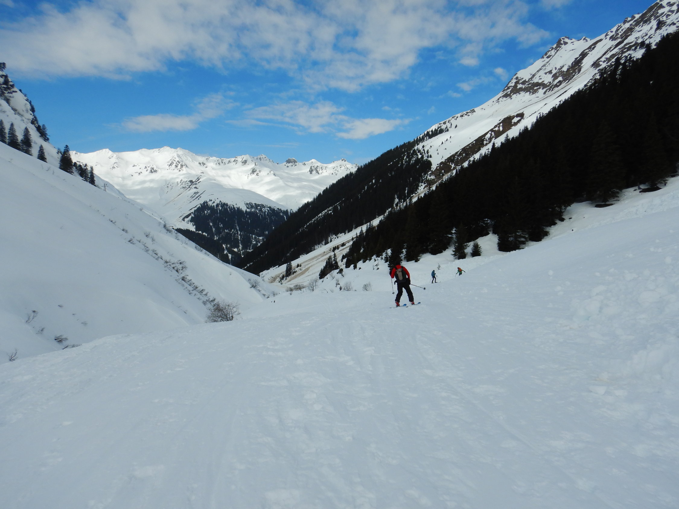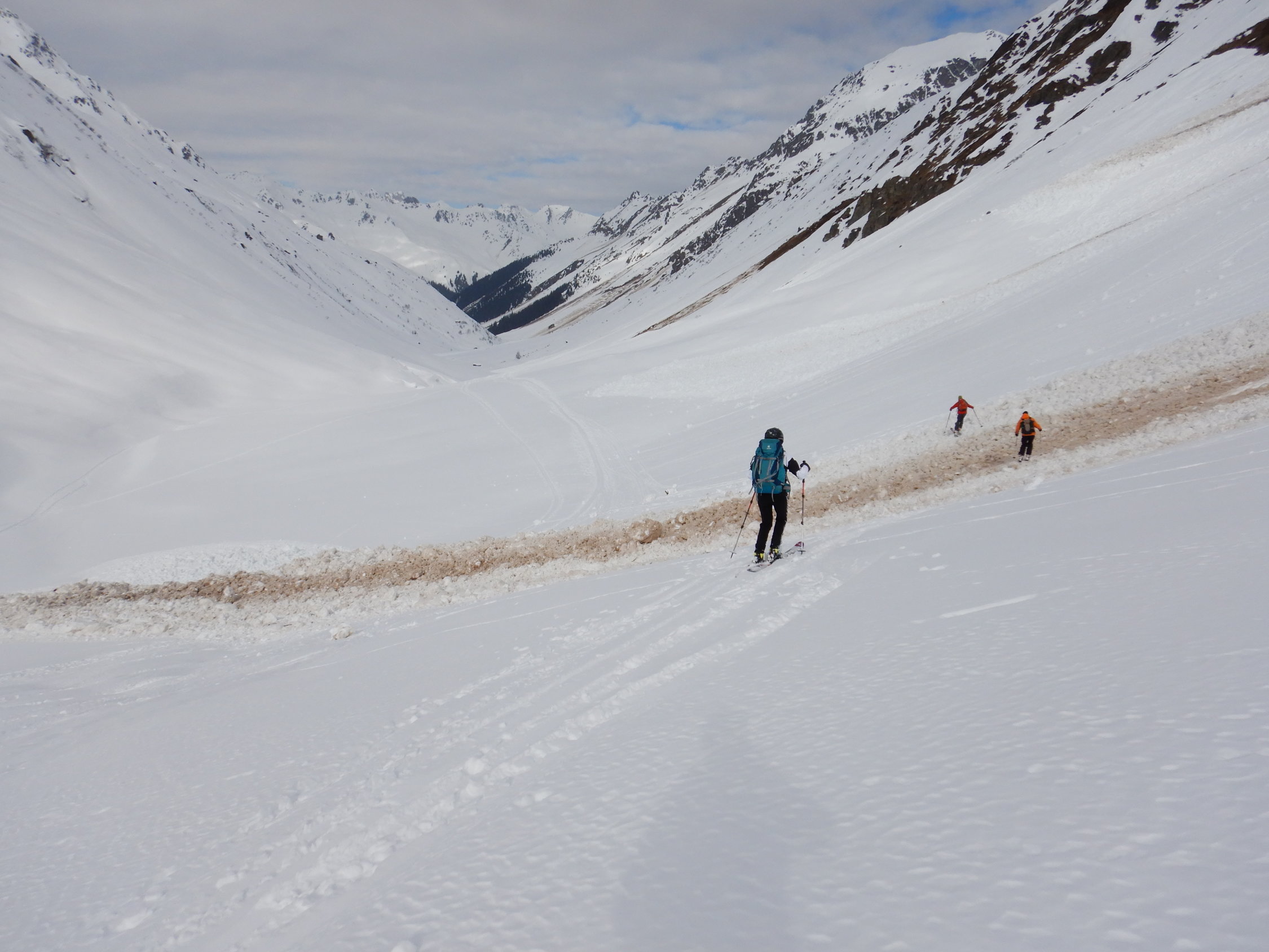 Im Vergalda Tal sind viele Gleitschneelawinen schon abgegangen, weitere können noch folgen. Deshalb früher Aufbruch empfohlen.