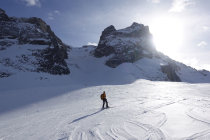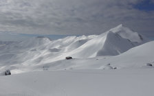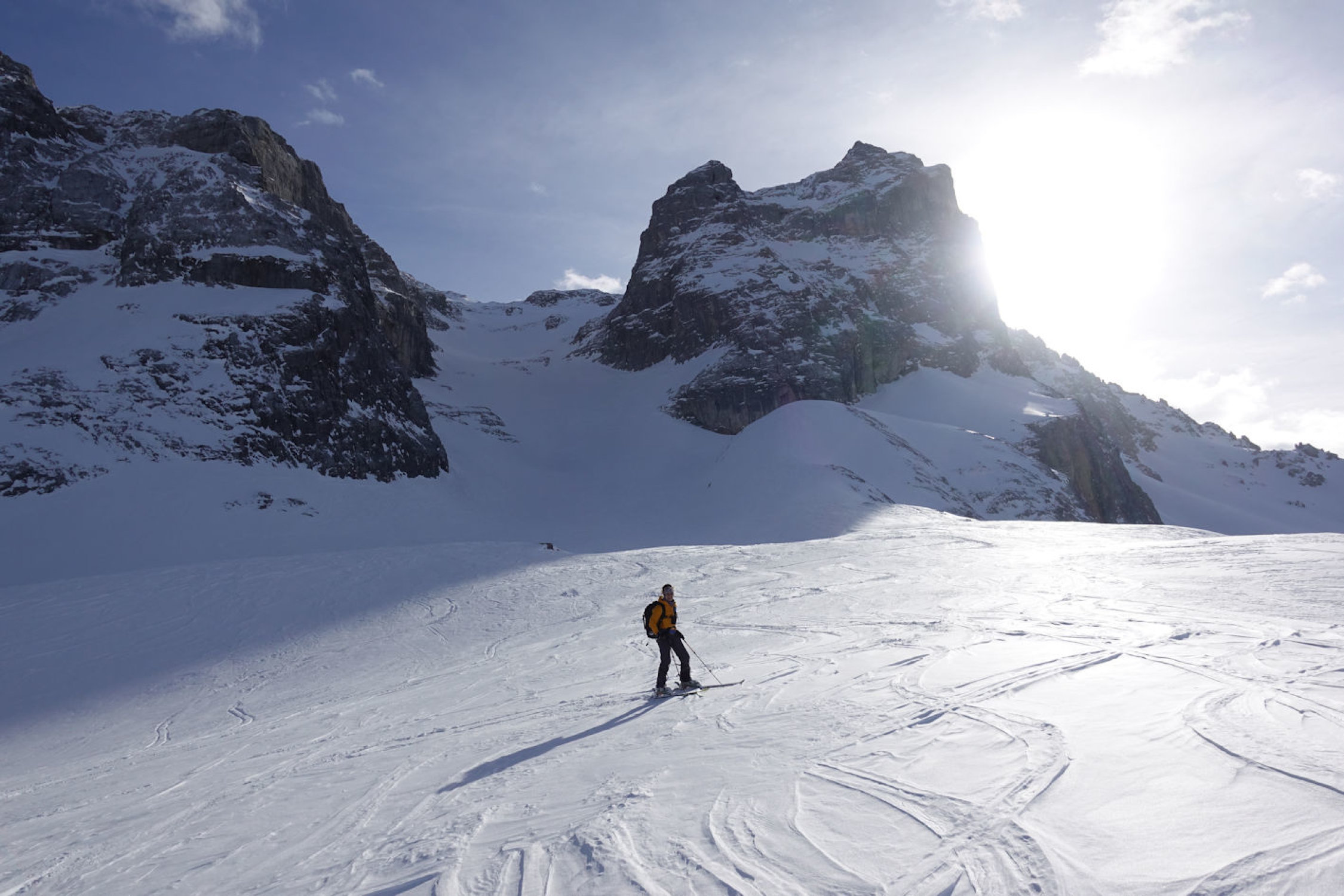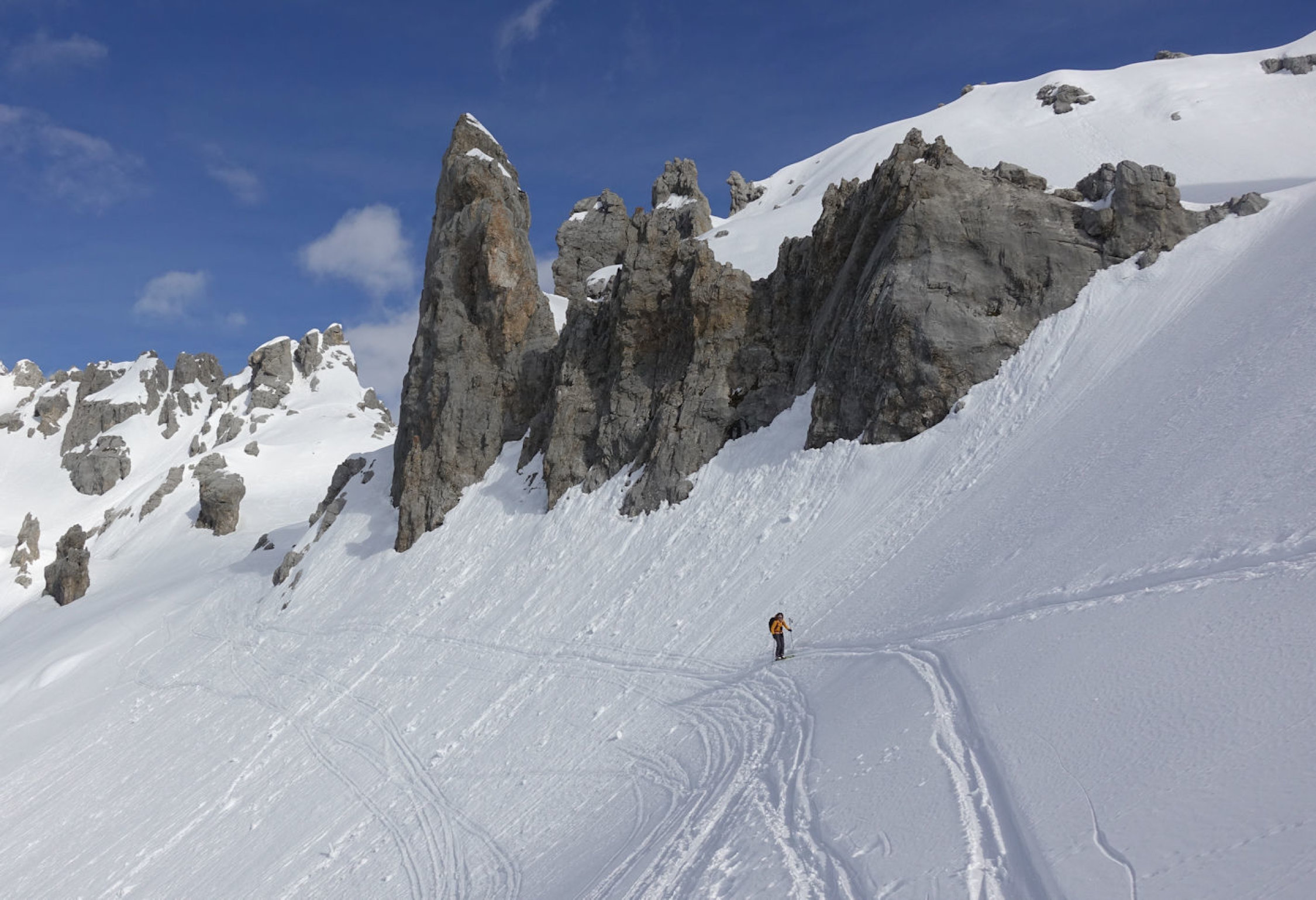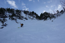 Alles gespurt. Spuren hier und da etwas glatt und rutschig, man hat aber eine große Auswahl. Nordseitig stark gesetzter, vielfach zerfahrener Schnee weiter unten auch gedeckelt. Südseitig an sonnenexponierten Hängen morgens gefroren später sulzig. Der Einstieg zum Gemstobel hat gute Trittstufen. Das letzte Stück der Abfahrt zurück zur Lindauer Hütte durch die Latschenzone ist etwas unangenehm. Vielleicht haben wir nicht die beste Rinne gefunden.