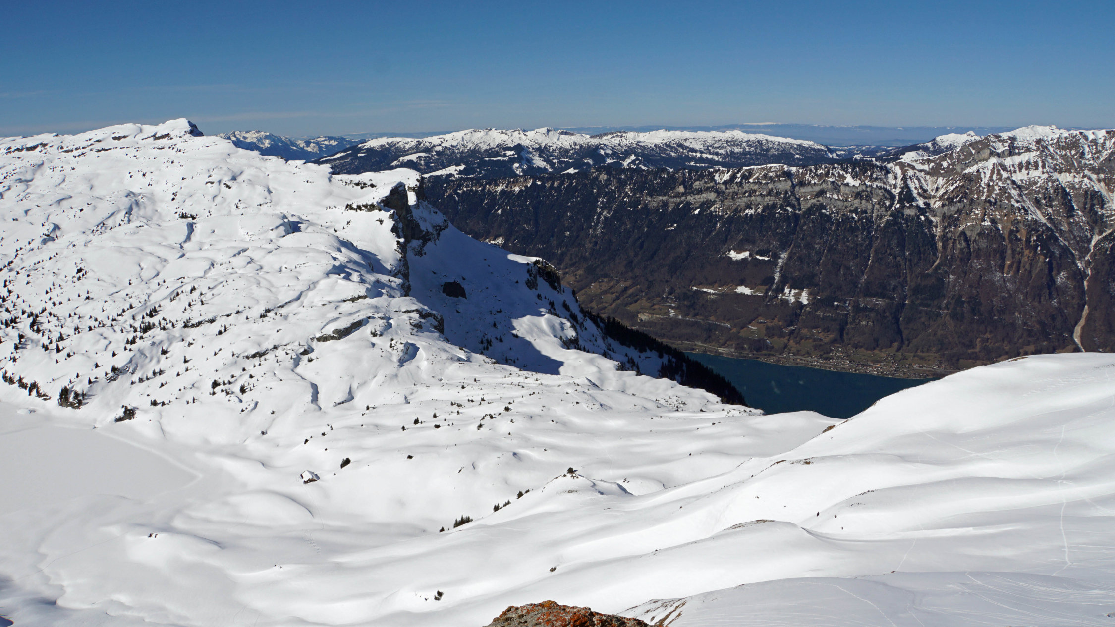 Sonnst eigentlich erstaunlich guter Pulverschnee in den Nordwesthängen des Schonegg. Letzterer diente sich noch an als kleiner Zugabe mit schöner Tiefblick auf Interlaken und einen schönen Abfahrt. Nur der Plangaugraben ist und bleibt seiner Rühm gerecht. Da muss man einfach durch. Alles bei allem eine wunderbare Tour in totaler Einsamkeit. In der Ferne habe ich 2 und 3 Tourenfahrer gesehen, sonst niemand.