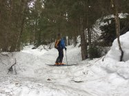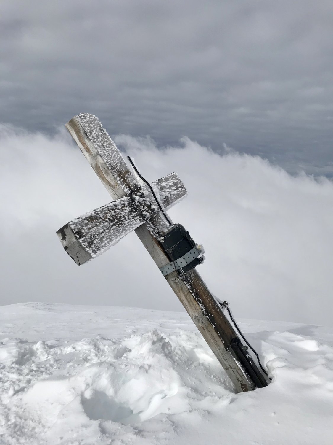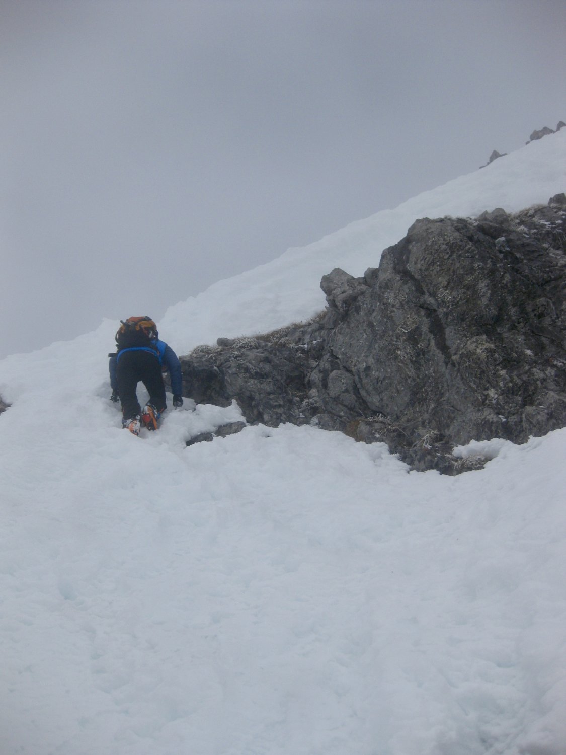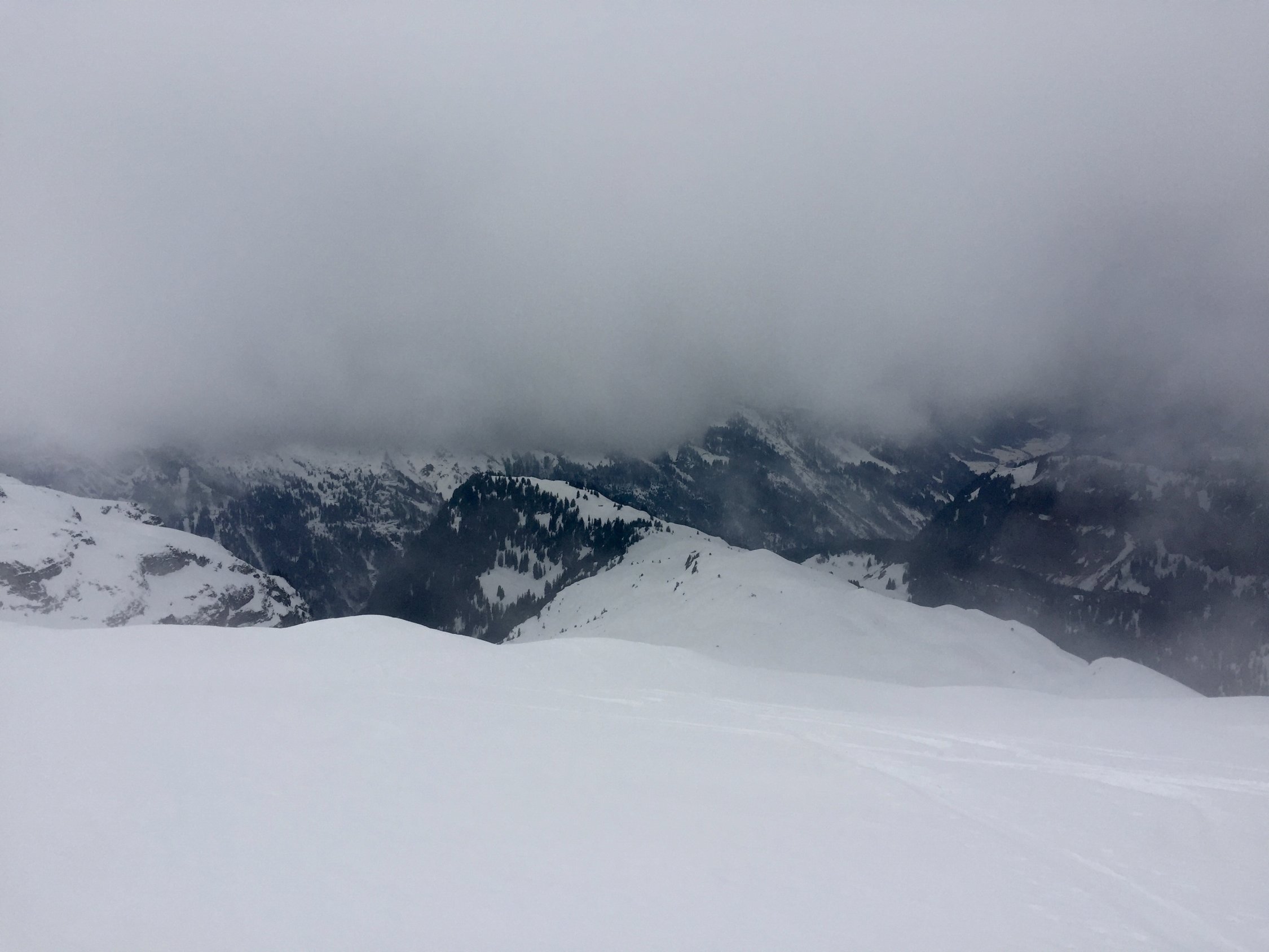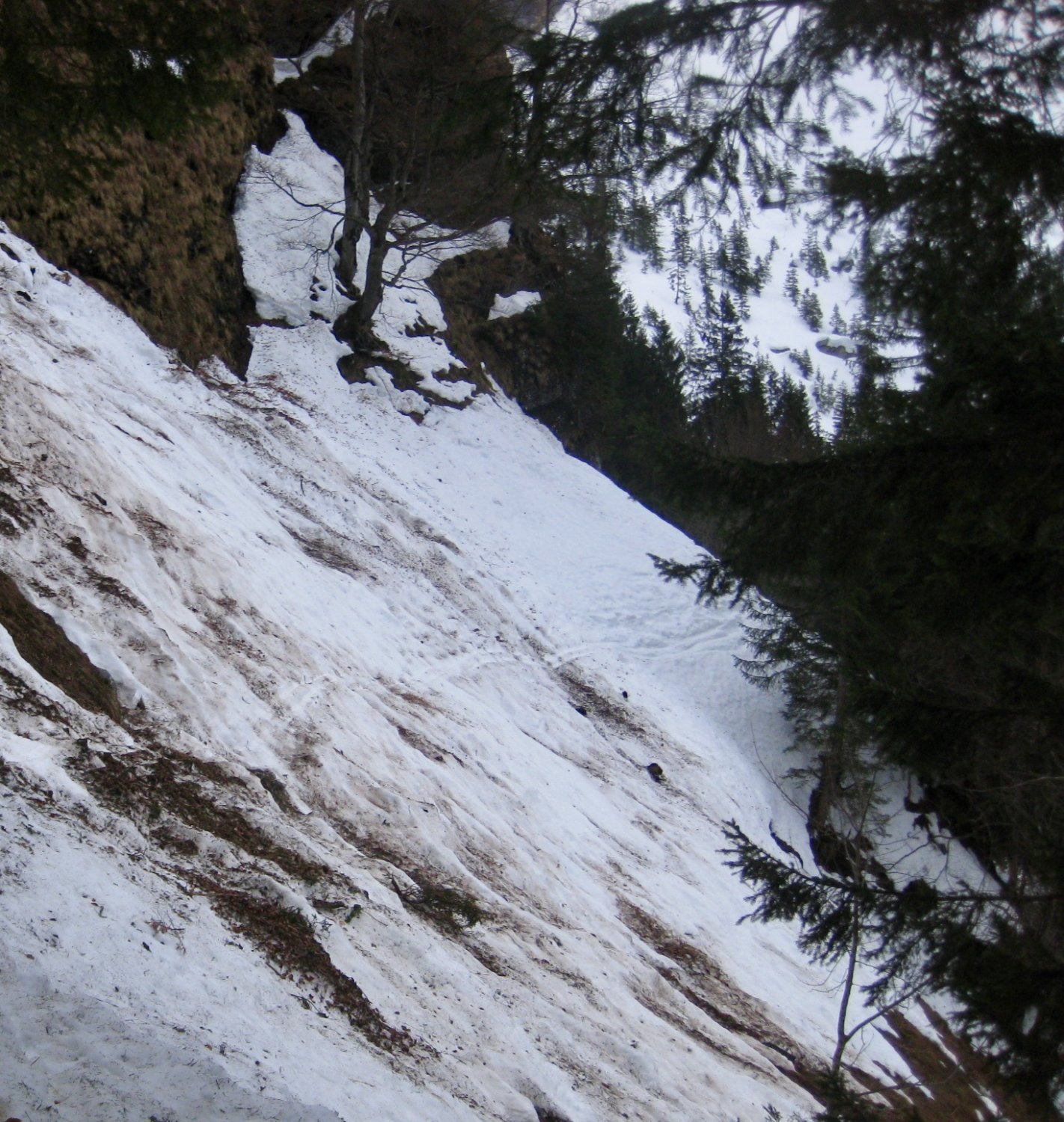 Bis zur Waldgrenze ist der Schnee nass und tief. Einige steile Grashänge sind schon abgerutscht. Ab 1600 Meter war es heute neblig mit leichtem Schneefall. Dank GPS und alten Spuren haben wir das Skidepot dennoch einigermassen problemlos gefunden. Fussaufstieg auf den Gipfel gut ausgetreten, Steigeisen sind dennoch ratsam. Bei der ersten Steilstufe ist der Schnee in der Wärme der letzten Tage etwas ins Rutschen geraten, heute war alles wieder gefroren. Bei Wärme könnte diese Stelle aber heikel werden. Auf dem Gipfel zeigte sich plötzlich die Sonne. Abfahrt wieder teilweise im Nebel. Schöner Schnee bis zur Waldgrenze. Ab dort blieben die Ski stellenweise fast kleben.