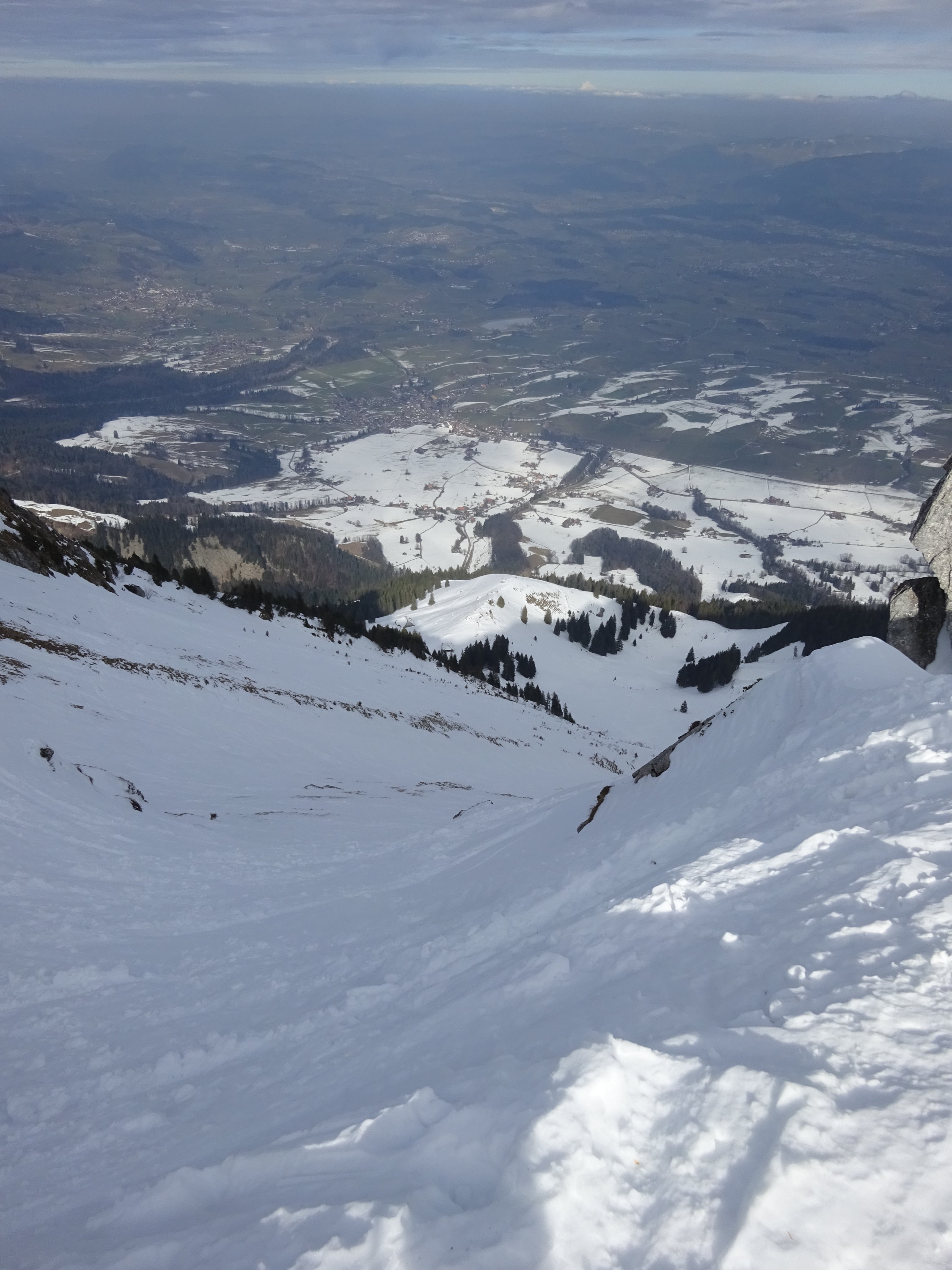 Der schöne Pulverschnee hat hier seine Leichtigkeit verloren. Er ist schwer geworden und beliebte sich an den Fellen festzusetzen, was in diesem steilen Gelände nicht unbedingt sein müsste. Unterhalb ca. 1400m Nassschnee, der infolge fehlender Abstrahlung in der bedeckten Nacht nicht gefroren war, aber dank der Nordexposition immerhin tragfähig blieb.