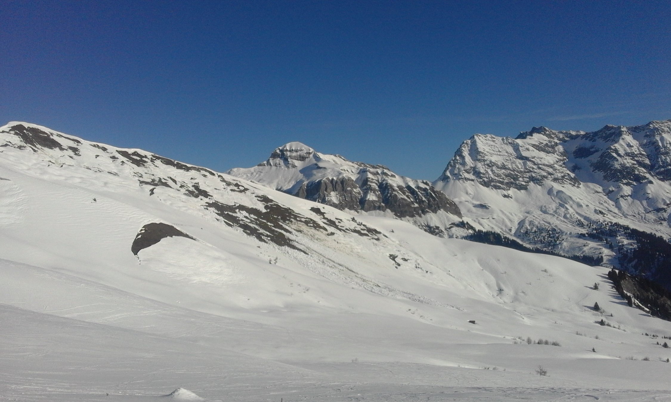 nicht zu spät in die Südhänge, ist noch viel Schnee in Bewegung -> im Südhang oberhalb Frumaschan wie auch unterhalb der Lawinenverbauungen.